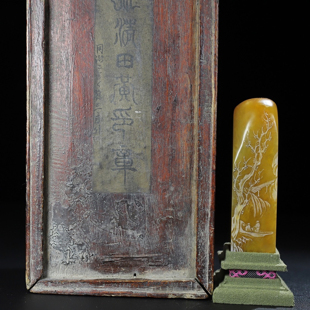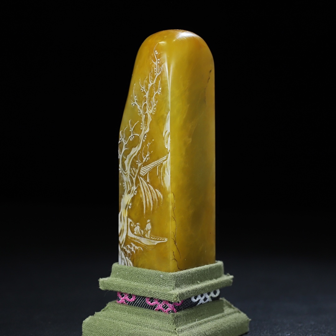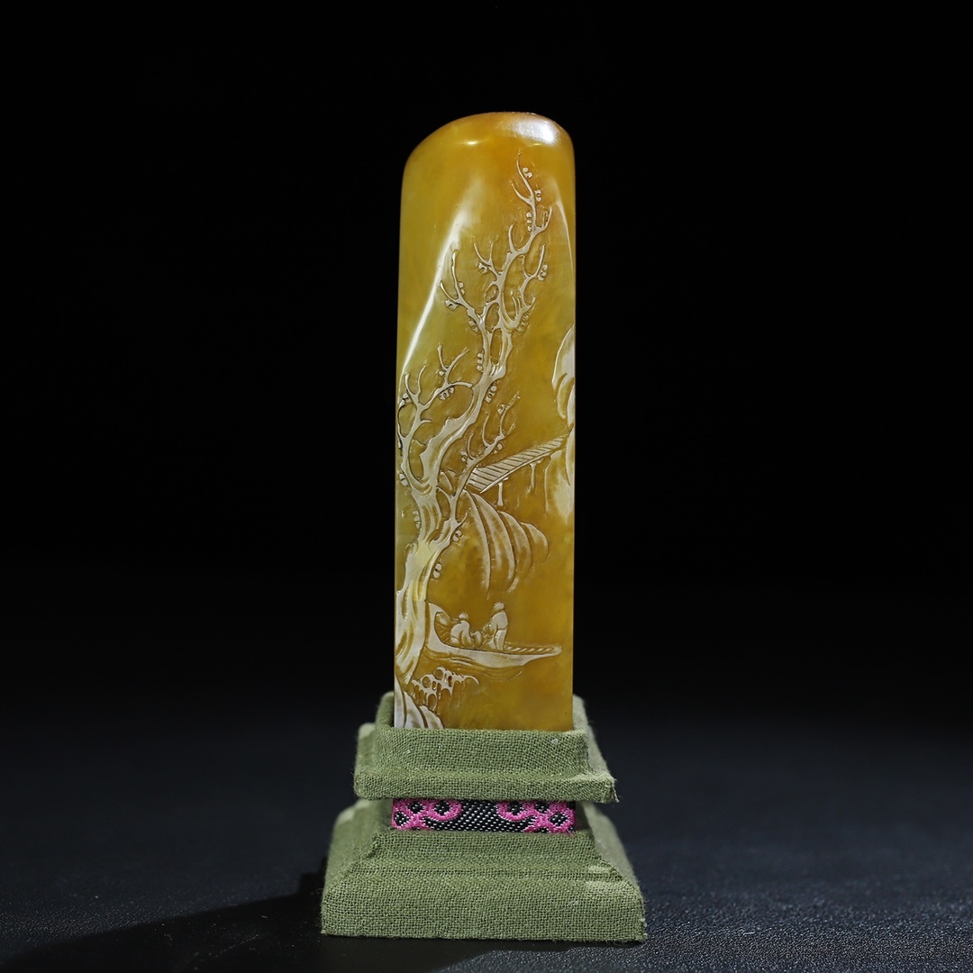 *珍品旧蔵* 【清代篆刻家 徐三庚】 寿山石 《泛舟訪友》山水人物紋 薄意印章 天然石 手彫 篆刻 古印材 極細工 中国古玩 骨董品 古美味 H48