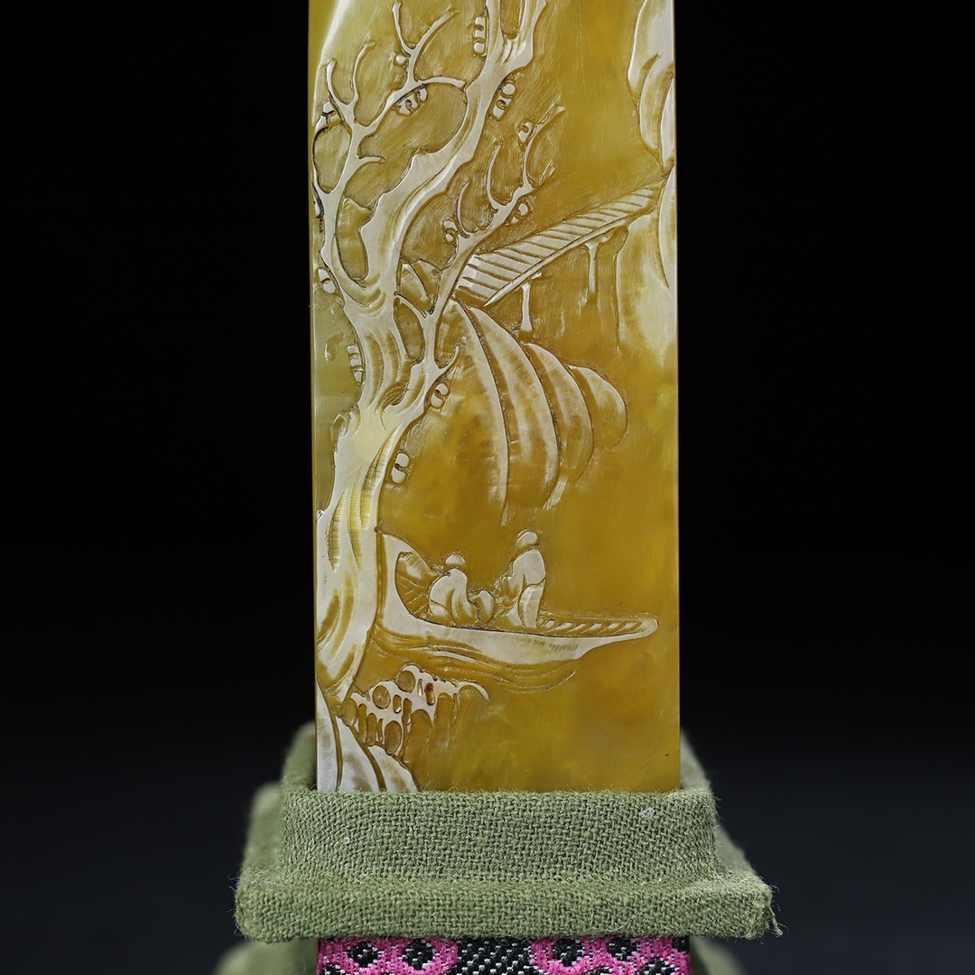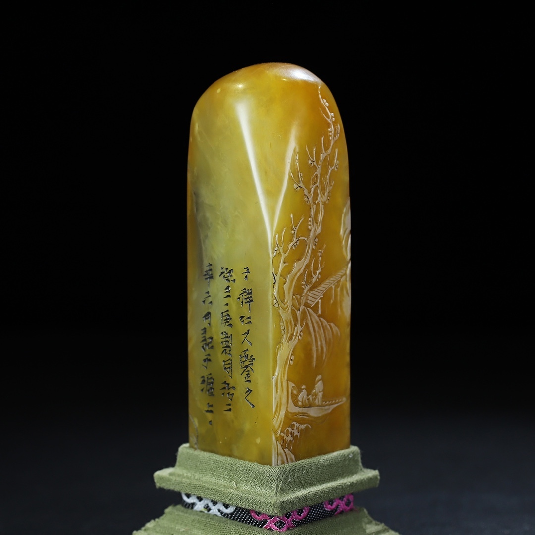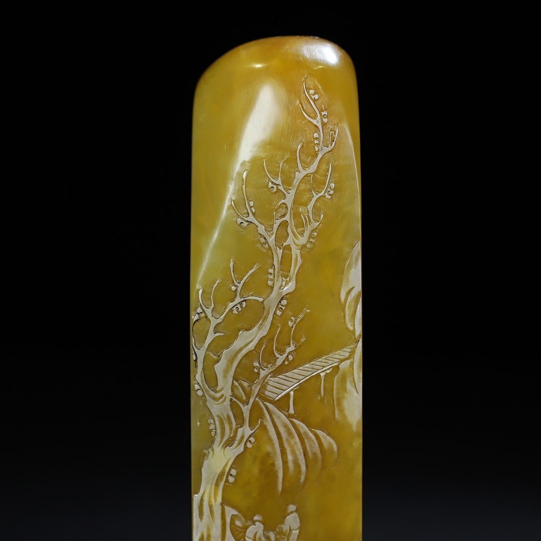 *珍品旧蔵* 【清代篆刻家 徐三庚】 寿山石 《泛舟訪友》山水人物紋 薄意印章 天然石 手彫 篆刻 古印材 極細工 中国古玩 骨董品 古美味 H48