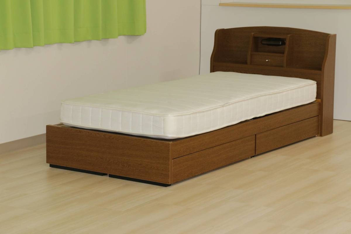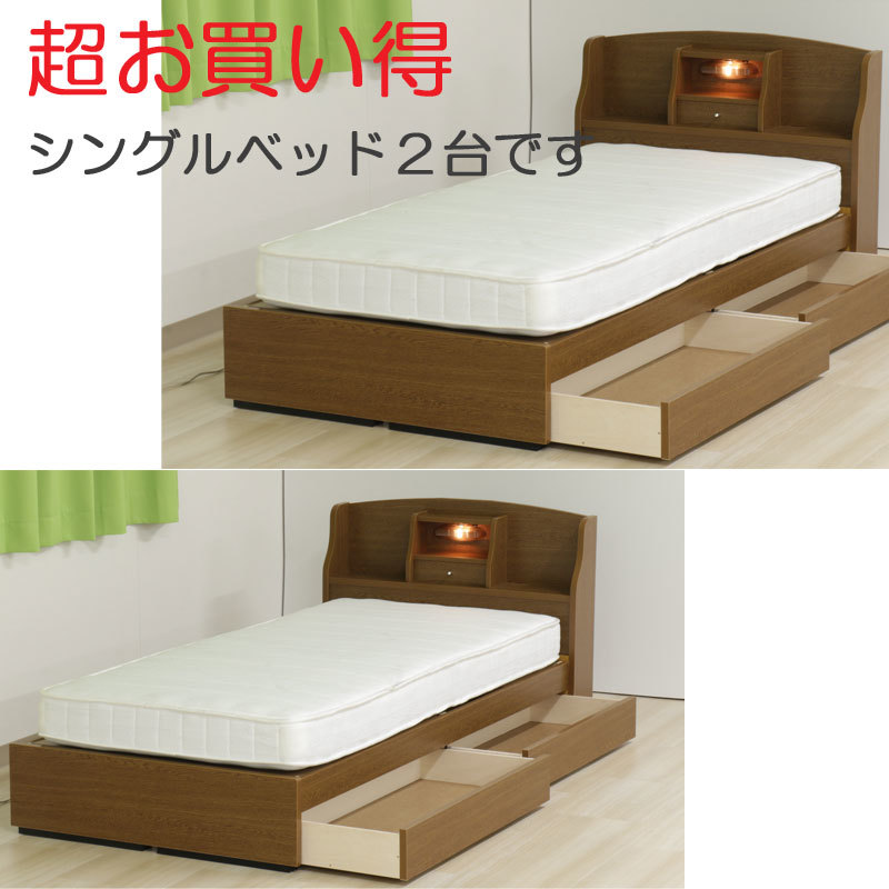 2本セット送料無料で激安 棚照明引出付収納シングルベッド  ポケットコイルマットレス付き