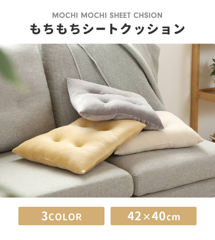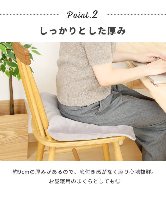 | ふわふわもちもちな触り心地が気持ちいいシートクッション。 滑らかな肌触りでずっと触っていたくなる気持ちよさ。 しっかりとした厚みがあるので、底付き感がなく、座り心地◎ |