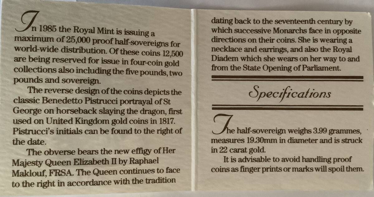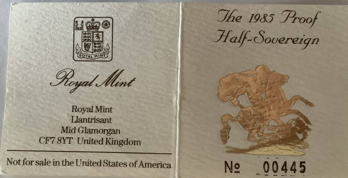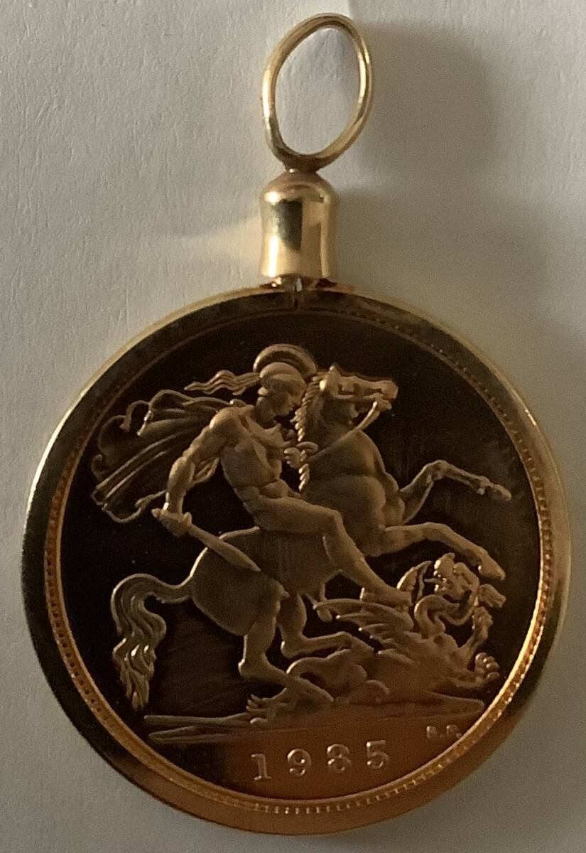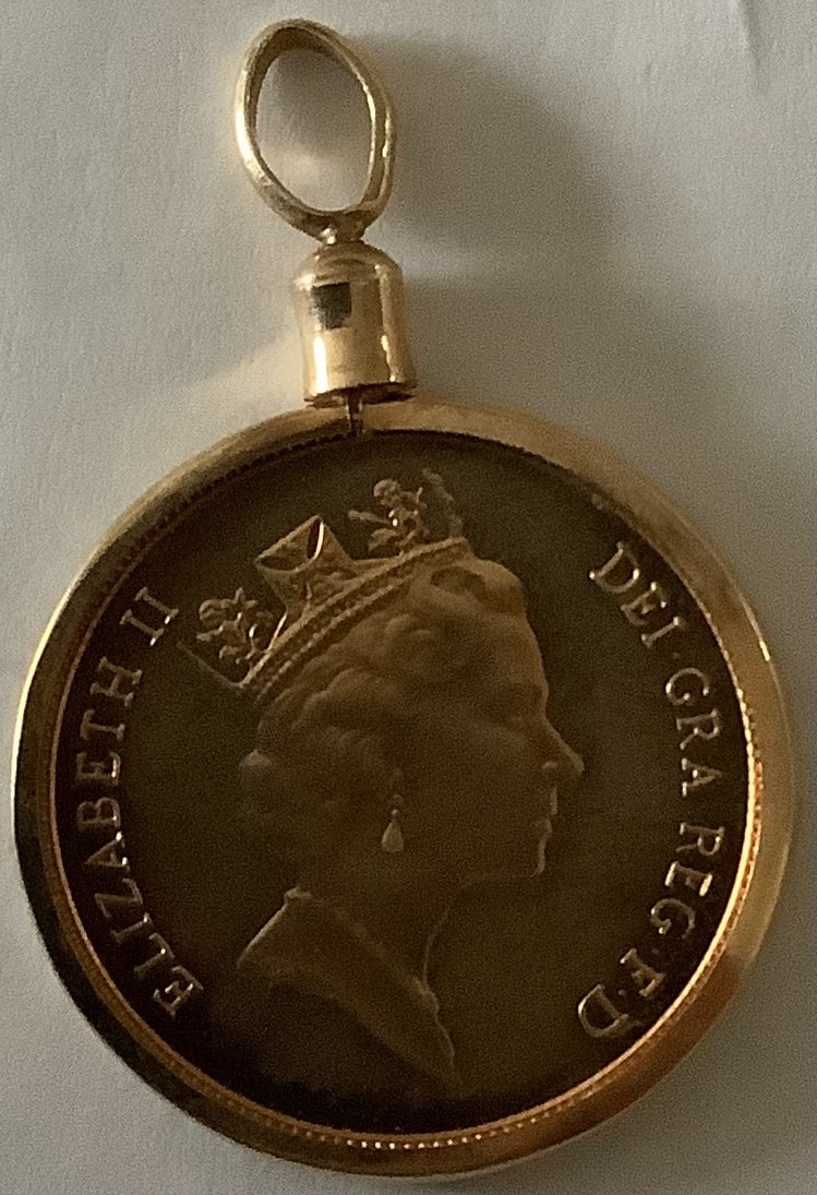 1985年限定発行された2分の1ソブリン金貨入りペンダントトップ、未使用品。通し番号ある保証書つき。これが最後の一品となりました。