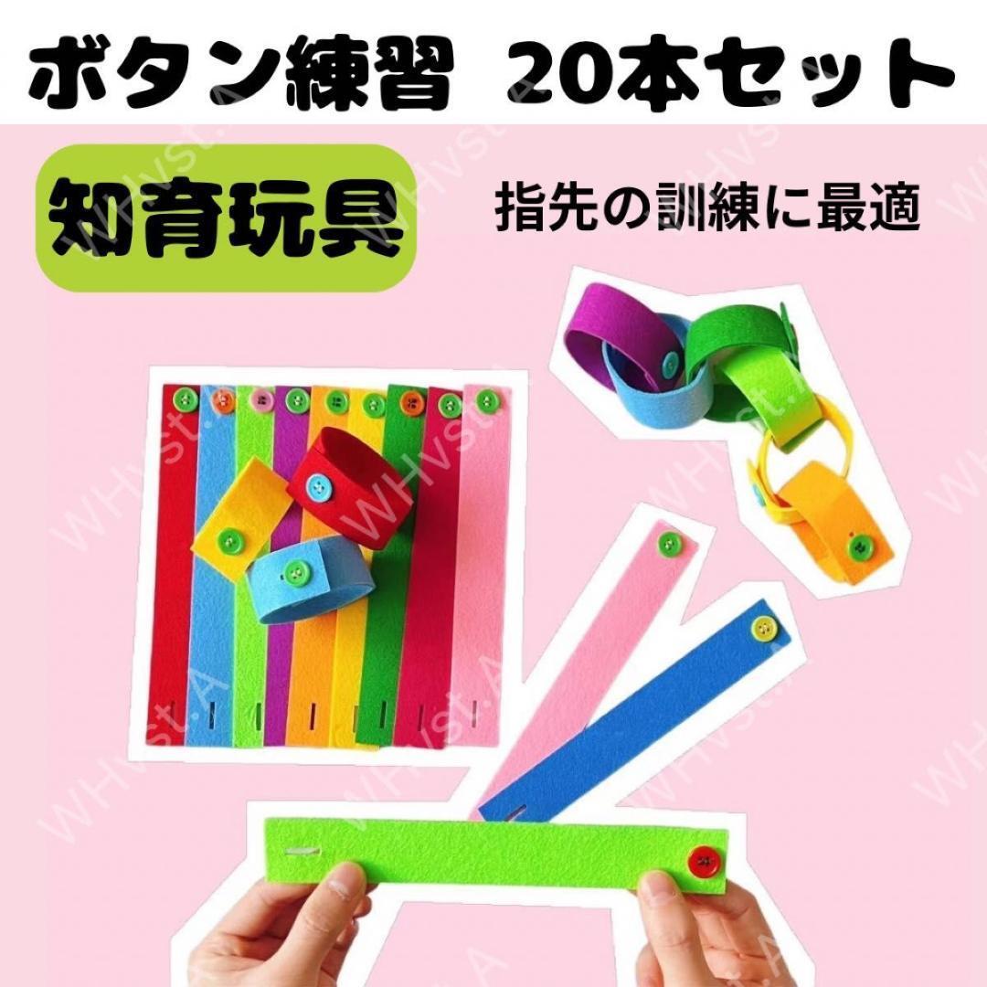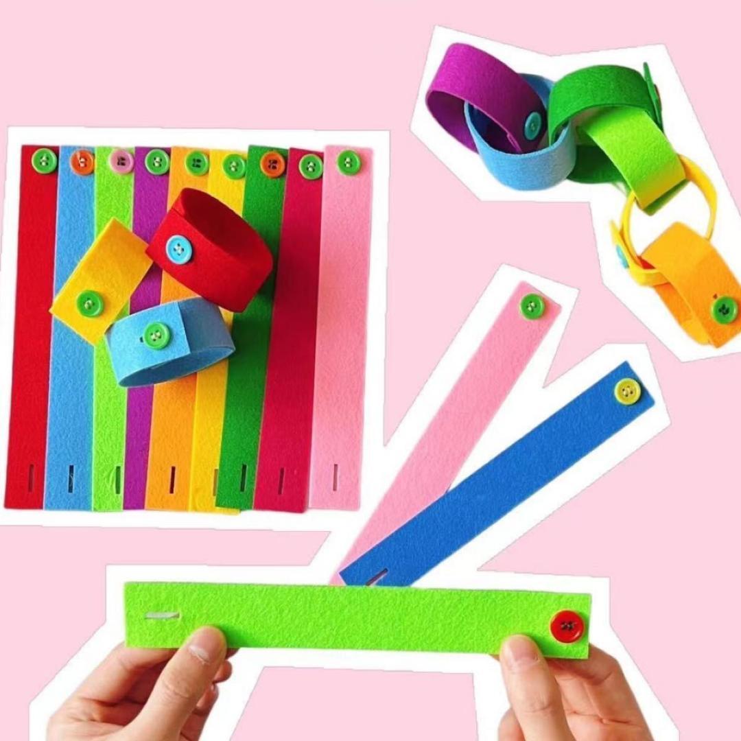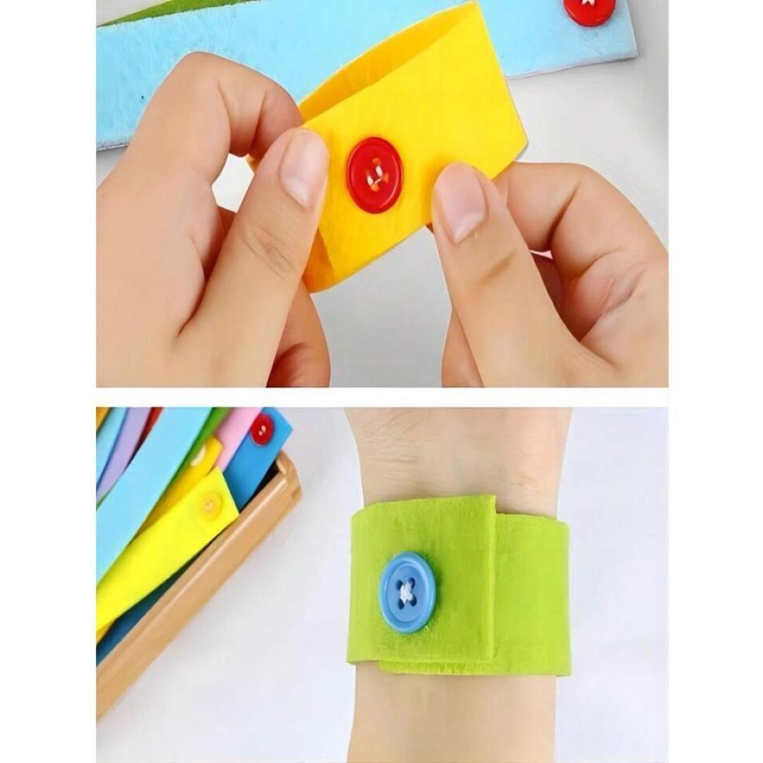 カラフルなフェルトストラップに大小さまざまなボタンを縫い付けた、指先の発達を促す知育アイテムです。木製トレイに整然と並べられたストラップは、色彩感覚と集中力を養いながら、ボタンの留め外しを繰り返し練習できます。
