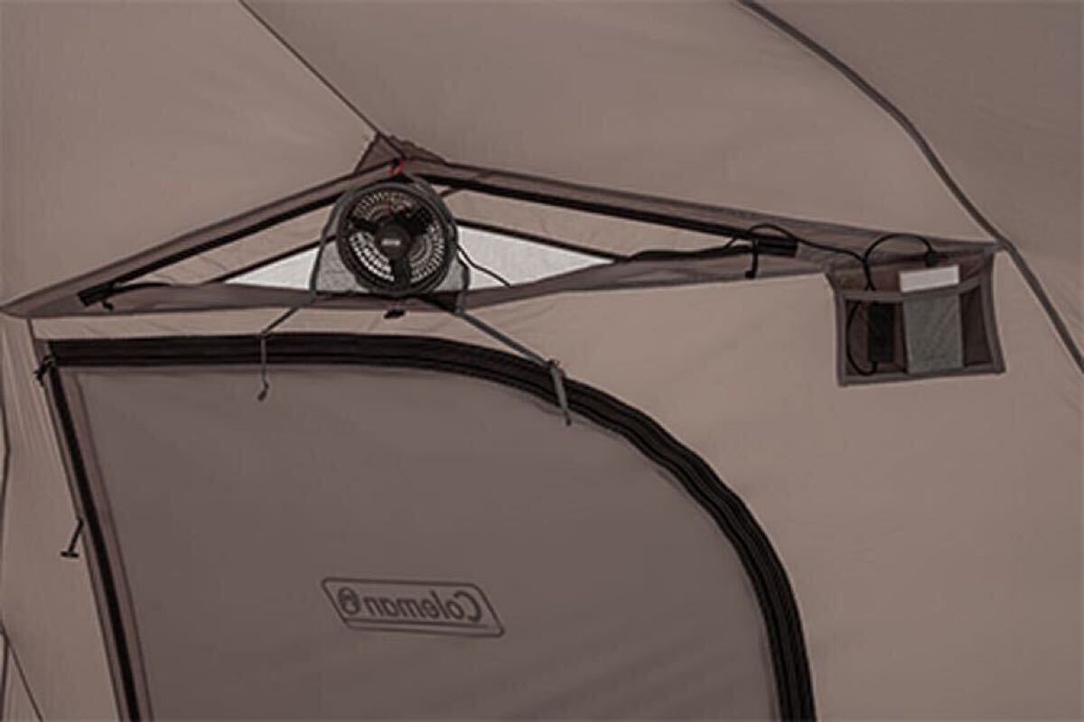フロントに配置されたポールにより、リビング空間の拡大と耐風強度アップを実現。リビング両サイドはファスナーの開閉が楽なDドアスタイルとなっており出入りがスムーズにできます。「リバーシブルファンベンチレーション」が取り付け可能で、進化したアドバンスドサークルベンチレーションシステムによりテント内部の換気性能を高め、またルーフフライ&フルスカート装備により春秋の肌寒い季節のキャンプにも対応します。