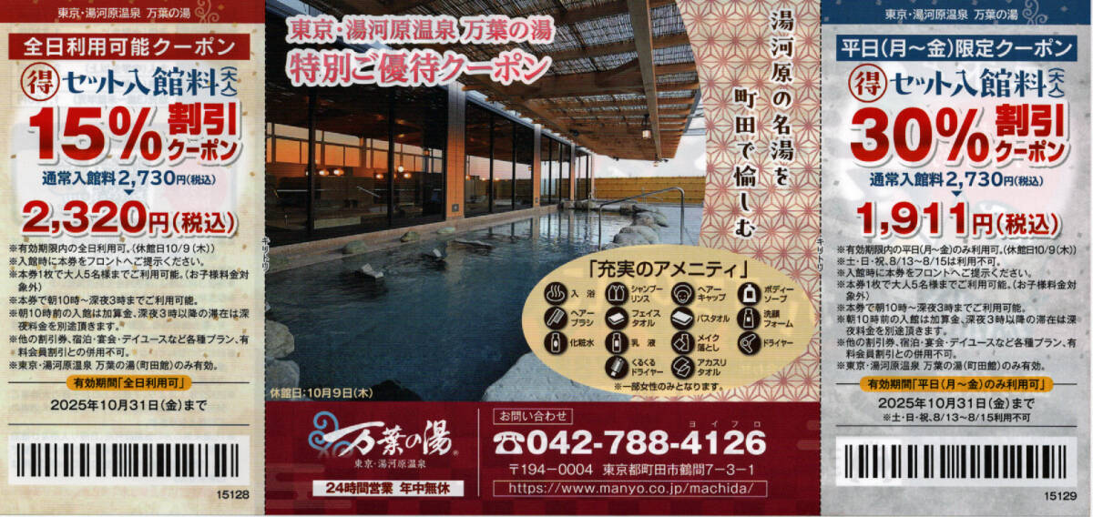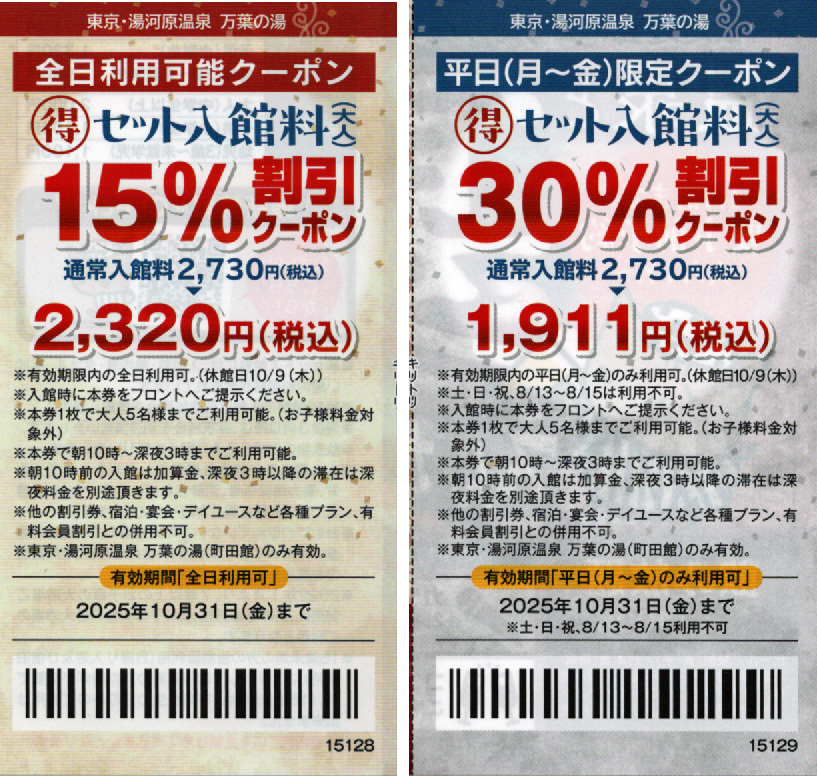商品名 | 東京・湯河原温泉 万葉の湯 〇得セット入館料(大人)全日15%と平日30%割引クーポン3枚セット |