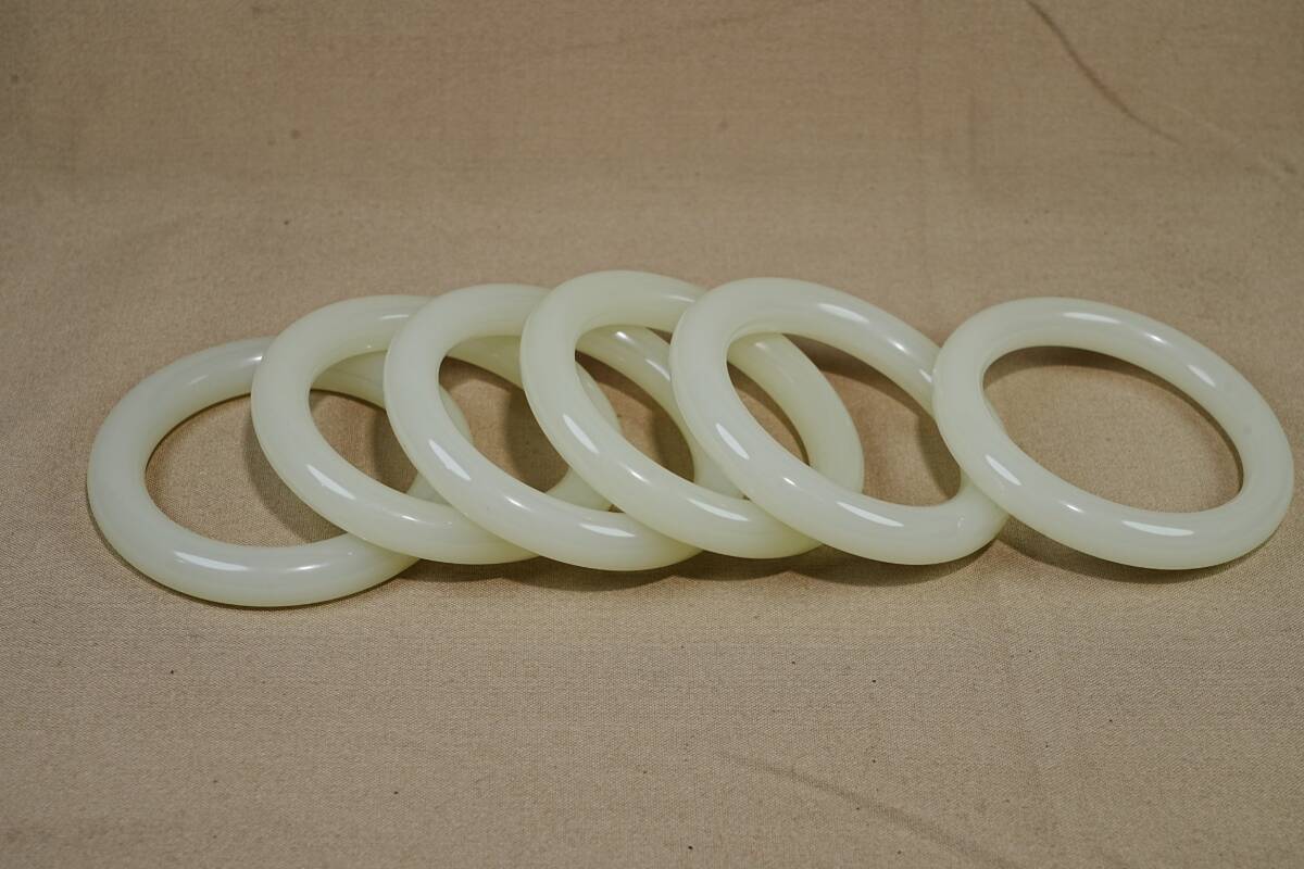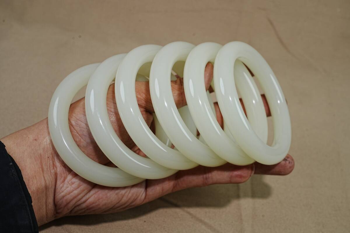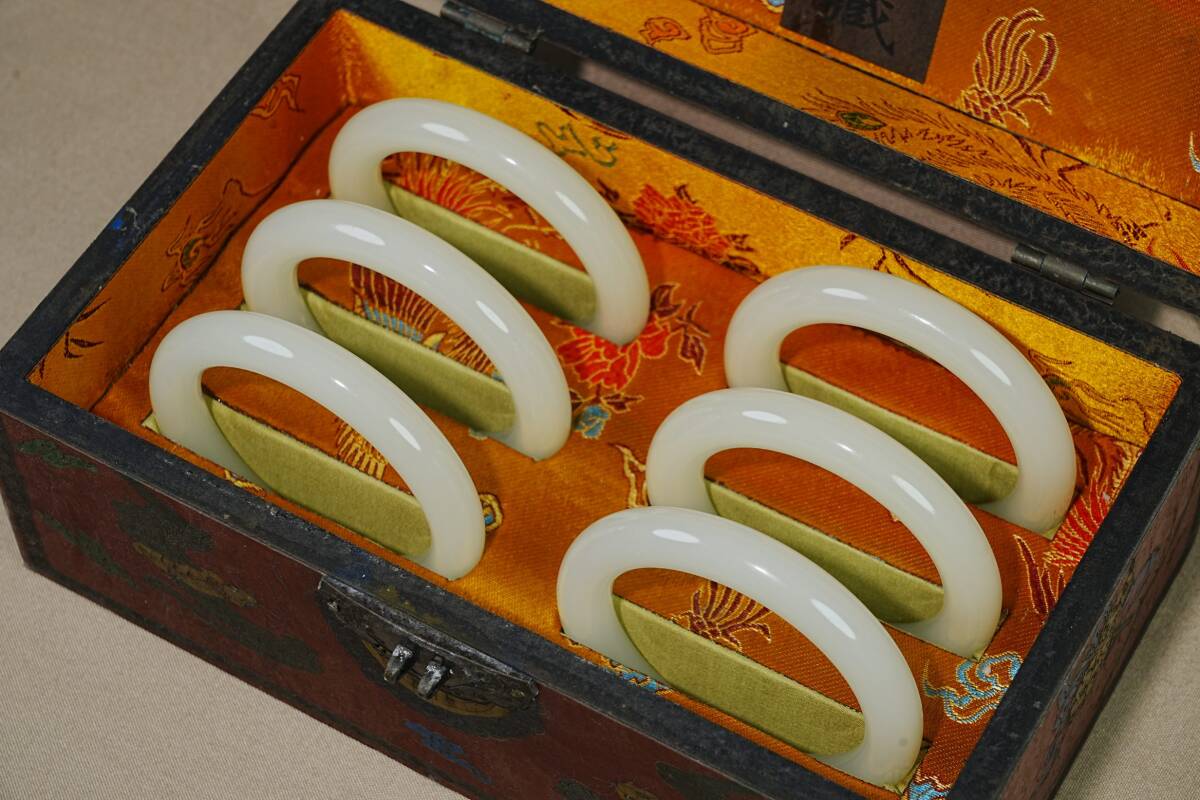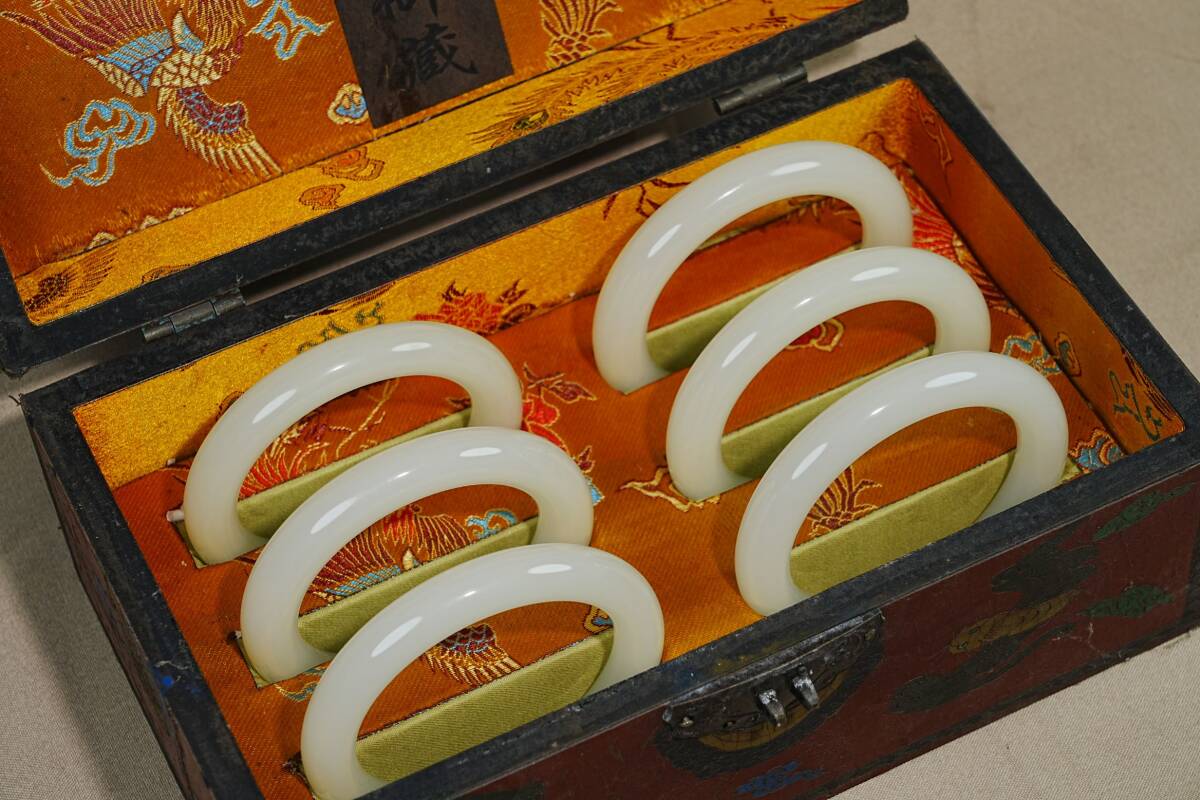 清 宮廷御製 古和田玉彫 白玉 腕輪 6支 套裝 玉石 玉器 箱付 文案 置物 時代物 古董品 骨董 旧家蔵出し 唐物 中国古玩 古美術品
