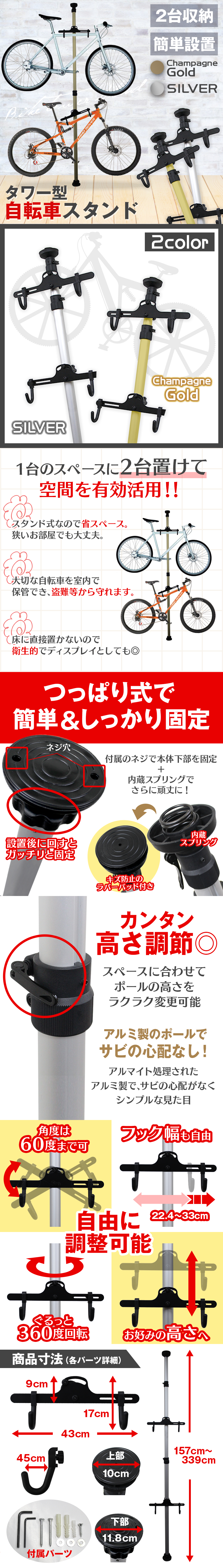 タワー型自転車スタンド!! 天井ツッパリ式で、天井高さ157cmから339cmまで設置可能、本体をしっかり支えます。 上段フックと下段フックの高さや幅、角度を自由に調整できます。 取付け、取外しも簡単です。 自転車を室内で保管するようになりますので、盗難などの心配や雨、風にさらされることなく、大切な自転車をしっかり守ります♪ 【商品仕様】 ・サイズ(約):幅430mm×高さ1570~3390mm×奥行き195mm(フック取り付け済み) ・重量(約):ポール 3.6kg / 自転車フック部 各0.7kg ・耐荷重:25kg ・カラー:シルバー ・設置可能・天井高:1570~3390mm ・素材:アルミニウム ・搭載可能自転車:20kg以下の自転車 【商品内容】 ・ポール(フック取り付け部ネジ×4) ・ポール上部フタ ・自転車フック部 ×2 ・六角レンチ(大) ・六角レンチ(小) ・床固定ネジ ×3 【取り付け方】 ・1.ポール上部のバネの上にフタを置きます。 ・2.2つのレバーを緩めます。 ・3.1段目ポールを伸ばし、レバーを締めます。 ・4.2段目ポールも天井まで伸ばし、レバーを締めます。 ・5.1段目ポールと2段目ポールのネジを締めます。 ・6.下部のダイヤルを左に回しテンションをかけます。 ・7.しっかり固定されているか確認をしてください。 ・8.フック部を組み立てます。 ・9.フック部をポールに固定します。 ・10.各部ネジを緩めると、可動範囲内で動かせます。 ・11.完成 【注意事項】 ・輸入品の為、本体にキズ、汚れ、箱潰れがある場合がございますが、新品商品です。 ・仕様・デザインは改良のため予告なく変更することがあります。 |