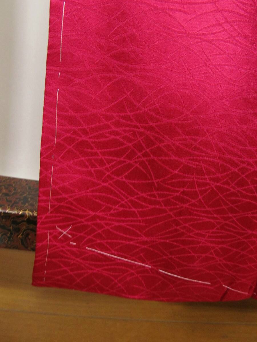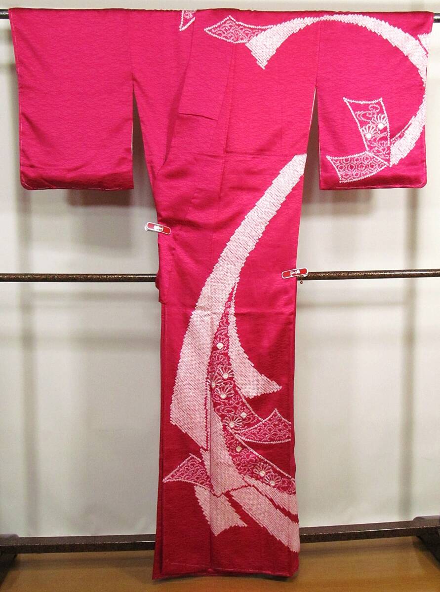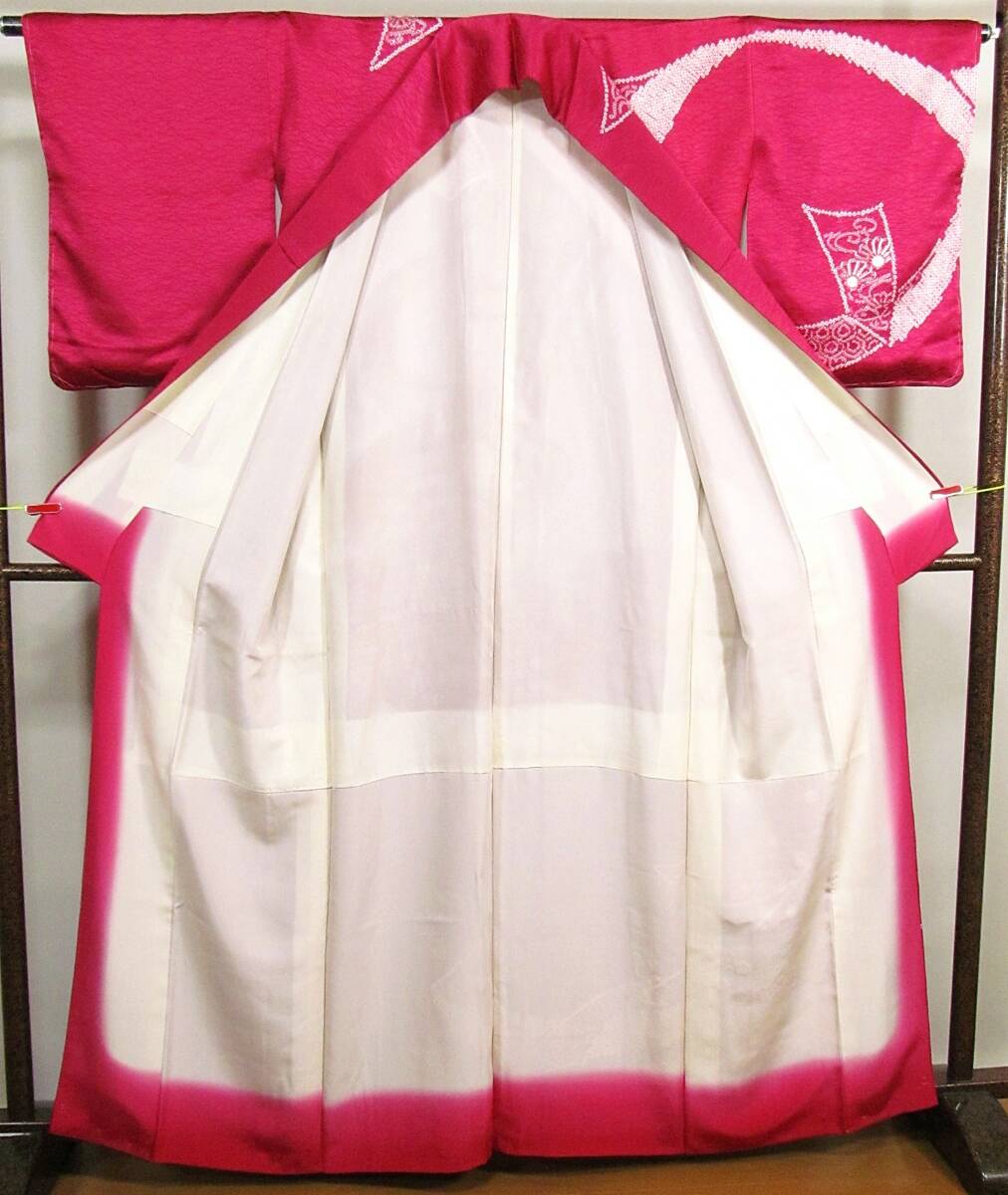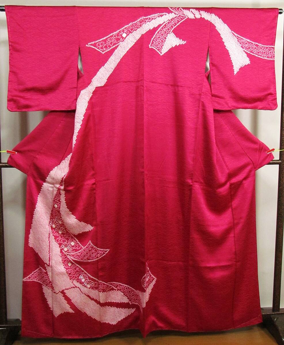 は119 正絹 訪問着 ショッキングピンク系地に絞りで熨斗柄 しつけ付き 美品 身丈164cm