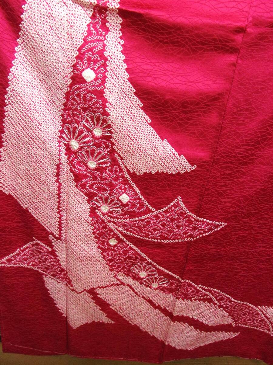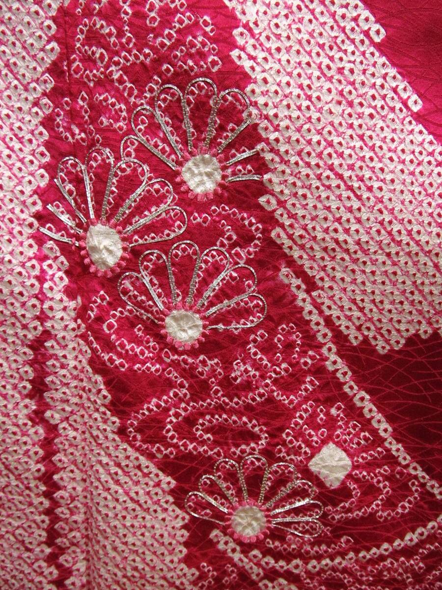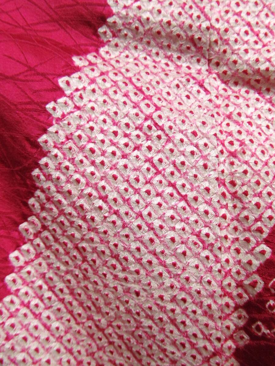 ショッキングピンク系地に絞りで熨斗の柄です。