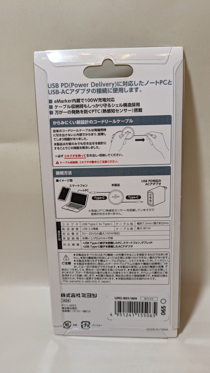 MCO USB Type-C ケーブル コードリールタイプ USB PD100W対応 最大約1m(ホワイト) UPD-R01/WH