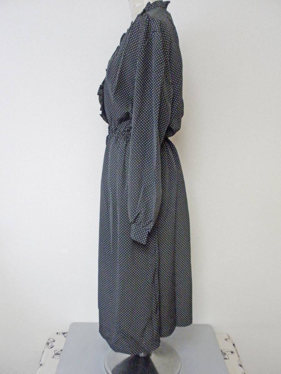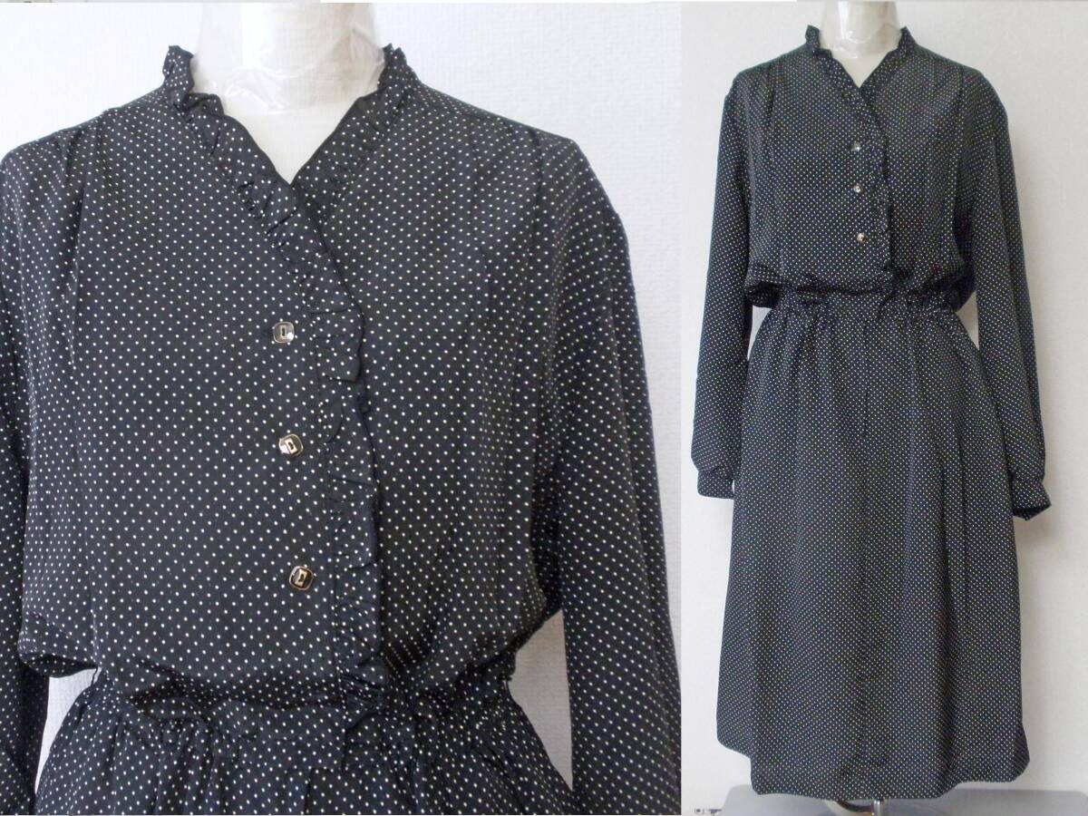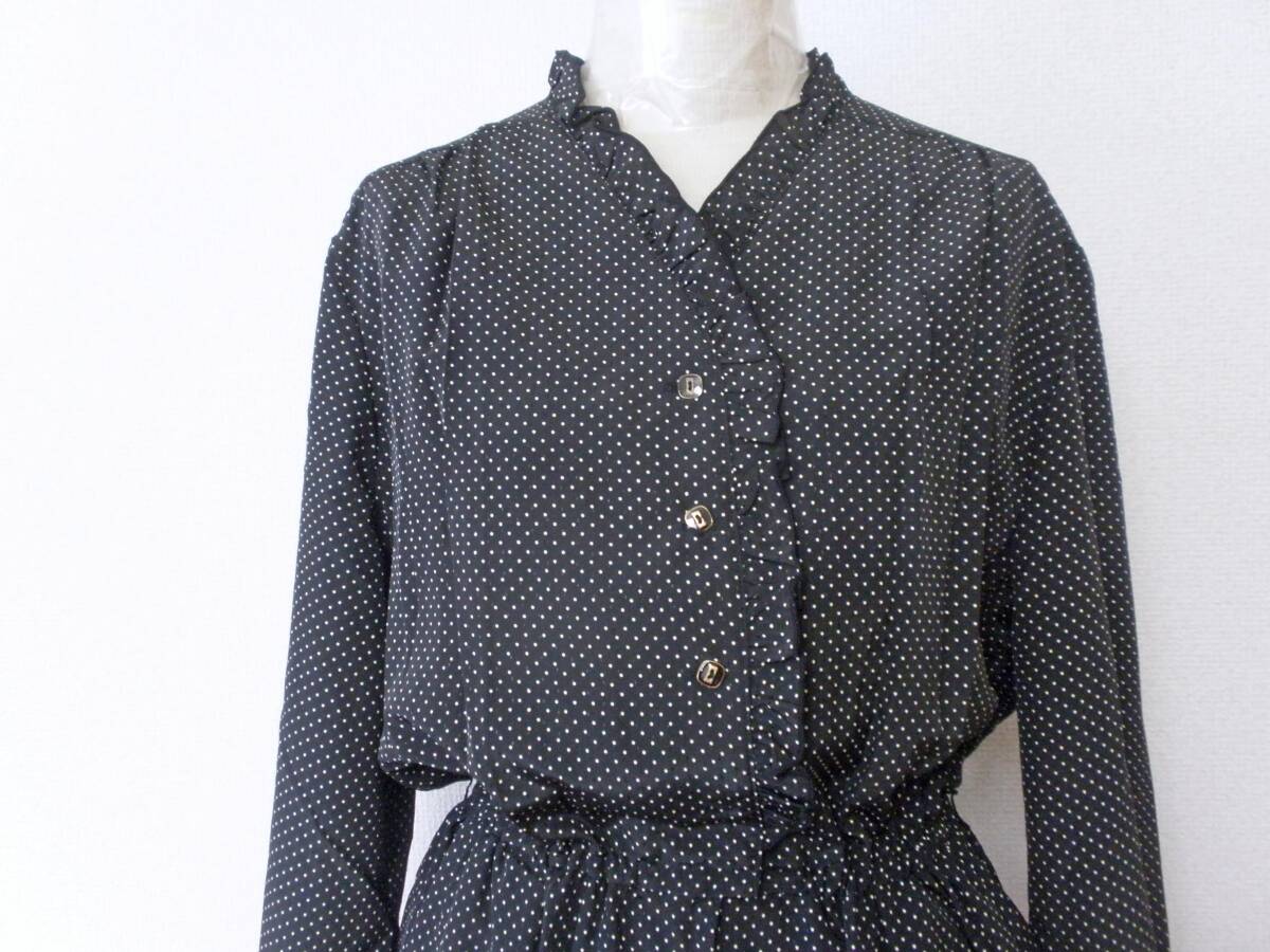 レトロ 古着 黒白 水玉柄 フリル ロング ワンピース★昭和 ヴィンテージ vintage クラシカル モード