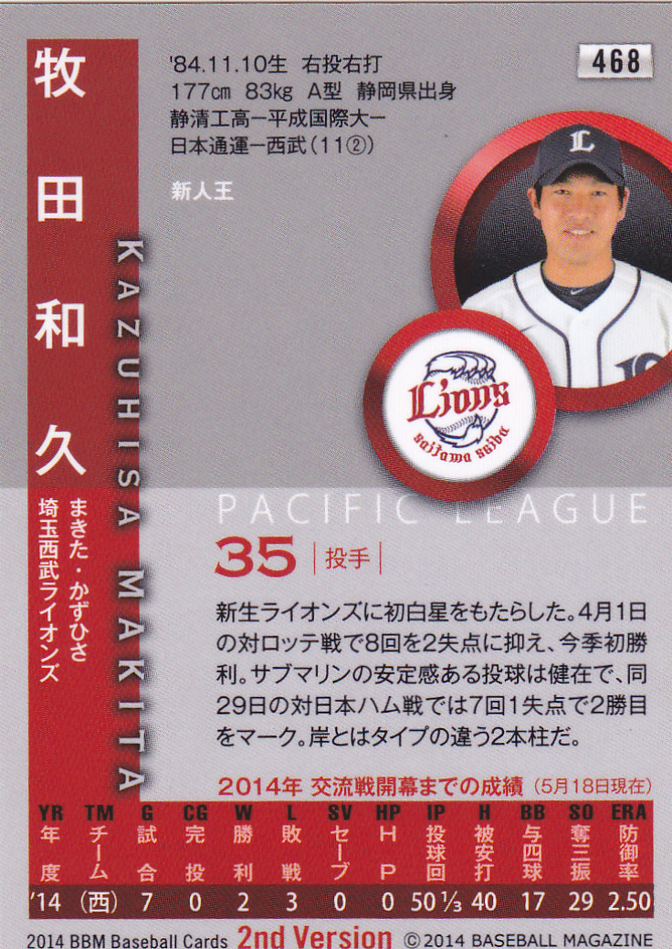 BBM2014ベースボールカード2nd 468 牧田和久 静岡県 静清工業高校 平成国際大学 日本通運 埼玉西武ライオンズ