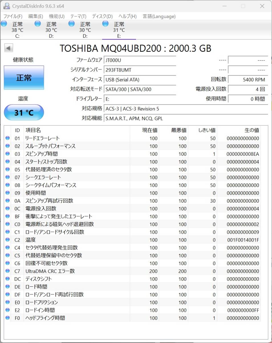 正常動作確認のため一度開封・通電していますが、掲載時点で CrystalDiskInfoは使用時間0h/健康状態「正常」 を確認済みです。