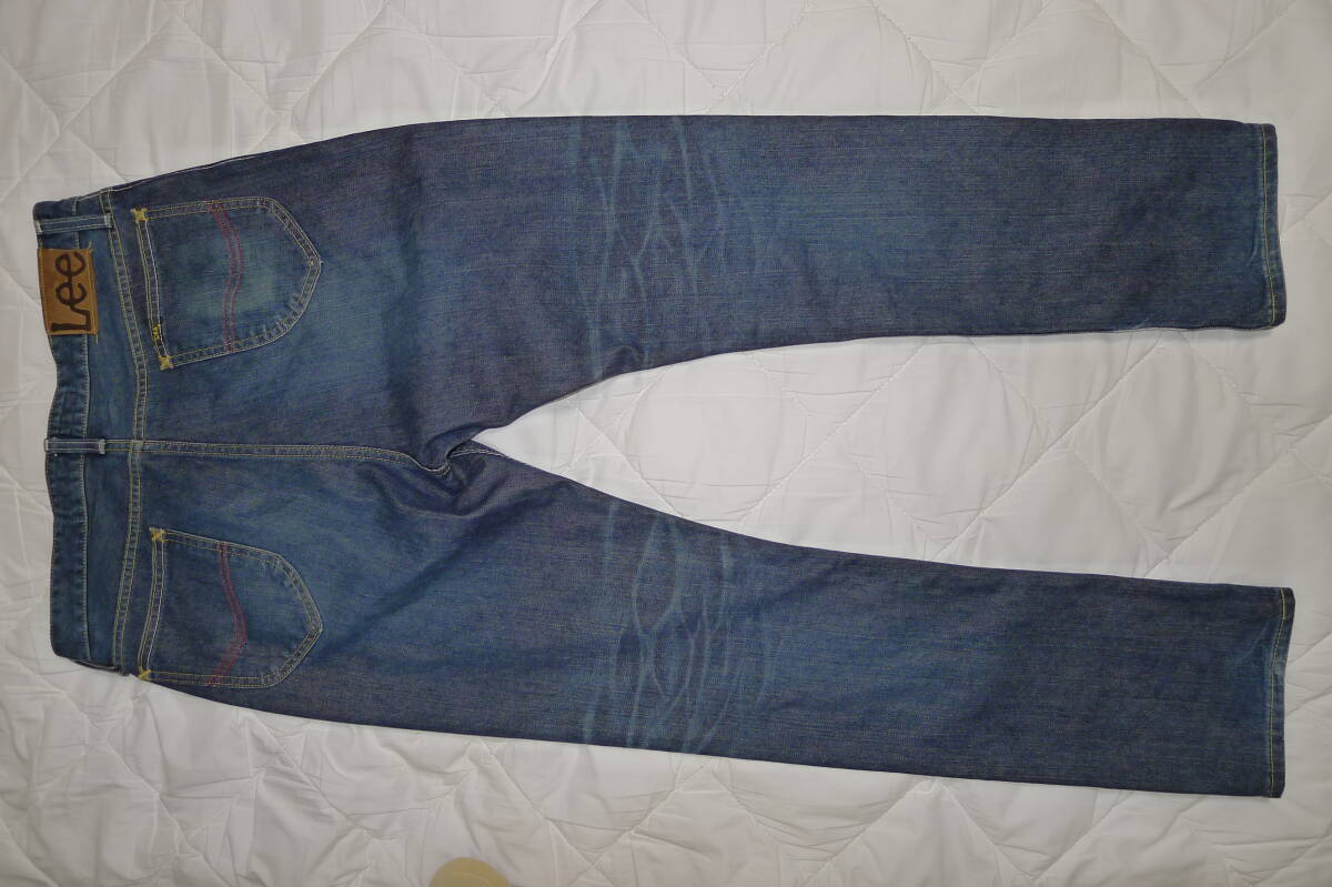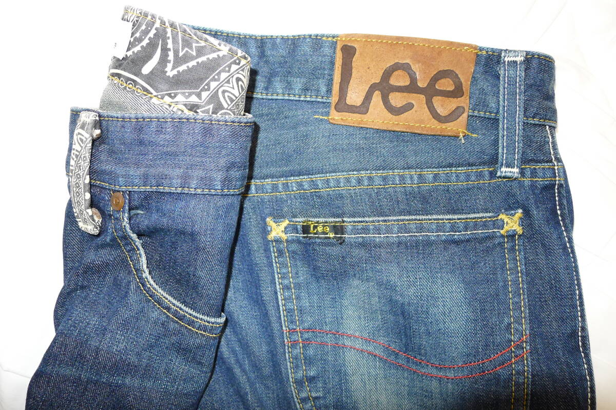 インディゴ INDIGO デニム DENIM/ウォッシュ加工 WASH加工 エイジング加工 ユーズド加工 USED加工・ストレート・ジッパーフライ・「Lee RIDERS」刻印トップボタン・「LEE」 刻印銅リベット・コインポケット・オレンジ&ホワイト&レッド マルチカラーステッチ・右後部ポケット「Lee」タグ・ゴールド色ポケット裏地 など