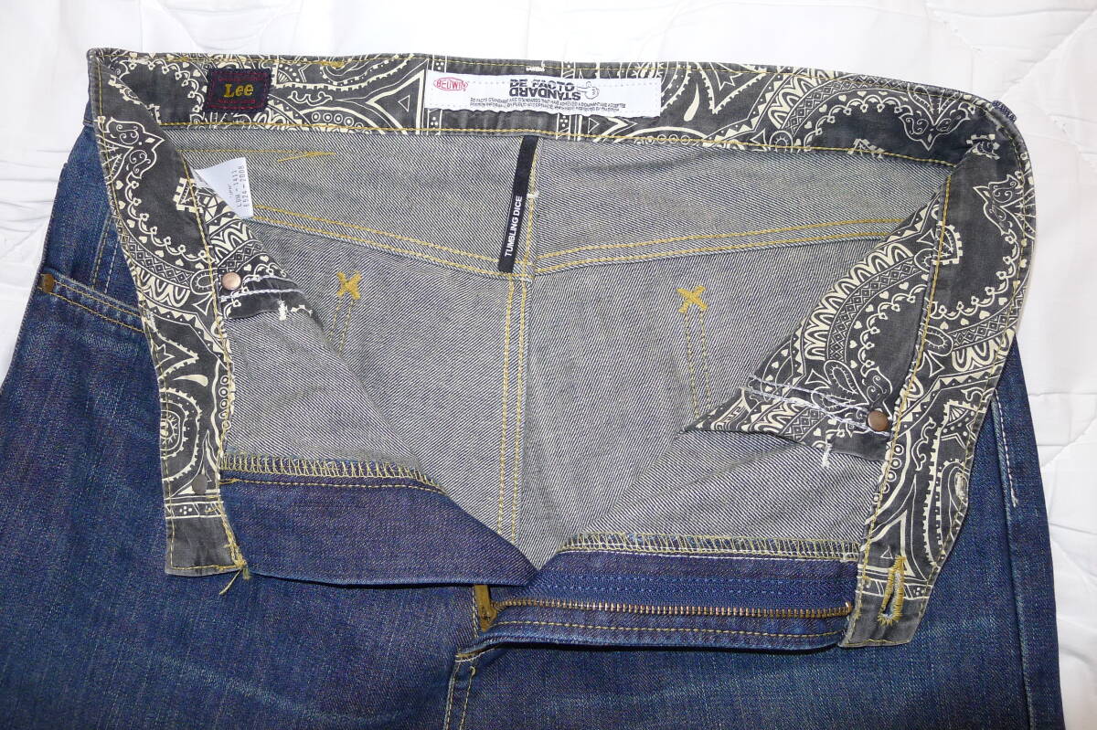 右腰部には 「Lee ゴールド」 レザーパッチ が縫い付けられ、内装及びフロントベルトループにバンダナ柄、バックポケット部に レッドステッチ を使っており、特別感を醸し出しています!!