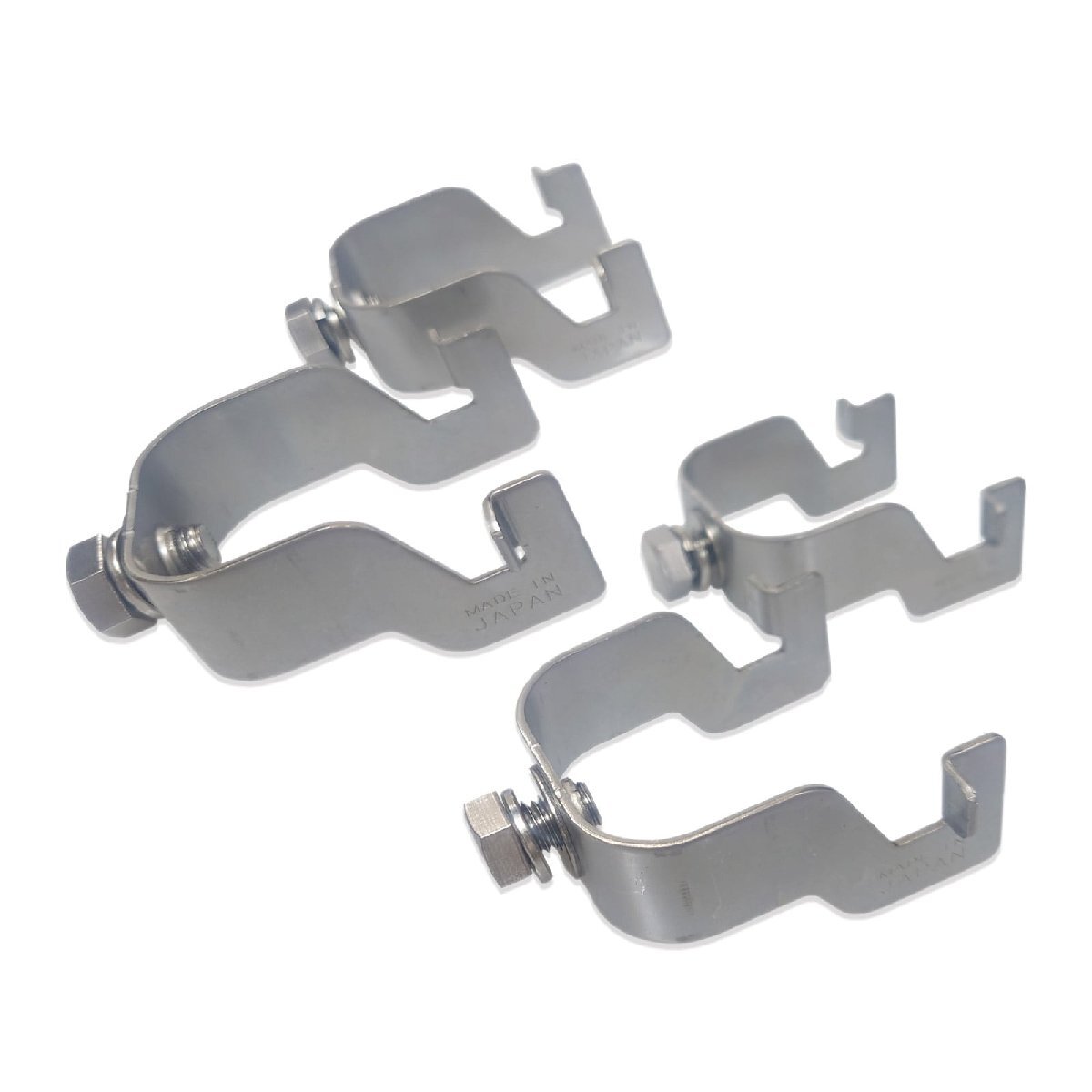 単管パイプでソーラーパネルを設置する場所をDIYされ、ソーラーパネルを取り付ける部分が金属製のバンド等を拝見しますが、単管パイプで組まれた架台へ、比較的簡単にアルミフレーム製のソーラーパネルを取り付け出来る単管固定用金具です。