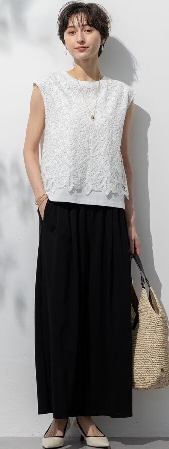 動きを制限せず下半身をカバーするシルエットにフルレングスでロングスカートのような女性らしい表情ながら