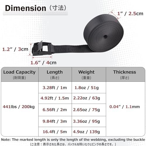 ?【寸法】ラッシングベルト幅2.5cm;長さ1m、1.5m、2m、3m、5m; 厚み: 1.1mm; 破断荷重: 200kg