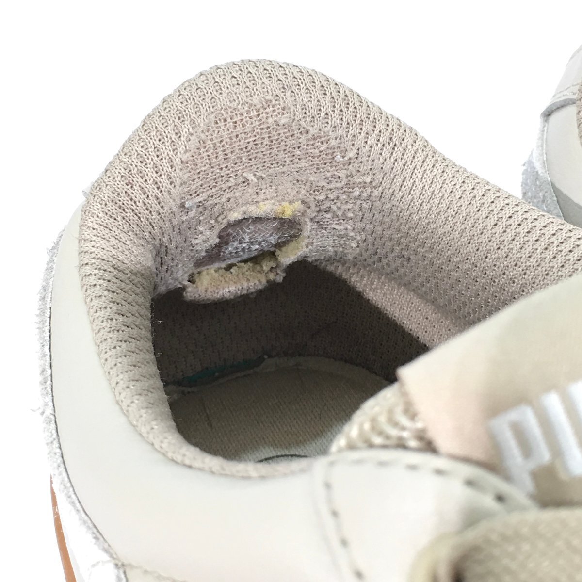 ・アッパーの状態:両足ともライニング踵部分にスレ、ダメージがあり、右足は破れがございます。側面のスエードロゴパーツに薄汚れがあり、踵のロゴ部分に汚れがございます。履きジワがございます。