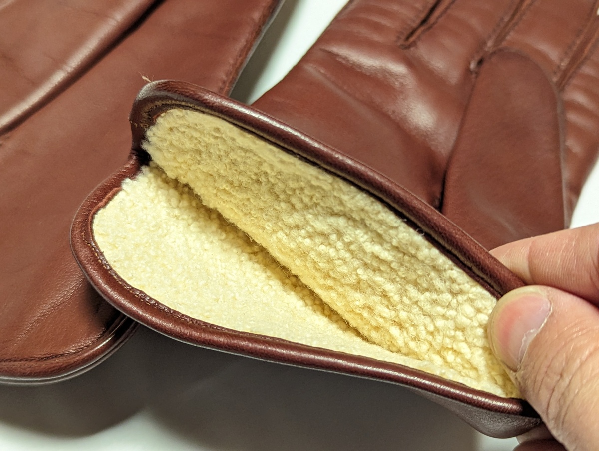 極めて端正な手縫い仕立てで、上質揃いの英国ヴィンテージのなかでもかなりの当たり個体です。英国ヴィンテージでのみ見られる革質です。ほんのり赤紫がかったかなりしっかりとしたブラウンのレザー、決して硬くはなく、もちもちとしていてオイリーな魅力的な質感。裏地はシープのボアです。