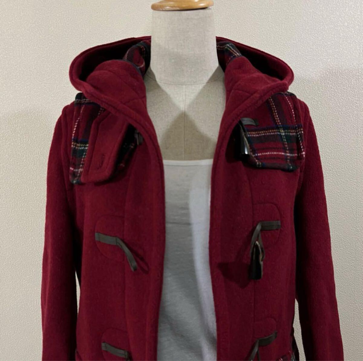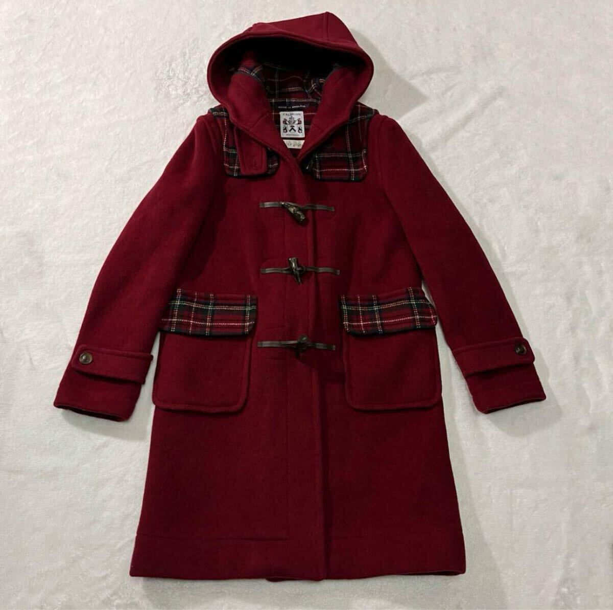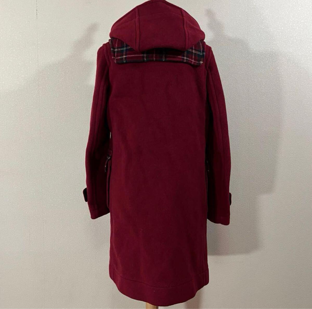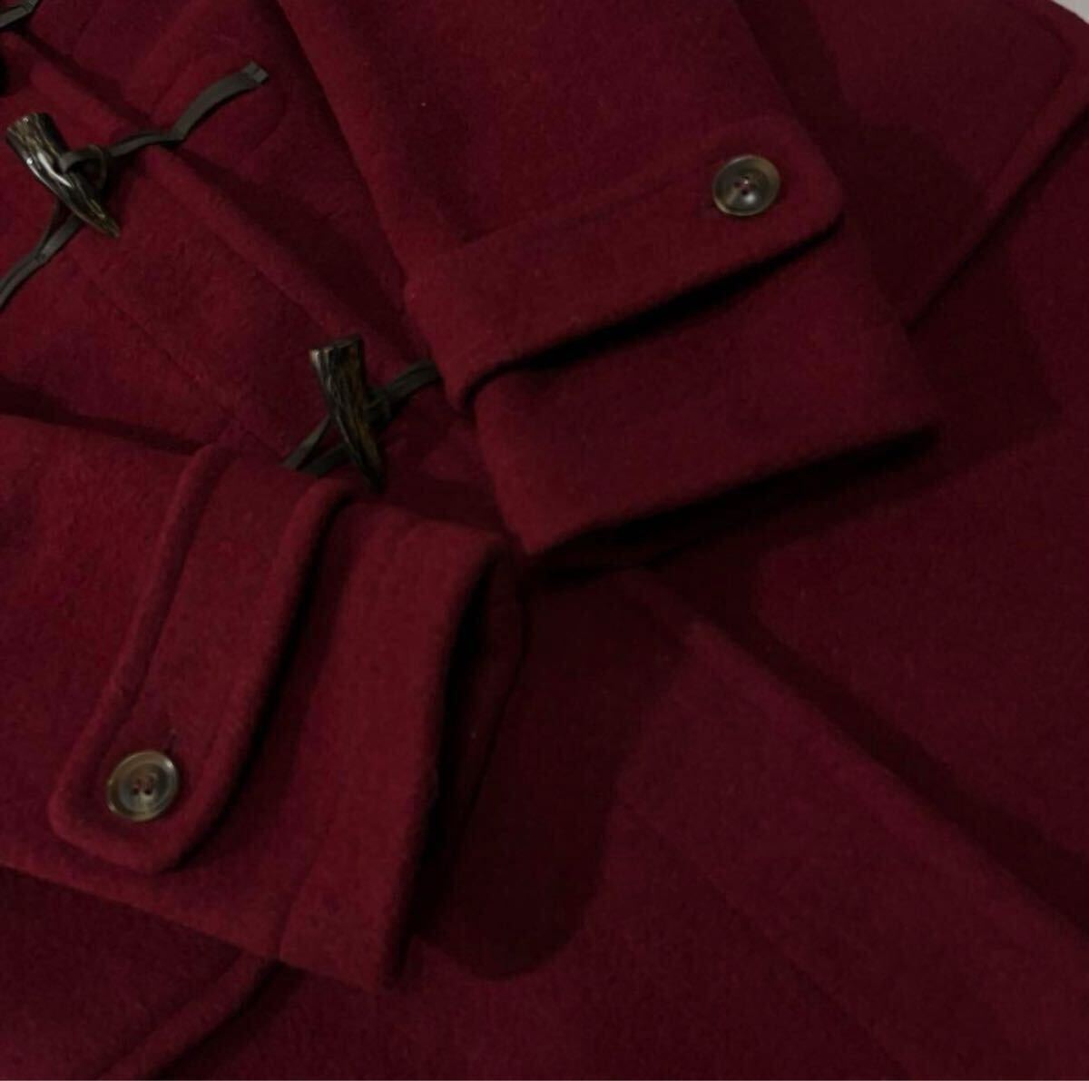 This is an authentic English-made duffle coat from CALIBURN collaboration with l’Atelier du Savon. The coat features traditional British craftsmanship with wooden toggle buttons, rope fastenings, and beautiful check-patterned lining. Made with 70% wool blend material in elegant wine red color. Size F (equivalent to size 10). The condition is very good with no significant damages. Perfect for autumn and winter wear. You can purchase immediately. Please rest assured that we purchase from reliable sources and provide accurate descriptions.