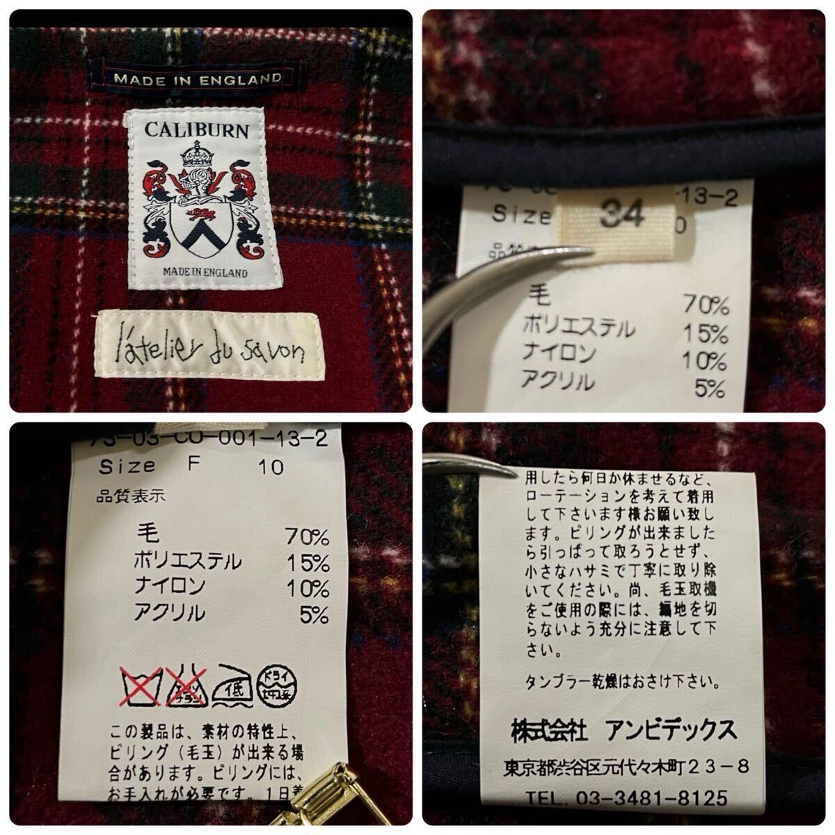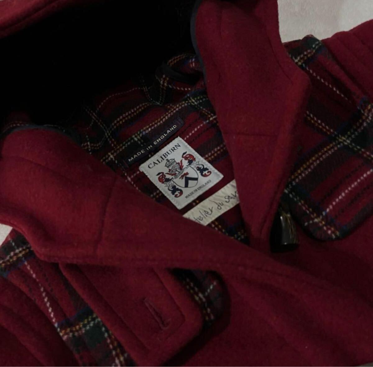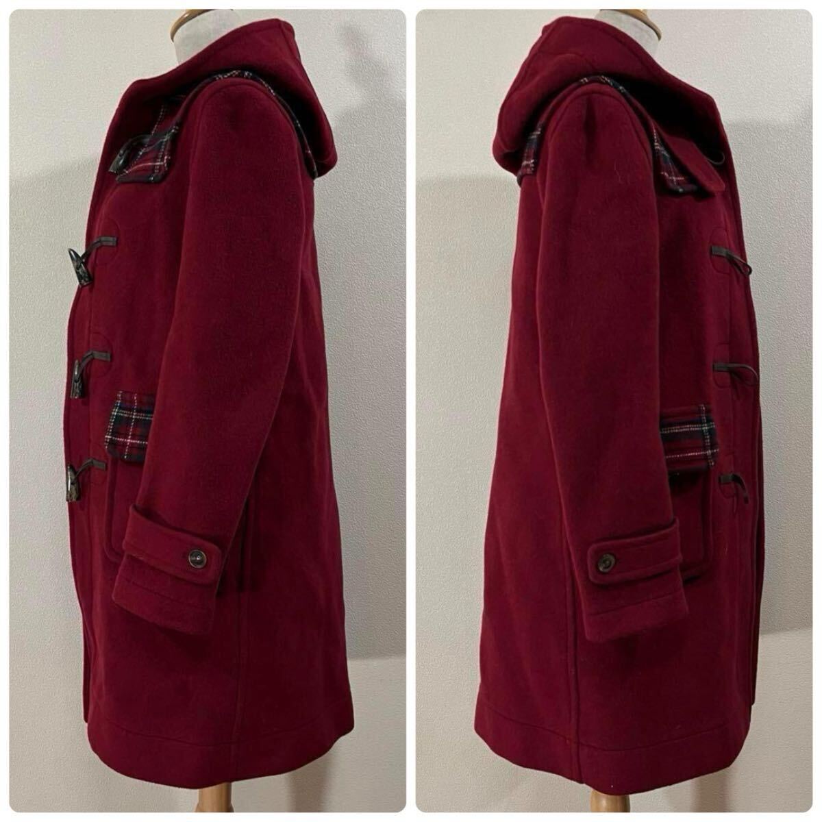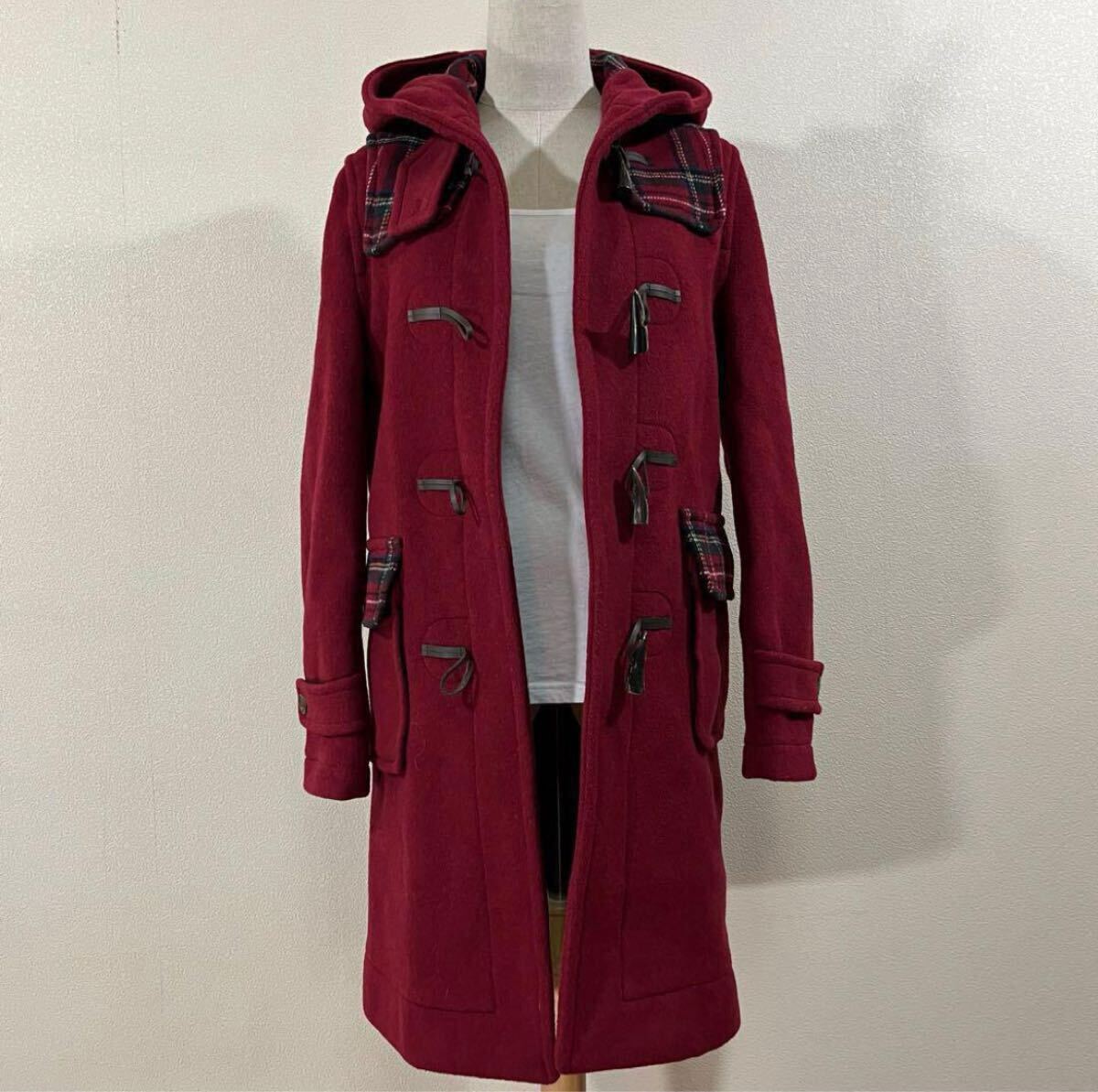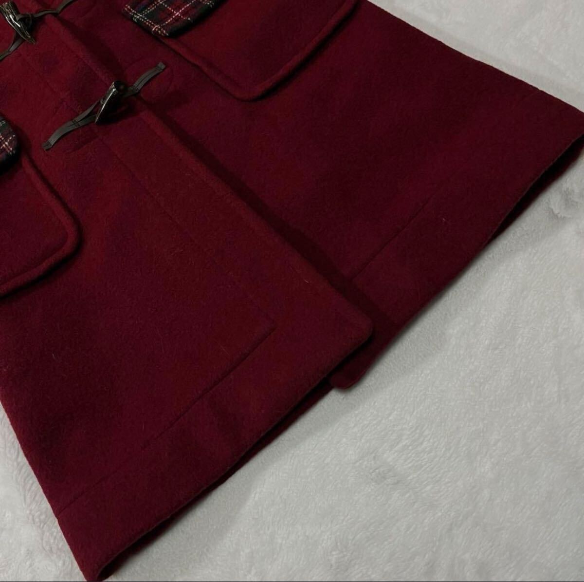 This is an authentic English-made duffle coat from CALIBURN collaboration with l’Atelier du Savon. The coat features traditional British craftsmanship with wooden toggle buttons, rope fastenings, and beautiful check-patterned lining. Made with 70% wool blend material in elegant wine red color. Size F (equivalent to size 10). The condition is very good with no significant damages. Perfect for autumn and winter wear. You can purchase immediately. Please rest assured that we purchase from reliable sources and provide accurate descriptions.