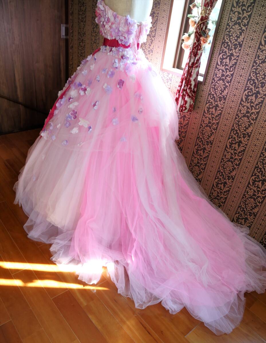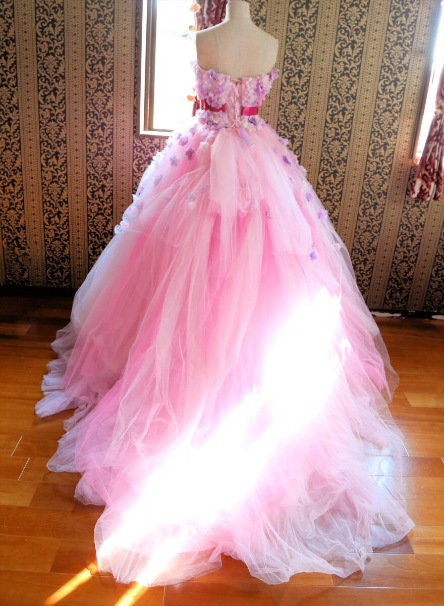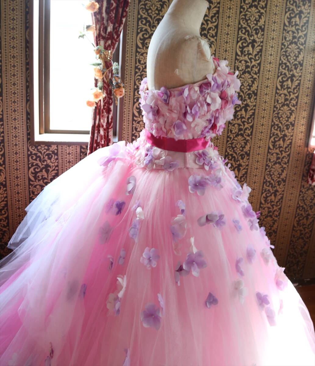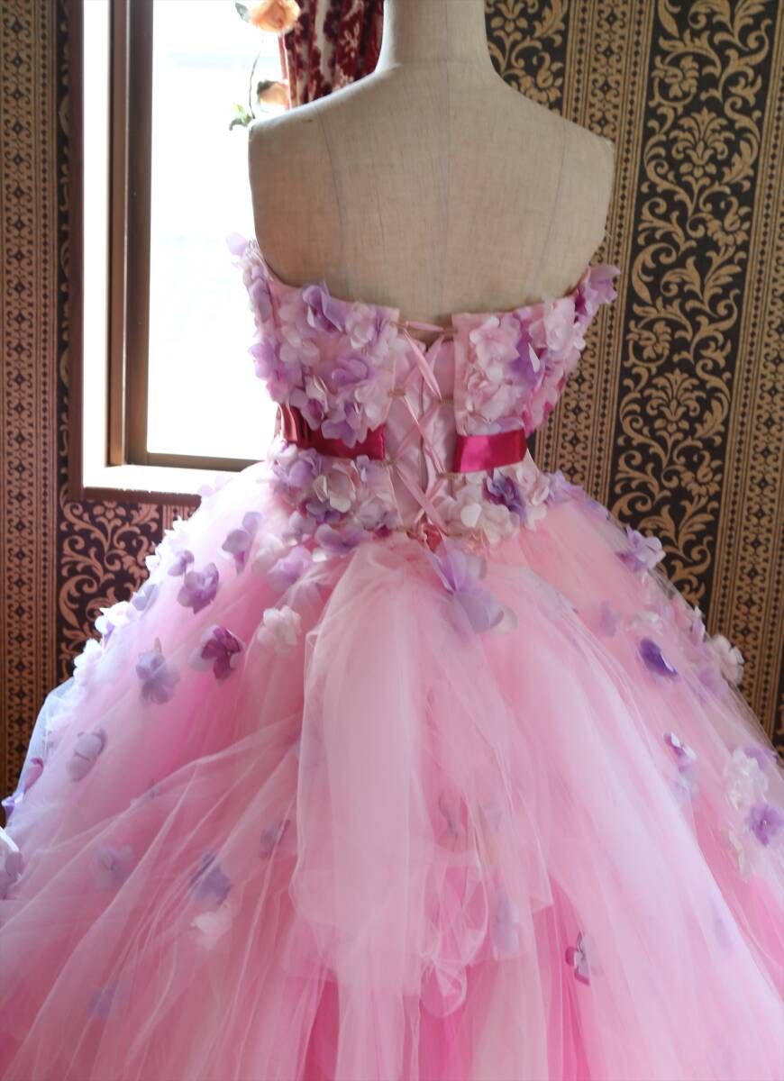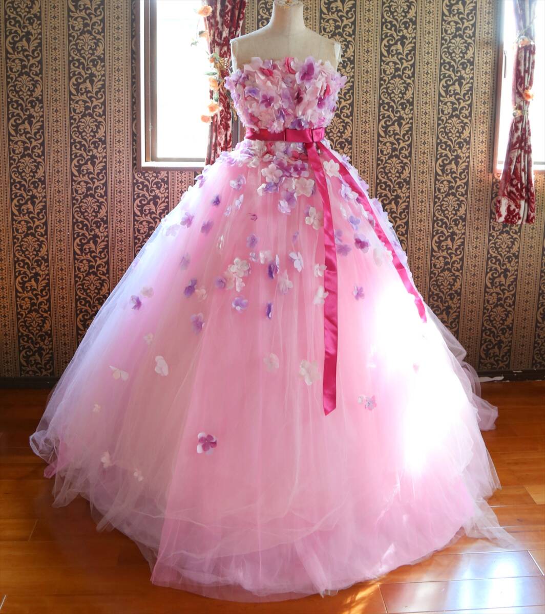 KABUチュールに小花の高級ウエディングドレス9号11号M~Lサイズ編上げ調節可能ピンクカラードレスカブインターナショナル