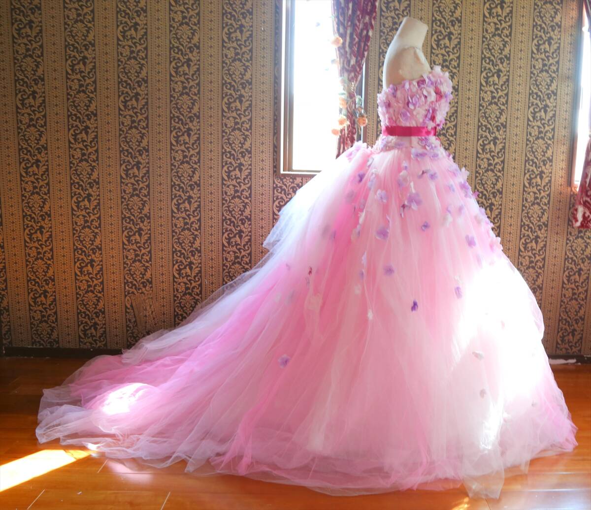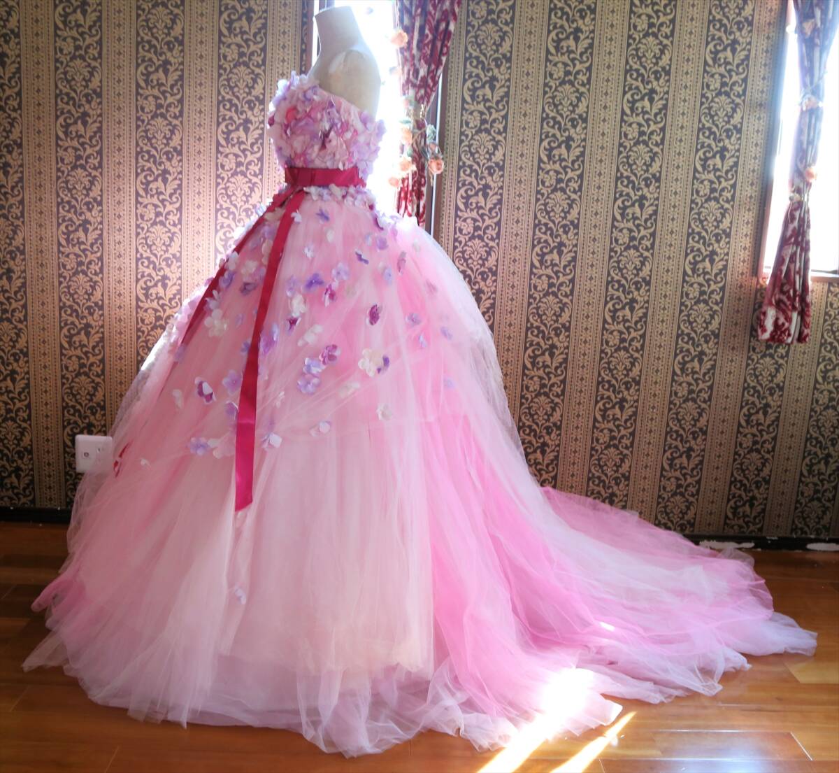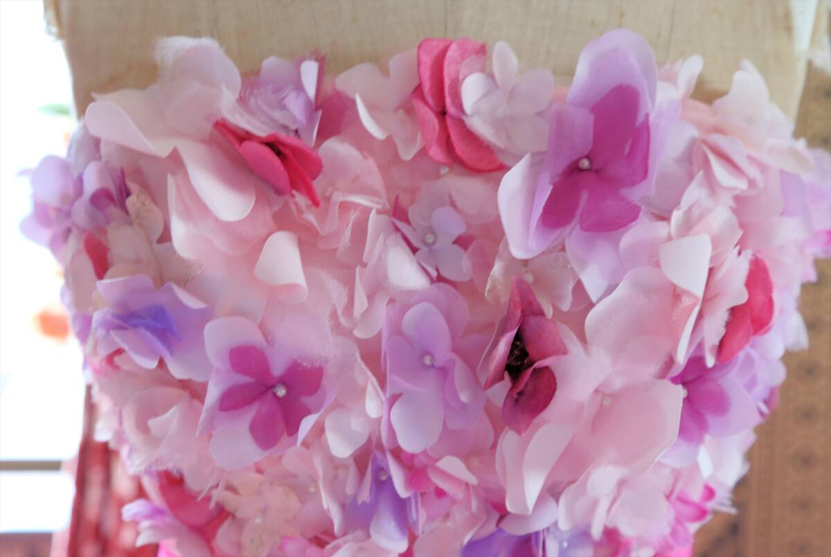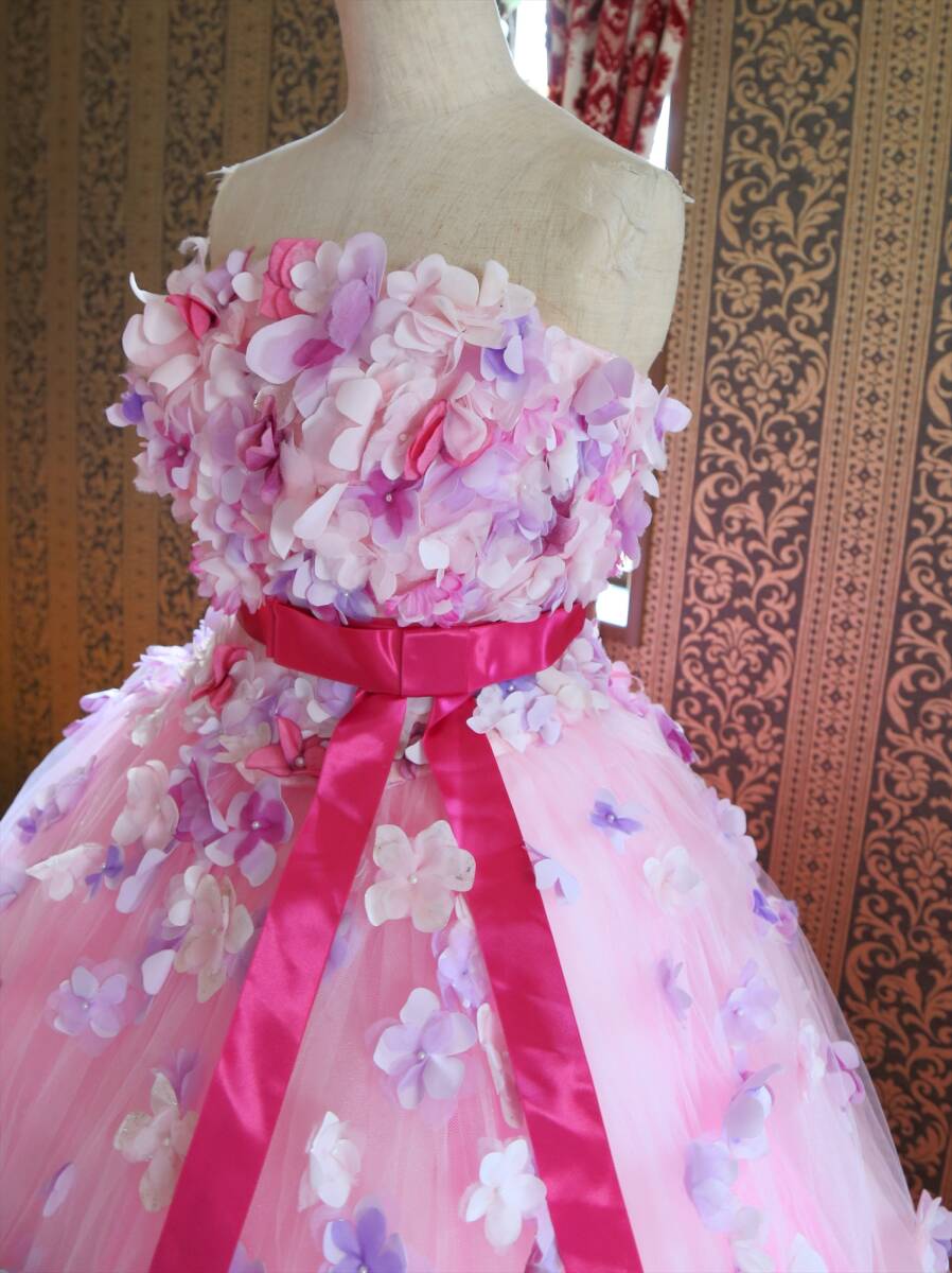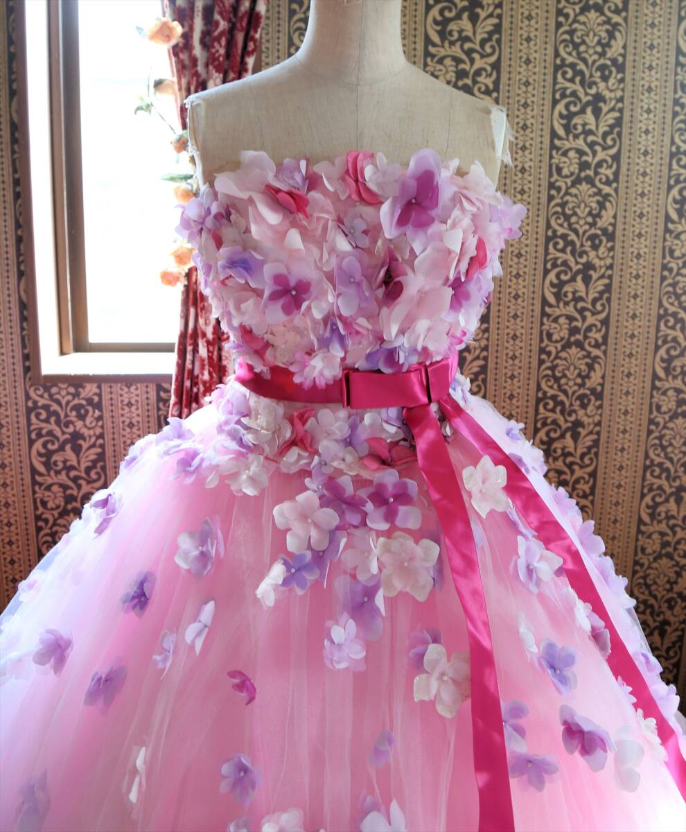 KABUチュールに小花の高級ウエディングドレス9号11号M~Lサイズ編上げ調節可能ピンクカラードレスカブインターナショナル