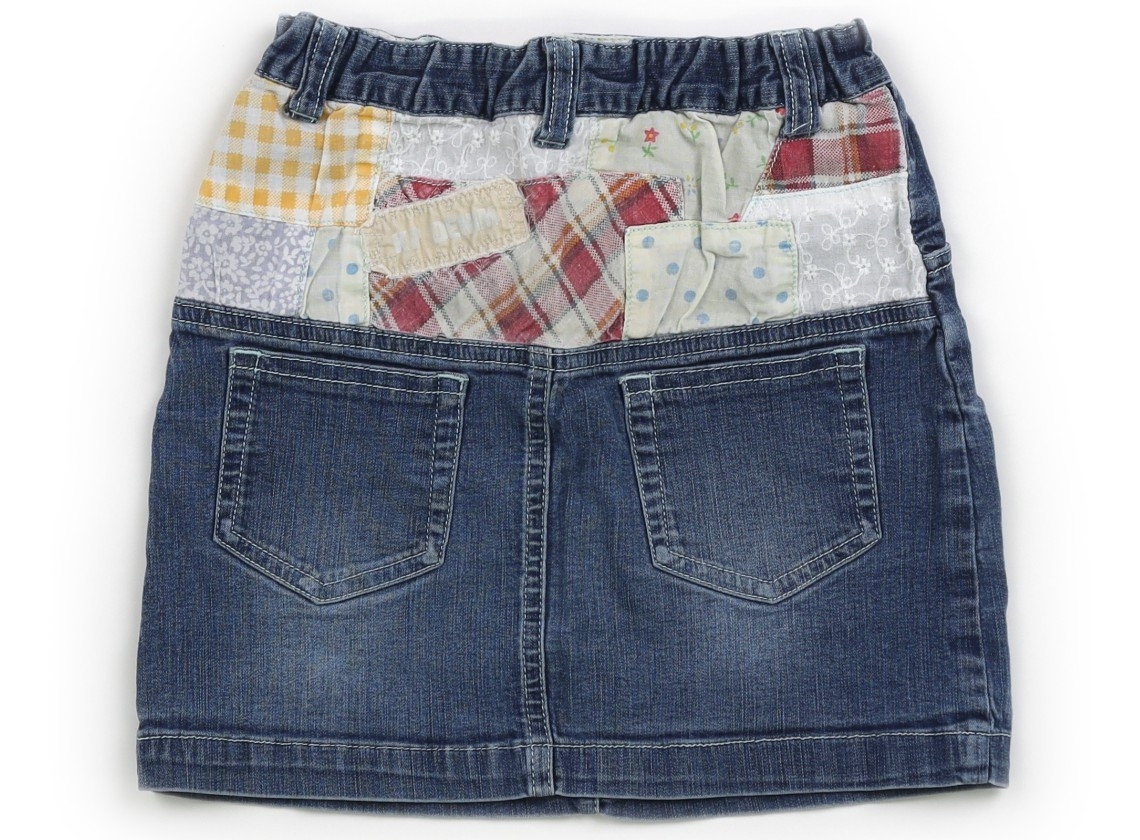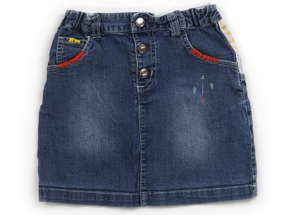 綿・ポリウレタンのデニム素材。前スナップボタン開閉。ウエストはサイズ調整ゴムが付いています。前身頃のプリント部分に縦長の引っかき跡があります。全体的に色褪せやアタリが強く、白っぽいです。