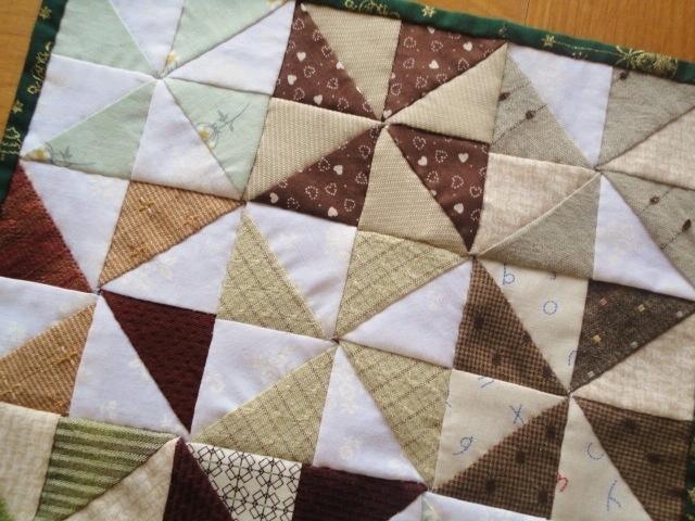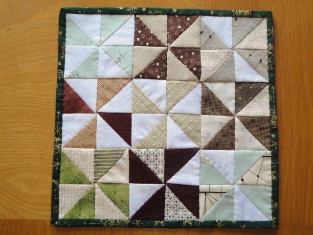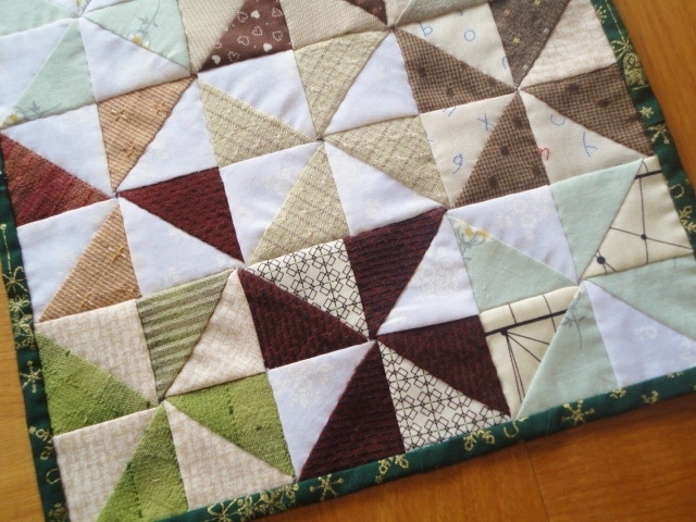 【最終出品】パッチワーク★風車のミニマット【秋風グリーン】カントリー 先染め布★ハンドメイド タペストリー