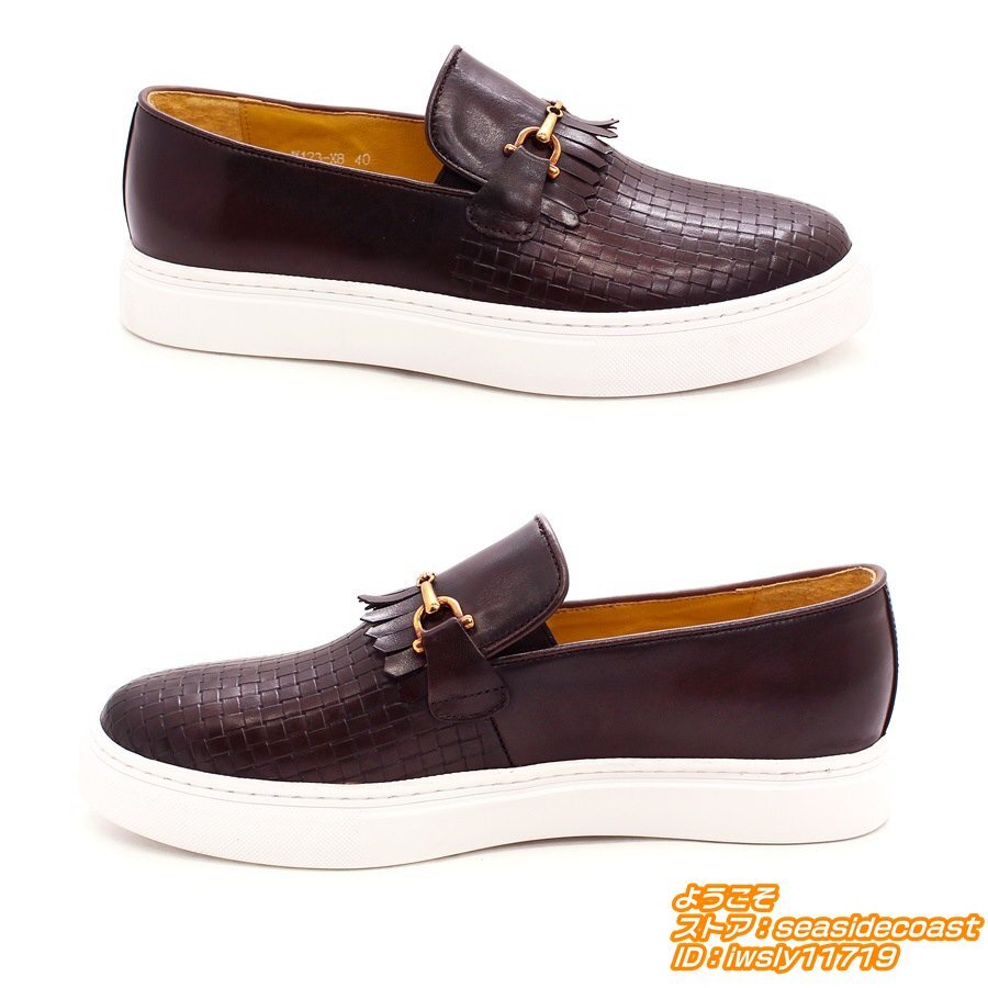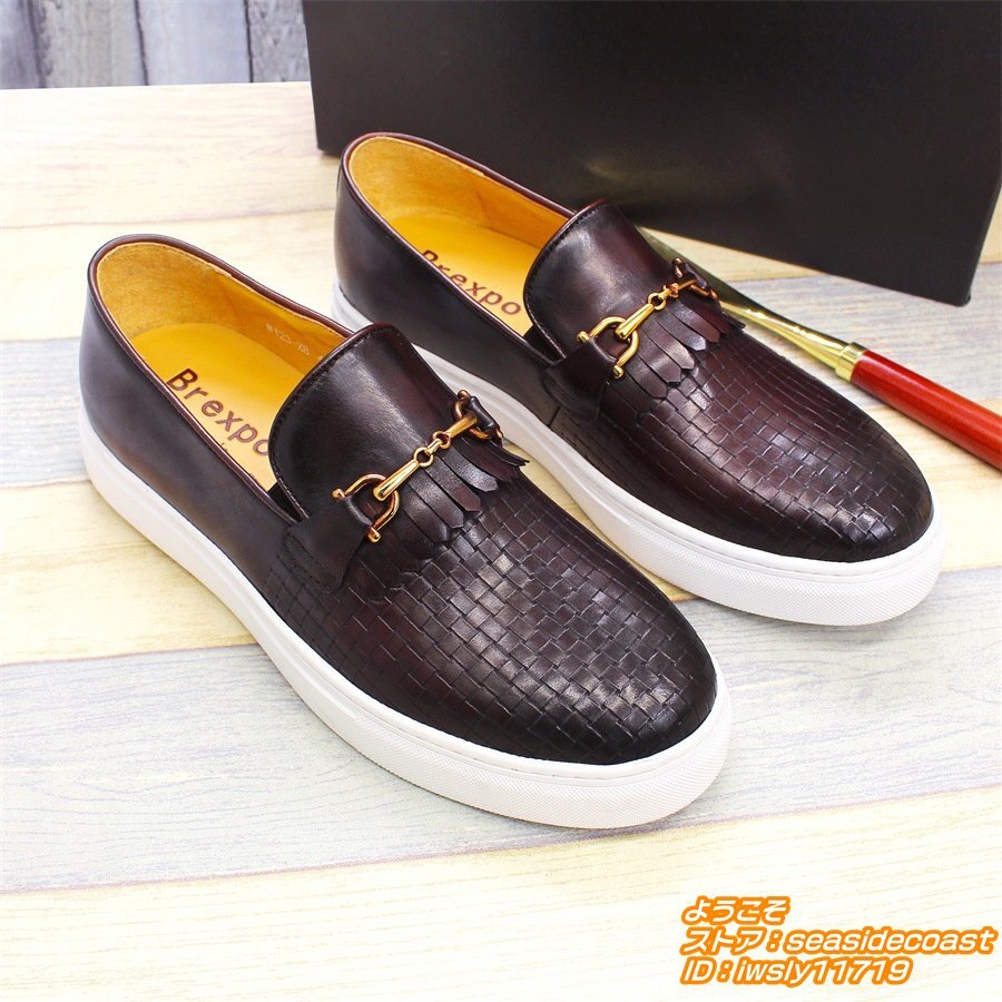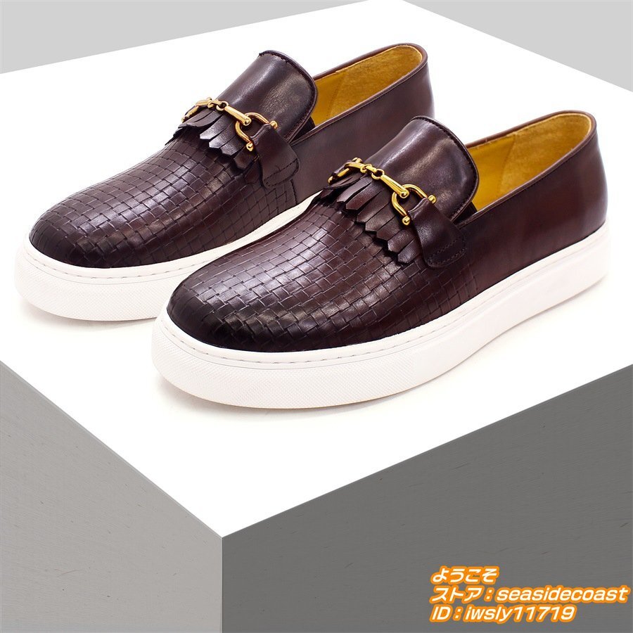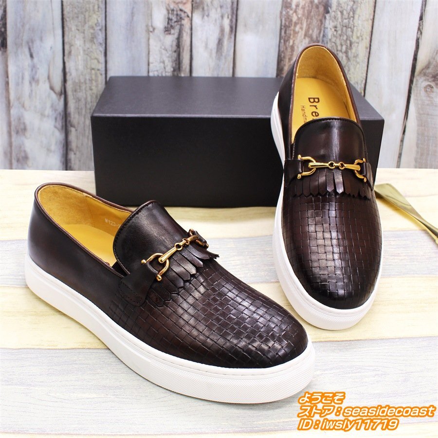 極美品■ローファー スリッポン 編み込み 本革レザーシューズ 職人手作り メンズ 牛革 ビジネスシューズ 紳士靴 革靴 牛革 珈琲色 26.5cm