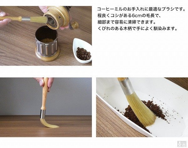 特長 | コーヒーミルは、水洗いできるものが少なく、 コーヒー粉が本体や刃部にたまりがちです。 放置しておくと酸化したコーヒー粉が味を損なわせることになります。 エスプレッソ専用ミルの掃除用ブラシです。 それ以外のミルのお手入れにも最適です。 |