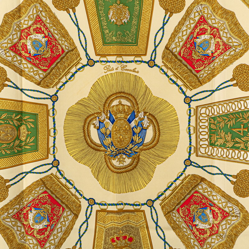 エルメス カレ90 Poste et Cavalerie サーベル飾袋 スカーフ ベージュ ゴールド マルチカラー シルク レディース HERMES 【中古】