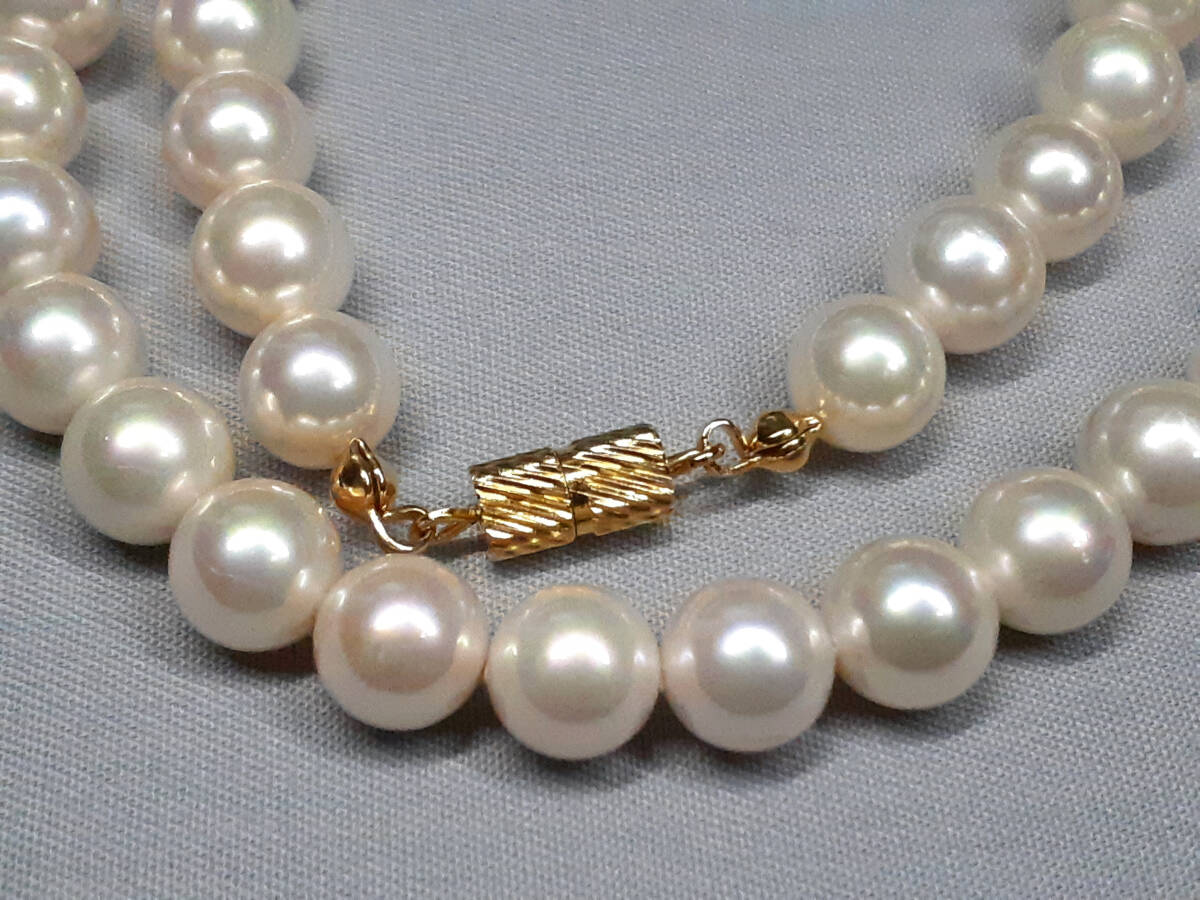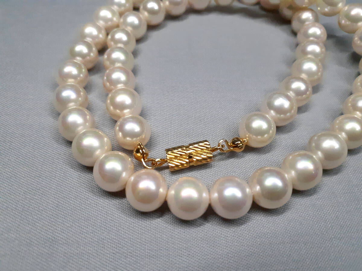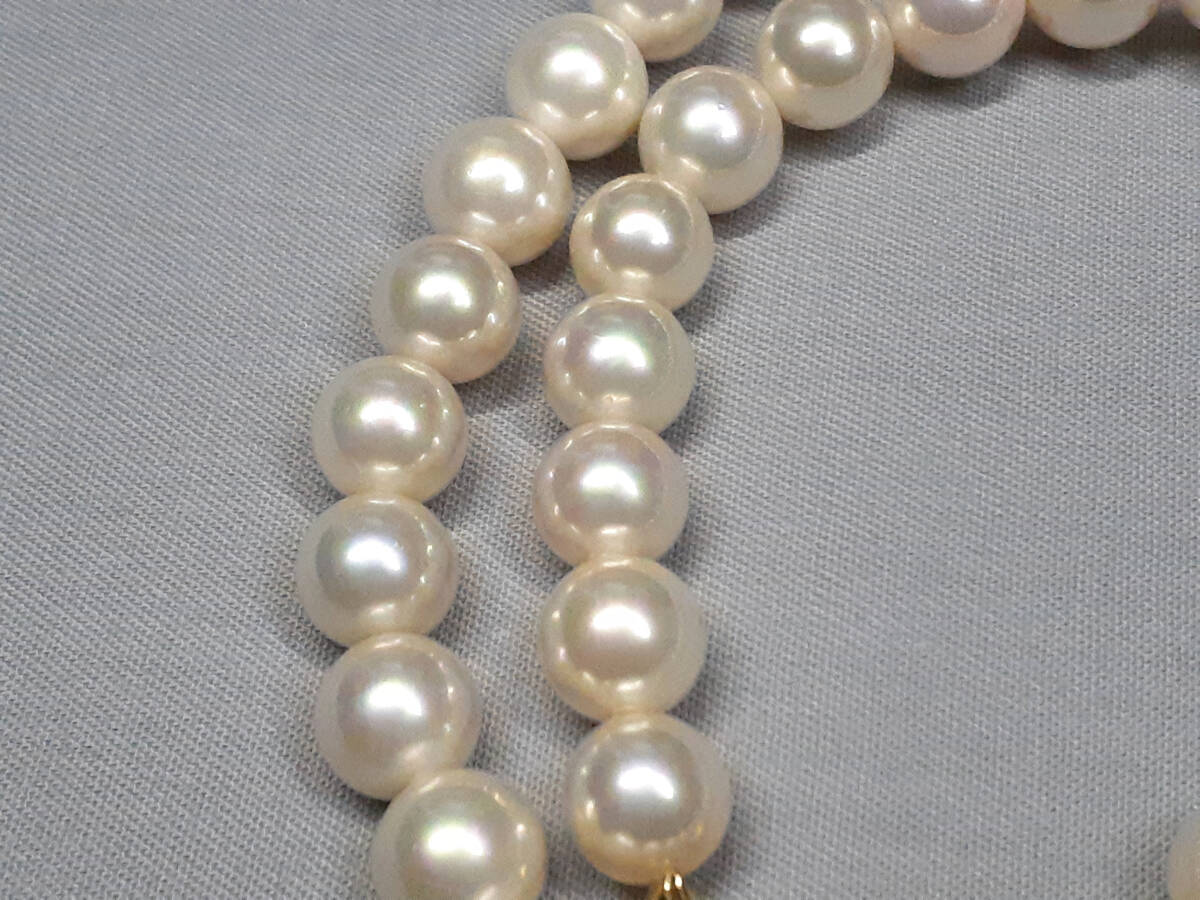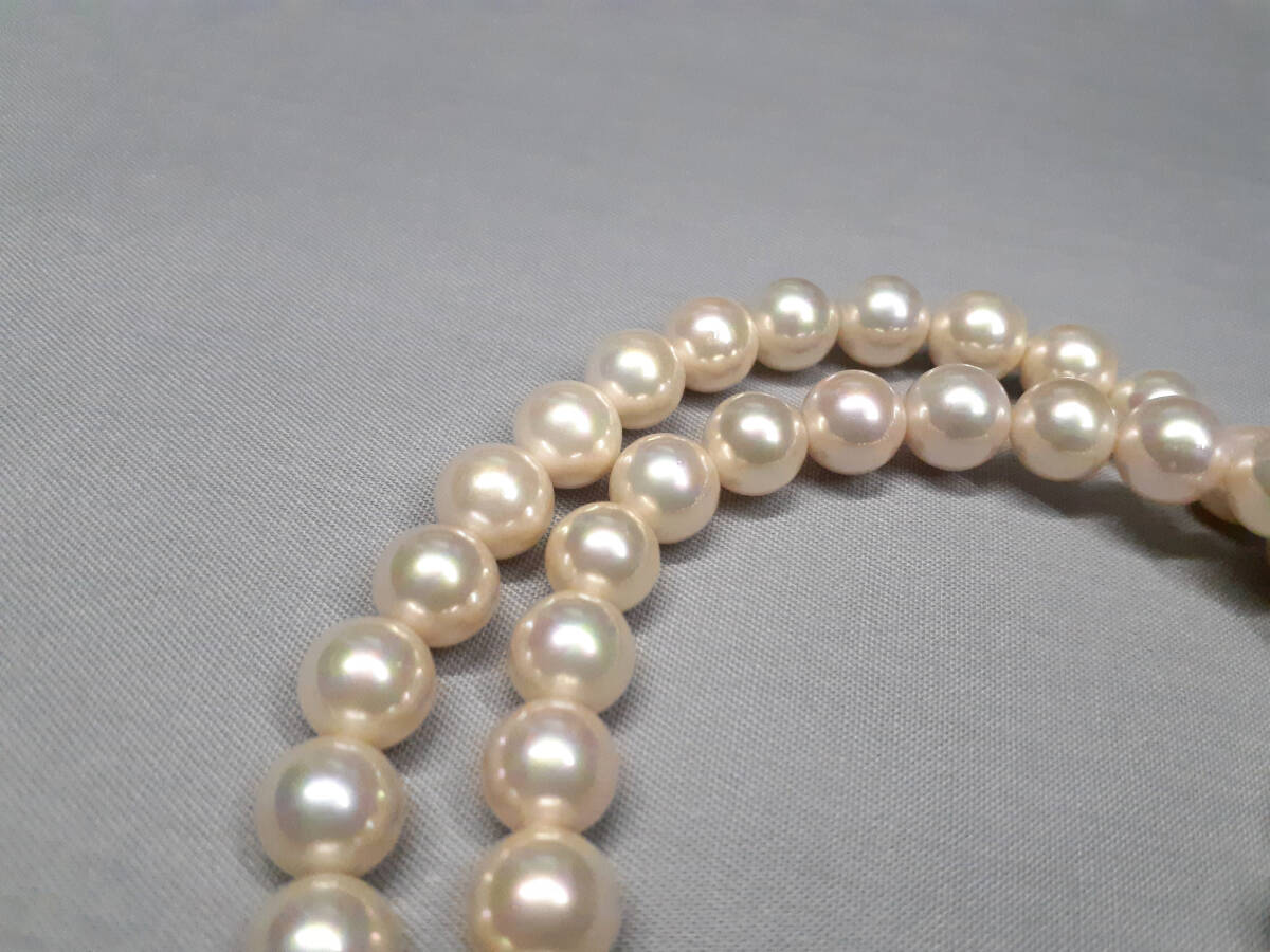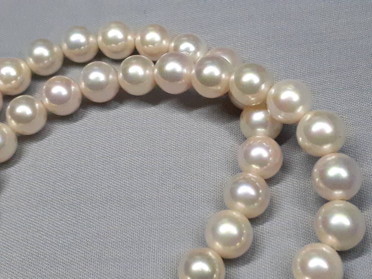商品の ご説明 約 8,3 mm 貝磨きパール です。 淡いクリームピンク系です。 玉~玉 約 41 cm ネジカン 込みでは 43,5 cm 全てハネ玉を使用してます。 ( 玉キズ、塗り斑等です。 ) ■ ** 貝磨きパールって? ** ■ 養殖真珠に使われてます核(挿入する貝玉)と同じ物を 使い人工的にその貝核に表面加工を施しまして 養殖真珠に模倣して仕上げました 人造真珠の傑作です。 20年以上も前に 私が作りました。 | ||