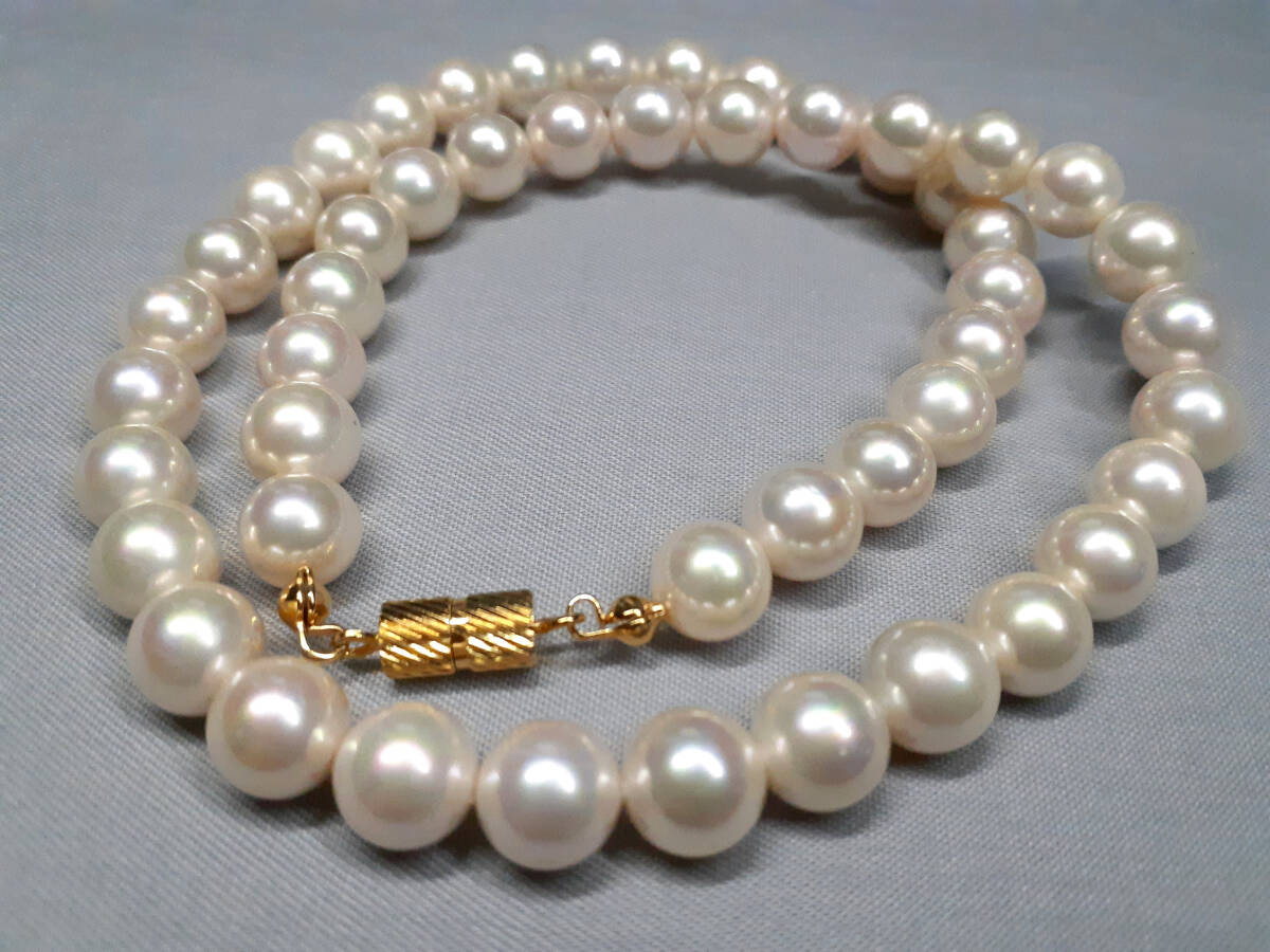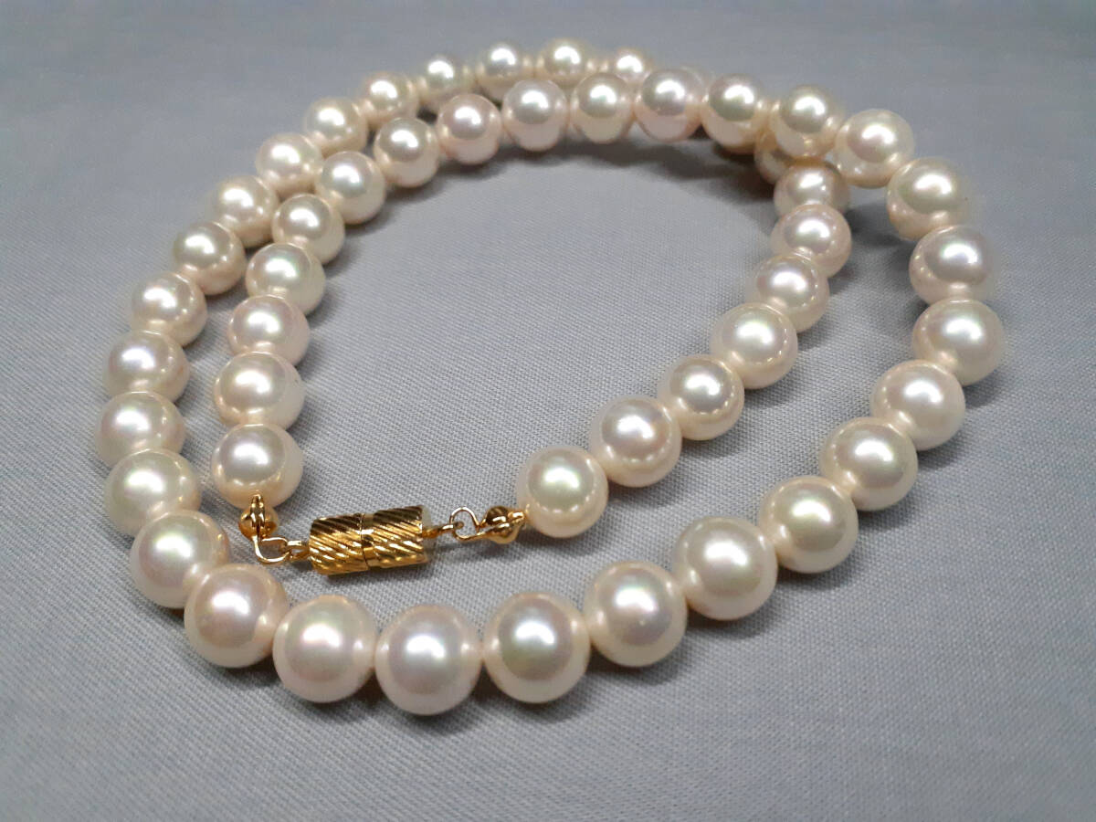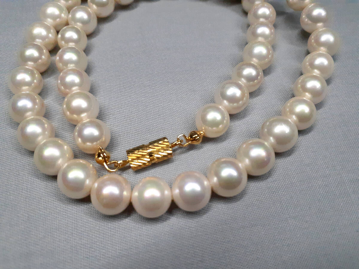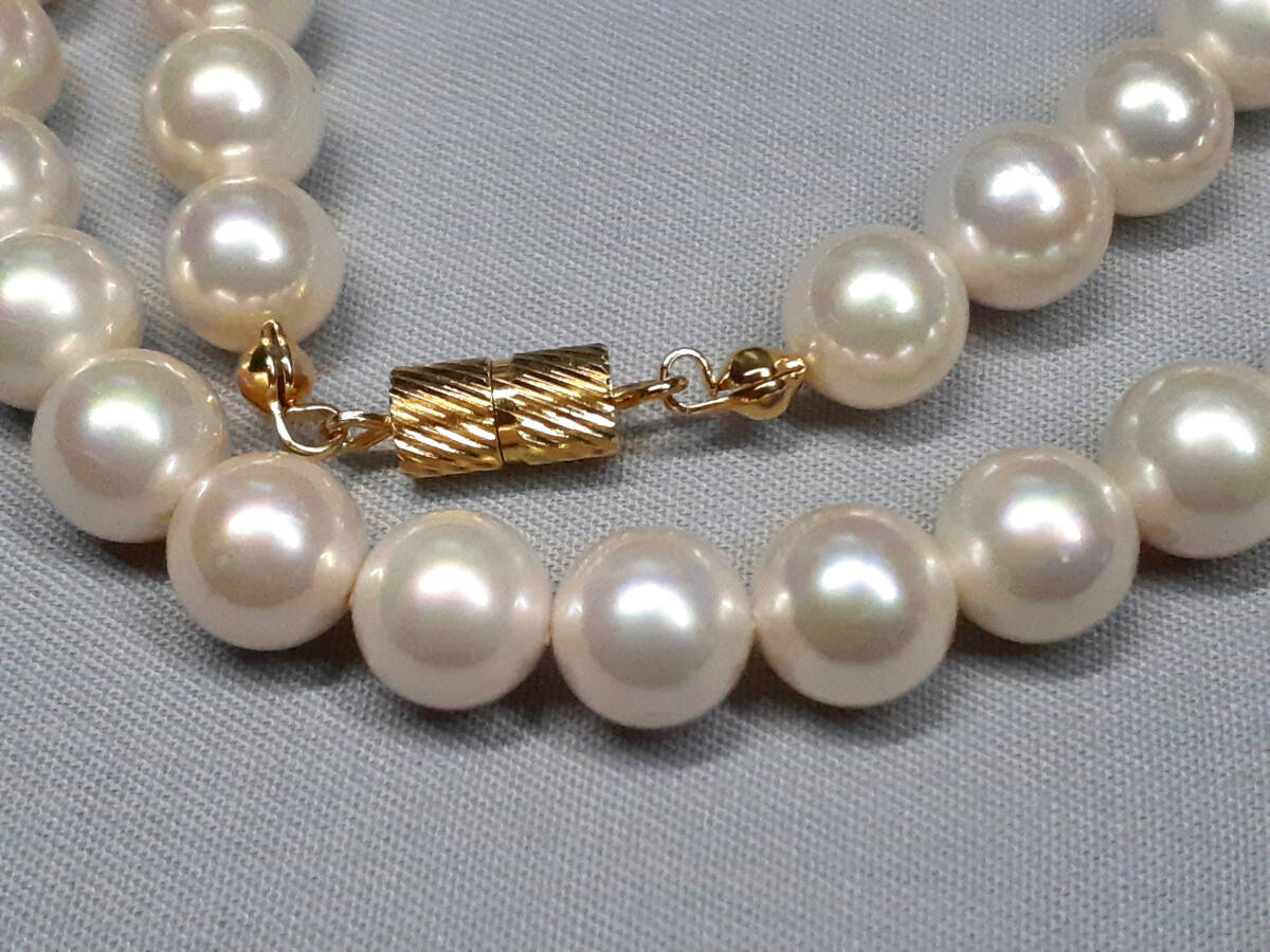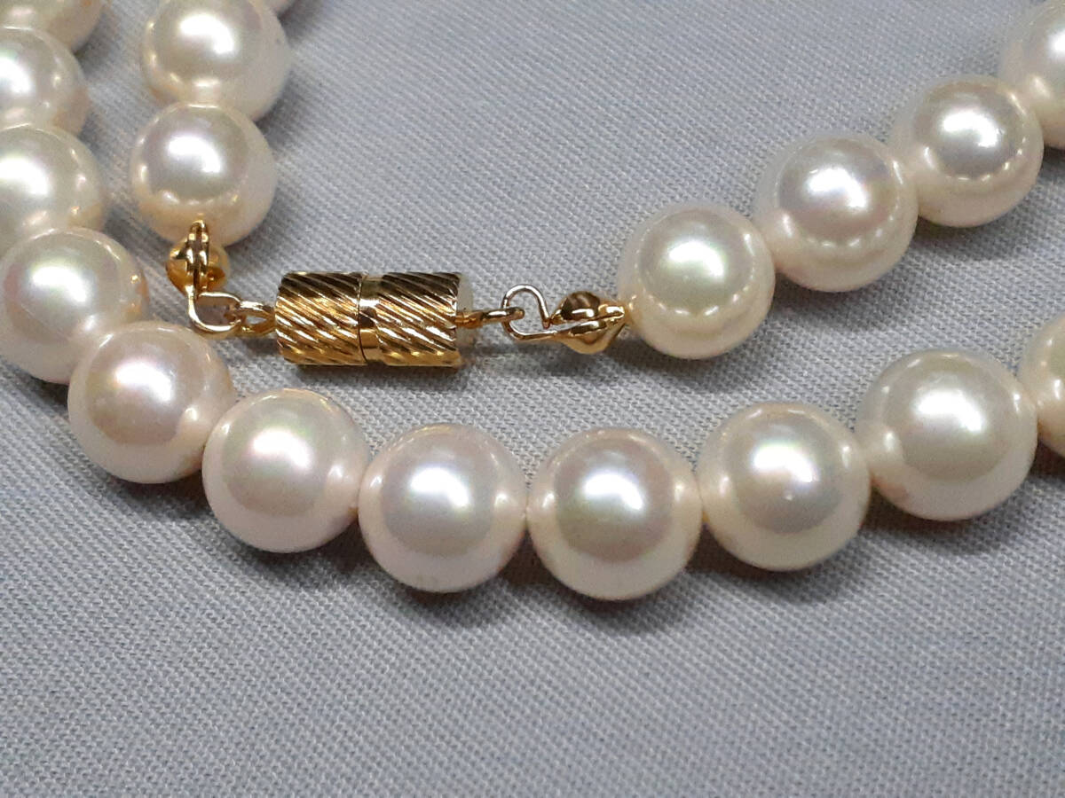 商品の ご説明 約 8,3 mm 貝磨きパール です。 淡いクリームピンク系です。 玉~玉 約 41 cm ネジカン 込みでは 43,5 cm 全てハネ玉を使用してます。 ( 玉キズ、塗り斑等です。 ) ■ ** 貝磨きパールって? ** ■ 養殖真珠に使われてます核(挿入する貝玉)と同じ物を 使い人工的にその貝核に表面加工を施しまして 養殖真珠に模倣して仕上げました 人造真珠の傑作です。 20年以上も前に 私が作りました。 | ||
