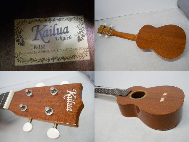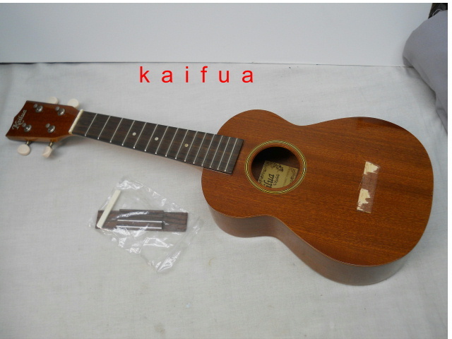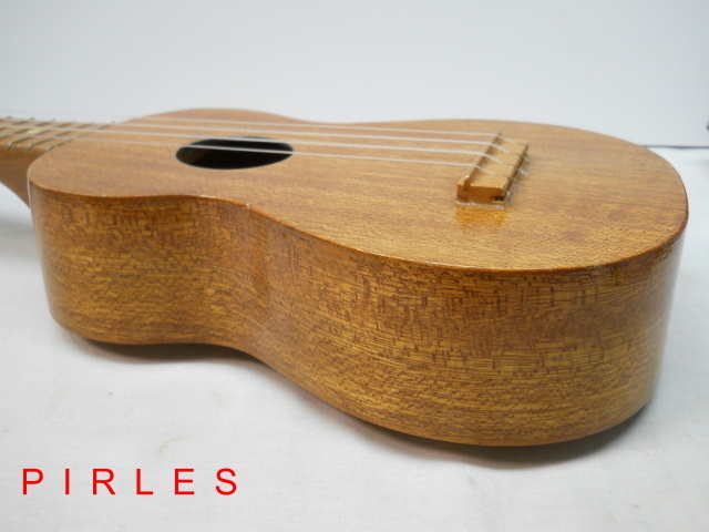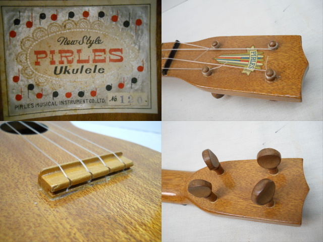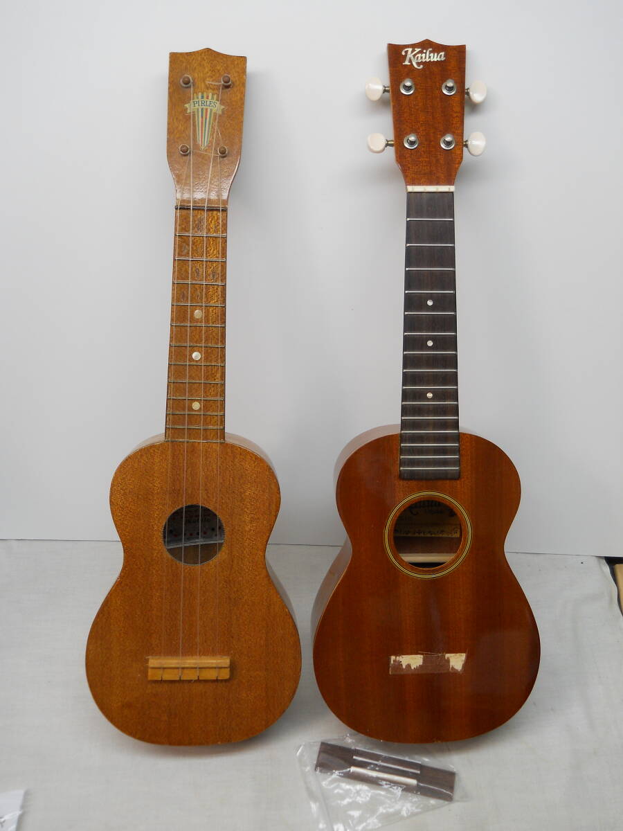 PIRLES kaifua ウクレレ ジャンク 2台 PIRLES ウクレレ No120 大きなダメージはありませんが、スレ、小さな打痕、小傷などあります。全体的にトップコート?に細かいひび割れがあります。指板に使用によるスレがあります。(画像参照)サウンドホール内のラベルがやや斜めに張ってあります。裏がバイオリンの様に膨らんだデザインです。全長約、52.5cm です。 kaifua UK-150 全長54cm。サドル、ブリッジのない物を以前に購入、自力で修理しようと思い新品交換用サドル、ブリッジ一式を加工して取り付け様としましたが時間が無く挫折しました。新品サドル、ブリッジ一式が付属いたします。本体に欠け、割れなど無く、極スレ、小キズ、小さな打痕、ぐらいで艶のある仕上げです。下倉楽器が取り扱いでした。古いウクレレとパーツ破損品なのでジャンク扱いにてお願いいたします。発送は、ゆうパック100サイズです。よろしくお願いいたします。