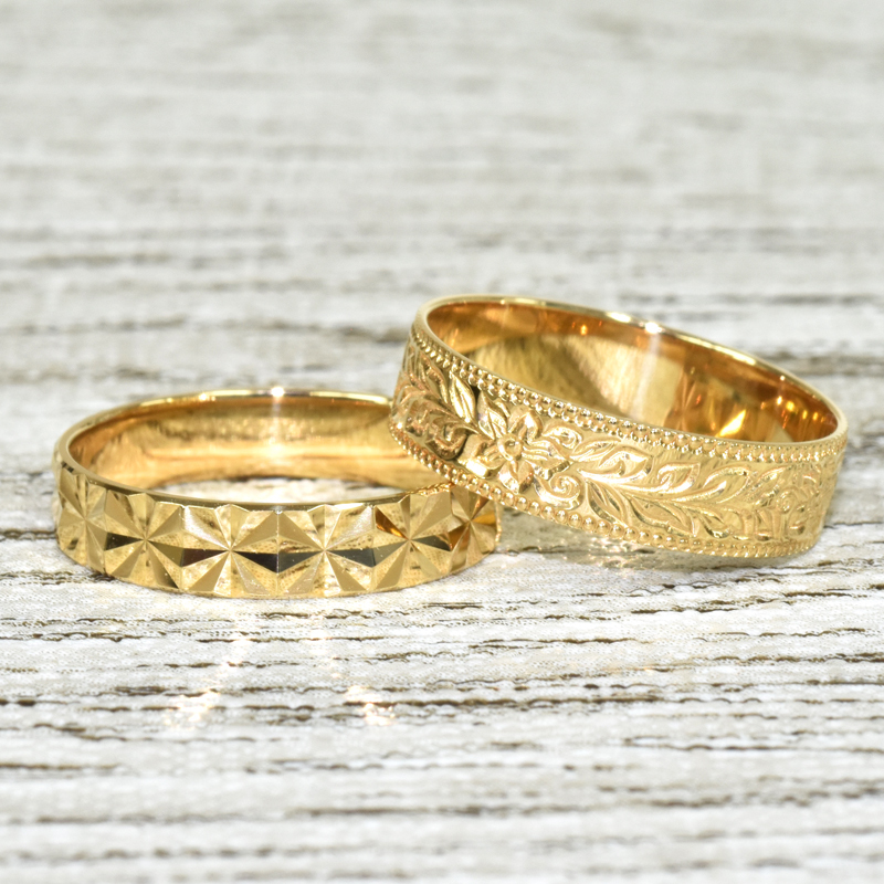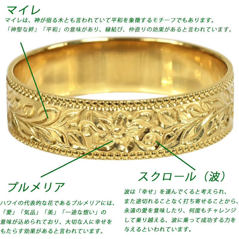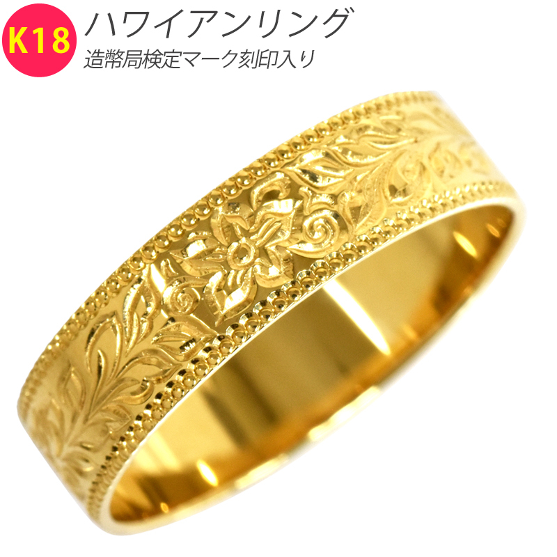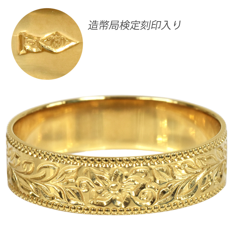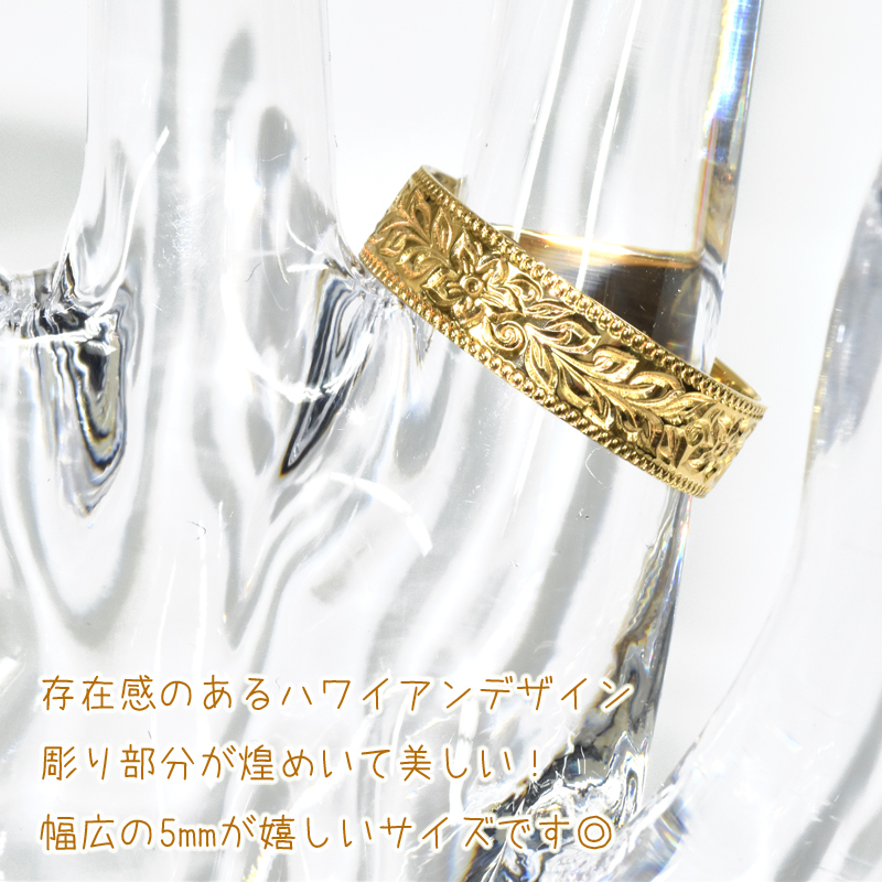 | コメント | 18金ゴールドリング。 ハワイアン風のデザインに、アンティーク調なミル打ちデザイン。 艶消しで、控えめでも可愛いです! また内甲丸になっているので、着け心地も抜群! カット面が両横の指に当たっても痛くないように、厚みは控えめです。 |