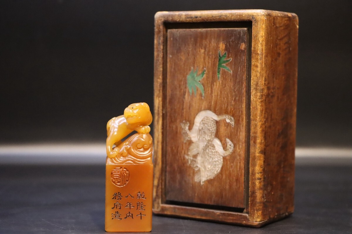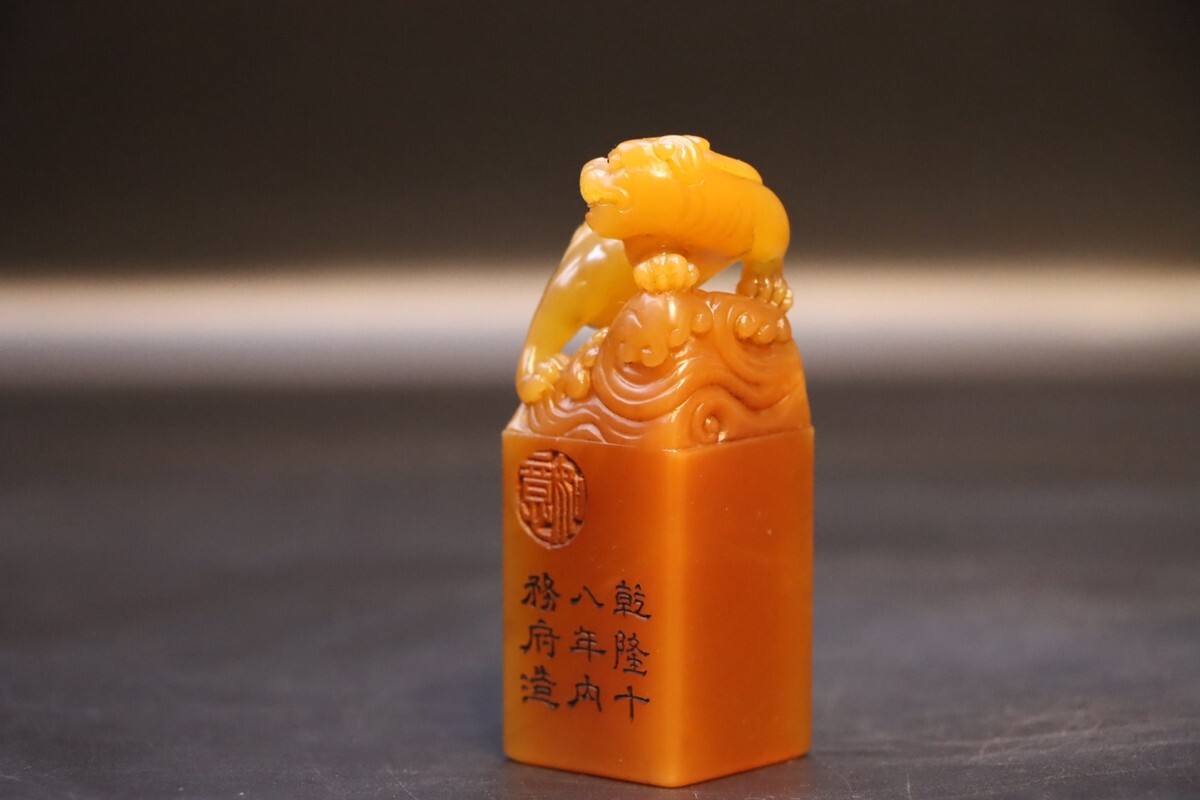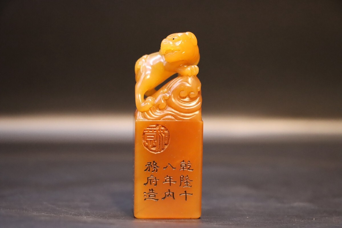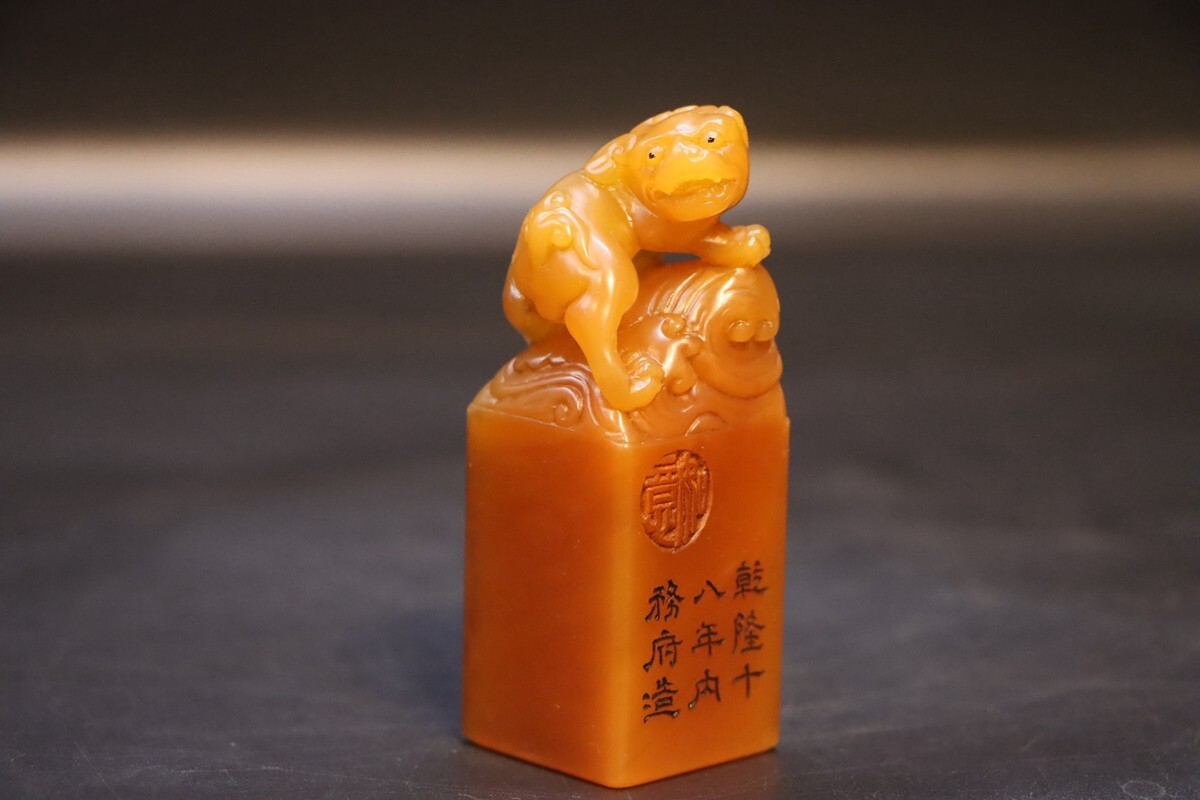 清代 乾隆十八年内務府造 老寿山石 田黄石彫 獣鈕印章【仁】極細工 手彫り 中国古賞物 古美術 蔵出