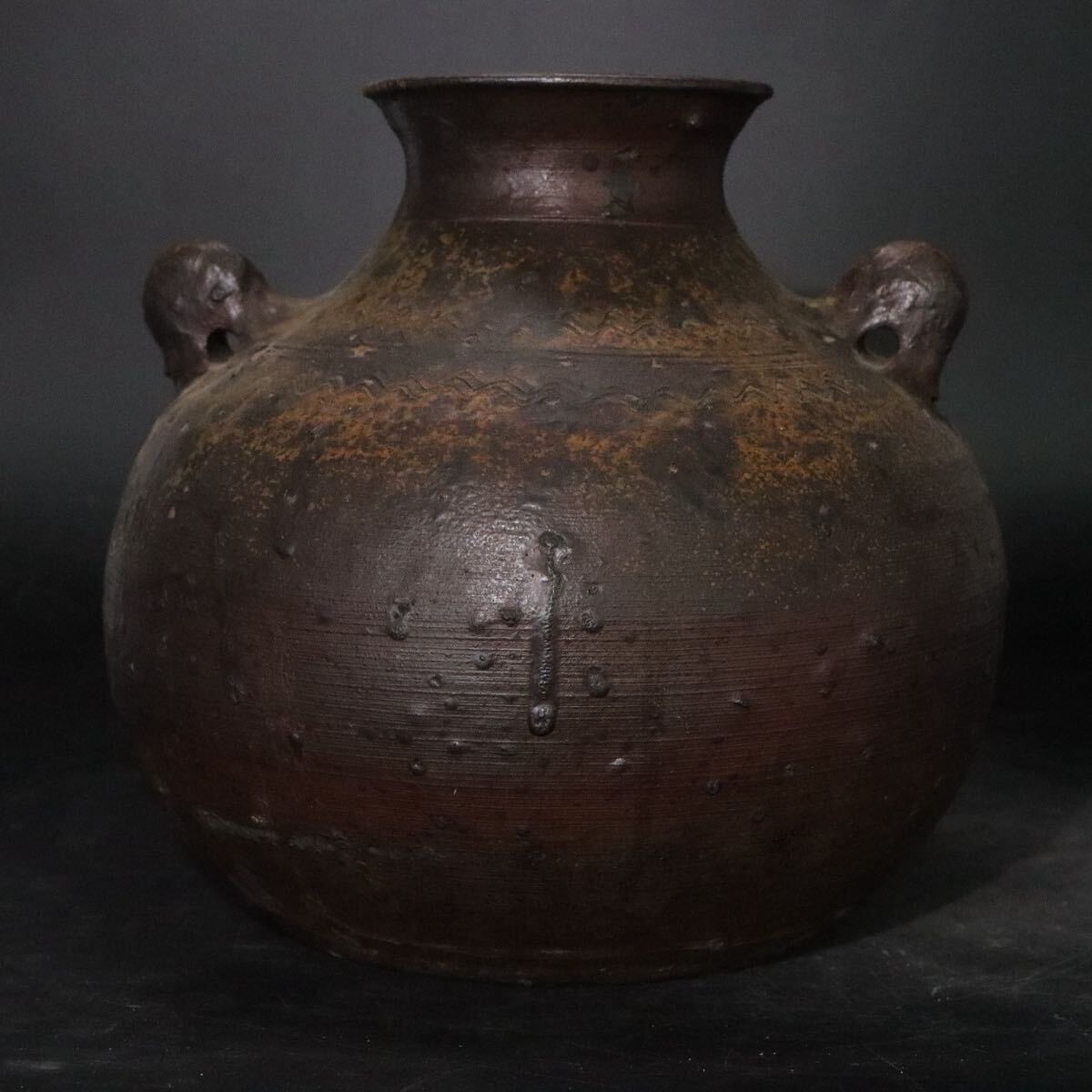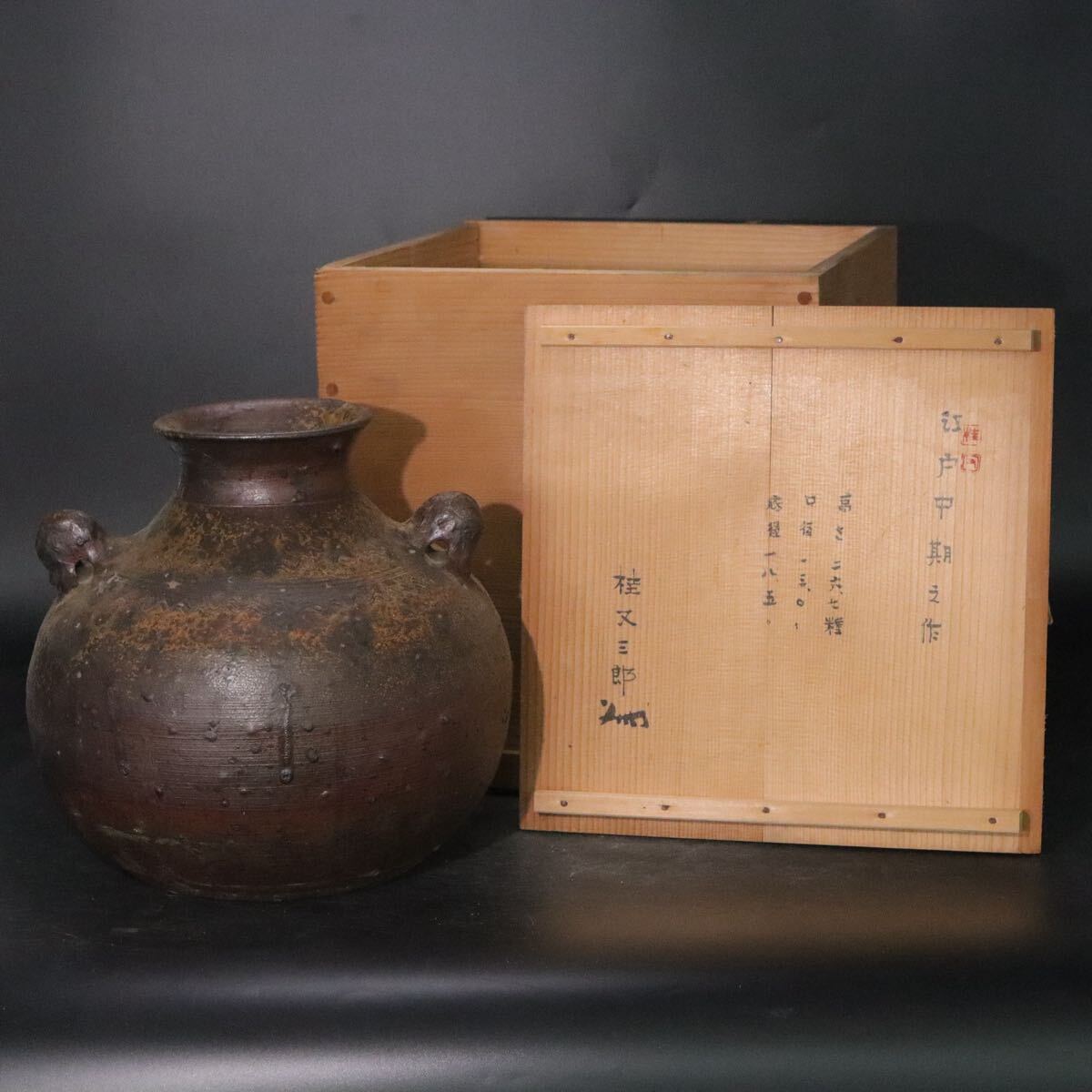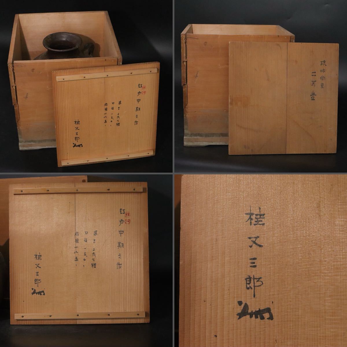 | 桂又三郎 識 「 琉球 南蛮 二耳 壺 江戸中期之作 」 識箱付 共箱 / 琉球焼 壺屋焼 南蛮 南蛮手 煎茶道具 花瓶 .B947 |