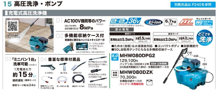 ●1充電使用時間(目安/BL1860B・2本使用時):標準モード(常用吐出圧5.5Mpa):約15分/静音モード(常用吐出圧3.0Mpa):約34分