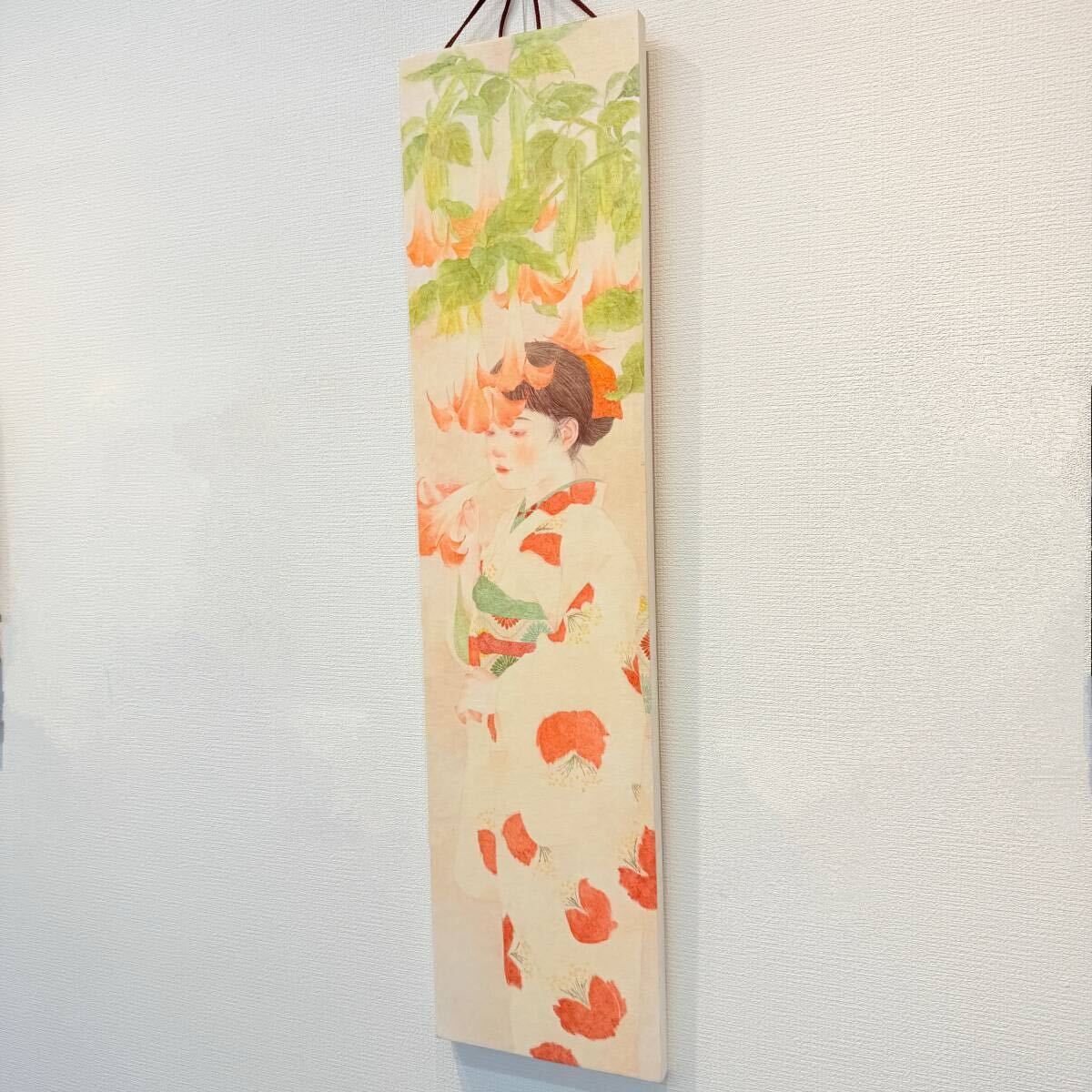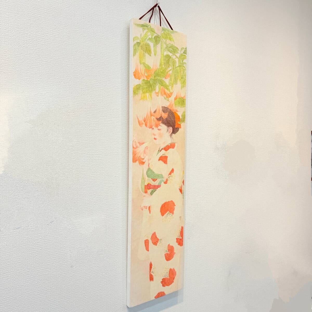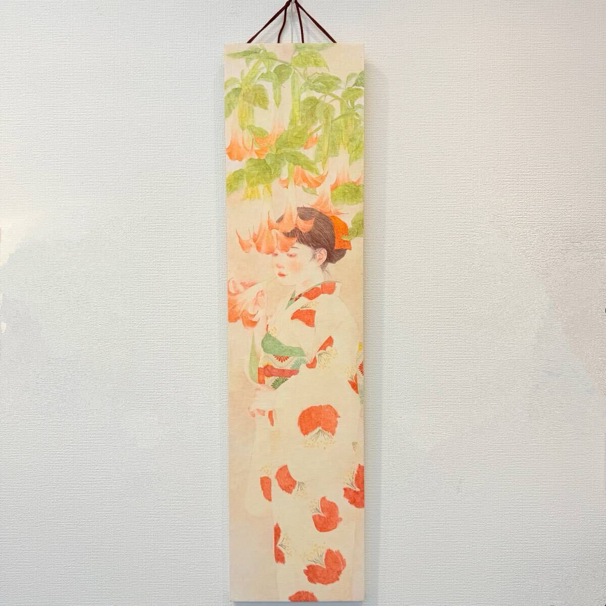 日本画のような油絵☆ 荒井かれん 『 露涼し 』 920×225㎜ 油彩 美人画 人物画 着物 銘仙 送料無料 真作保証 【創英ギャラリー】