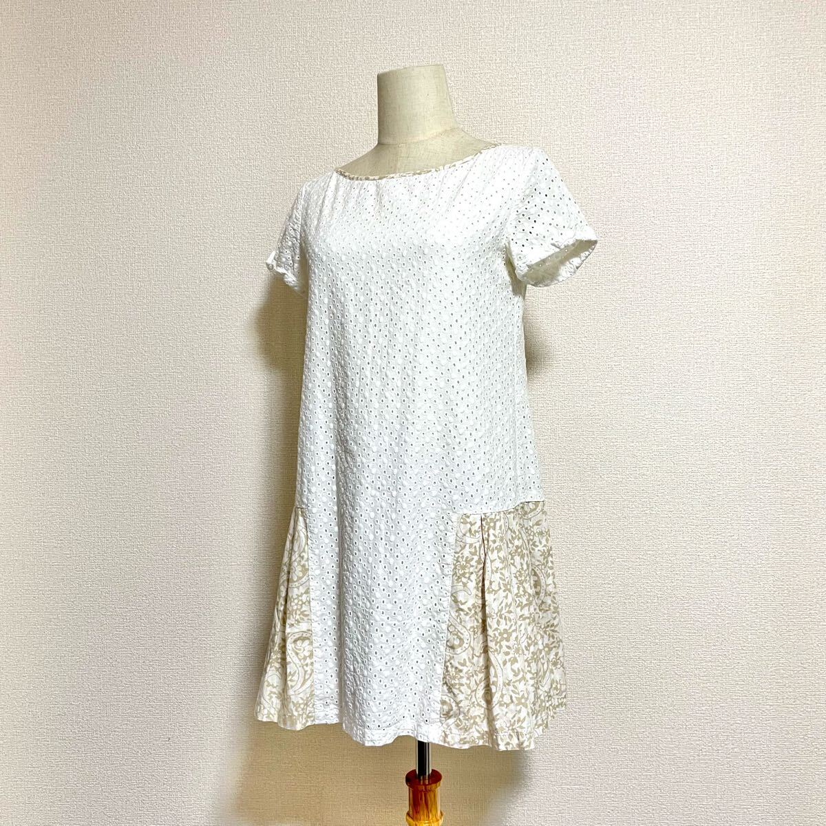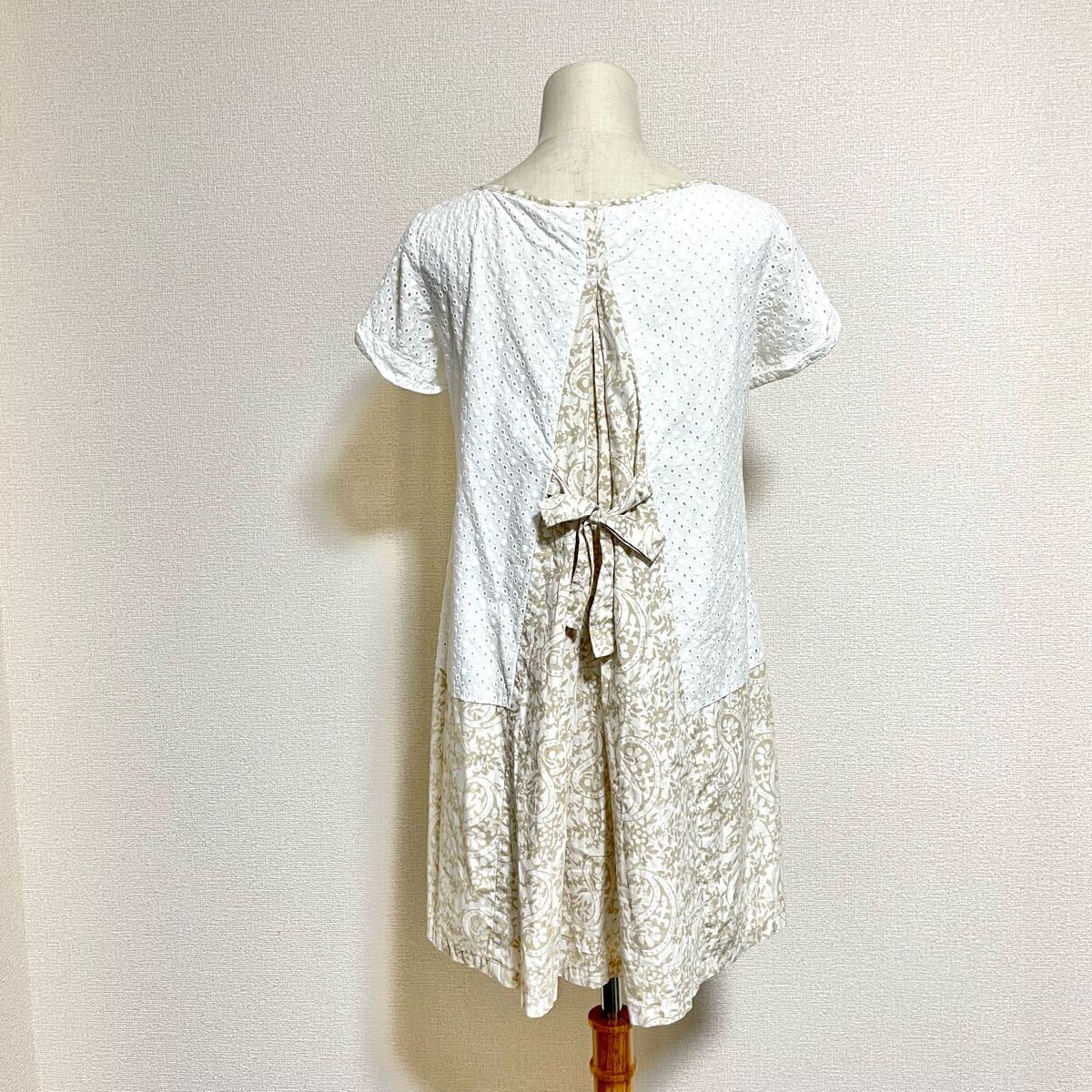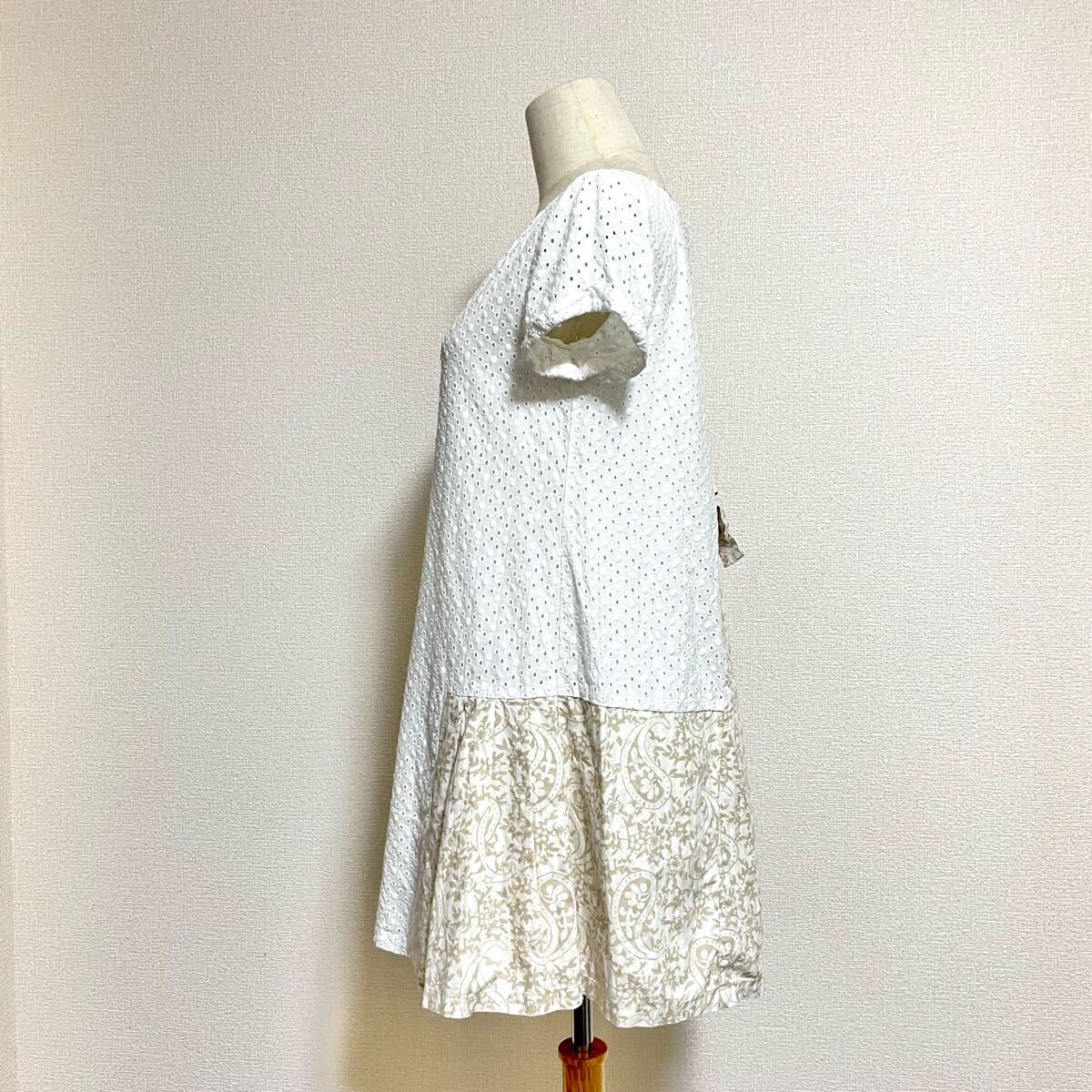カットワークレースとペイズリー柄の生地がドッキングされた異素材mixのチュニックです。