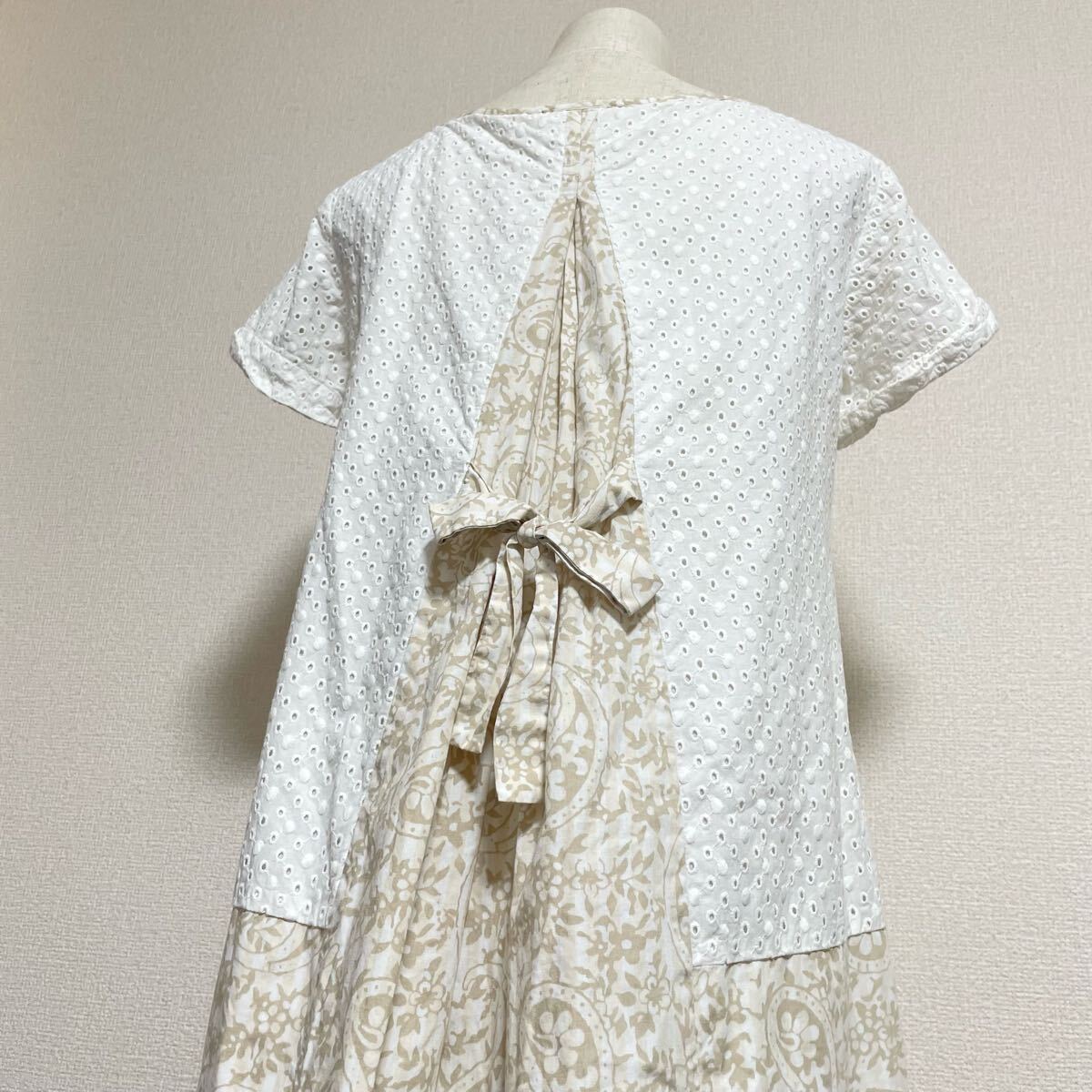 ペイズリー柄の生地はプリーツになっていたり、背中がリボンになっていたり可愛らしいデザインで、カットワークのレースが涼しげです。