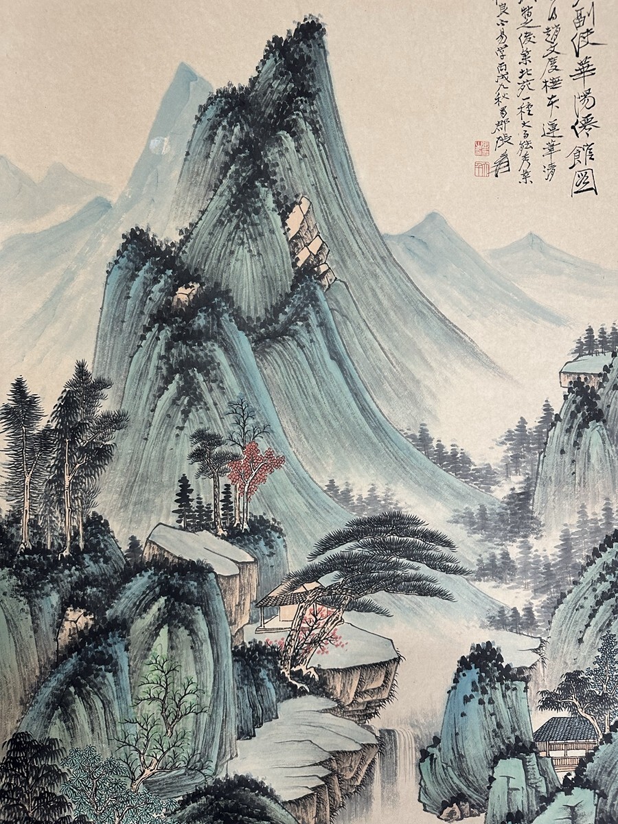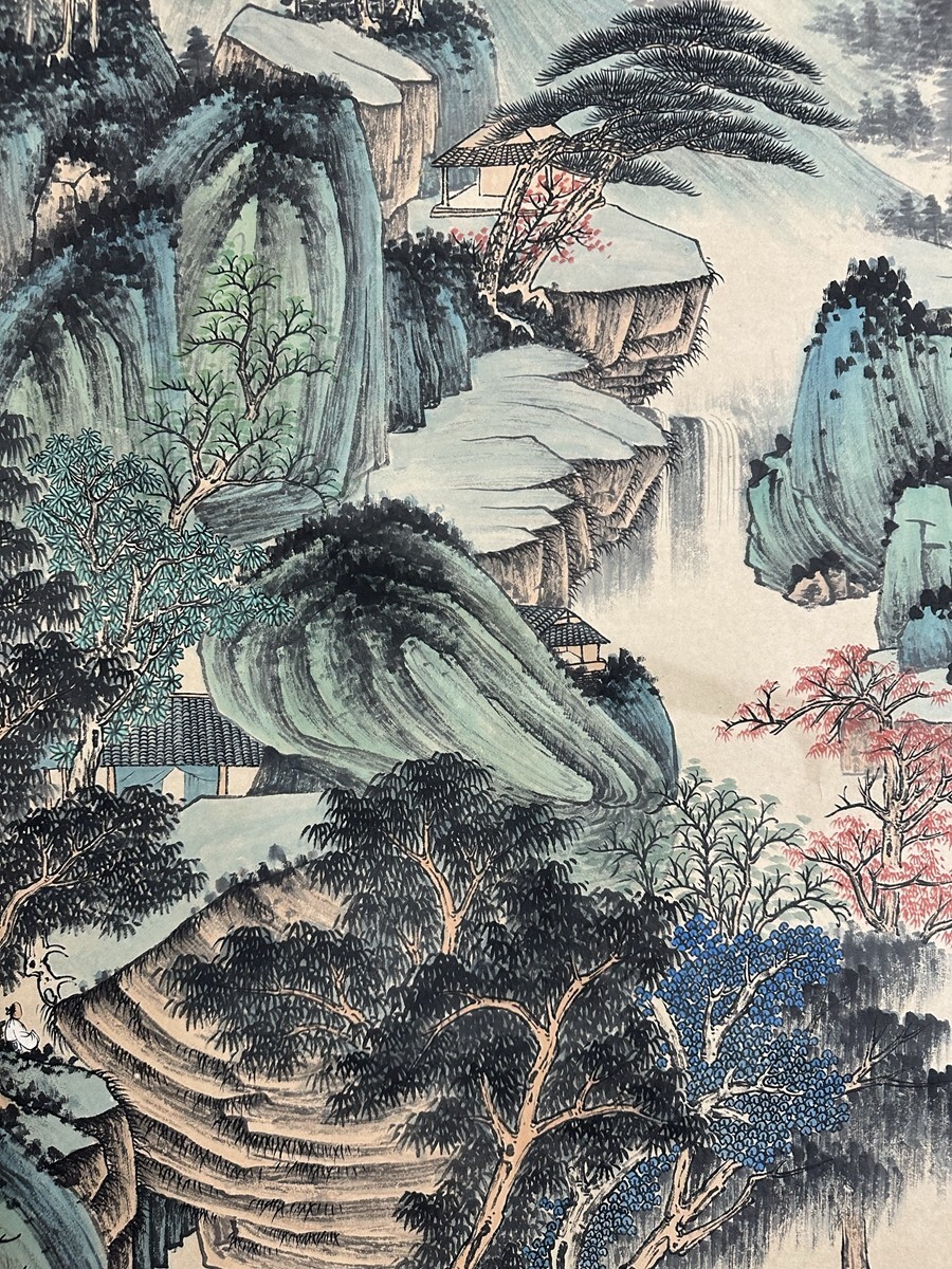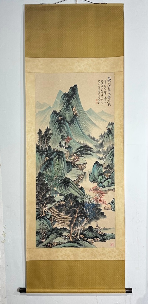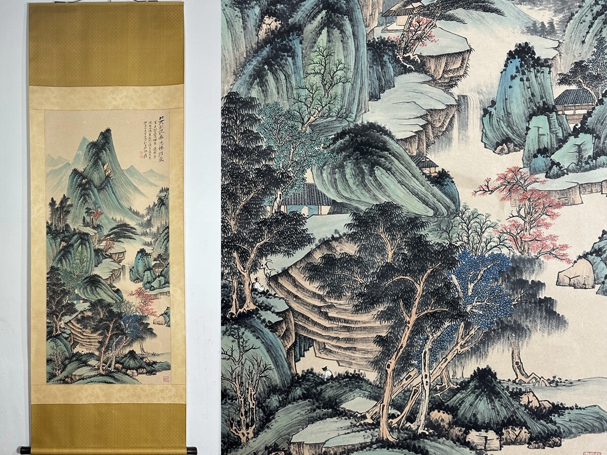 「張大千畫 北苑副使華陽仙館図」近代画家 肉筆紙本【仁】掛け軸 書画立軸 巻き物 中国書画 古美術 蔵出 畫芯約62×136cm