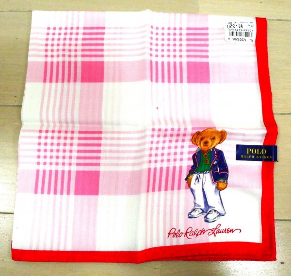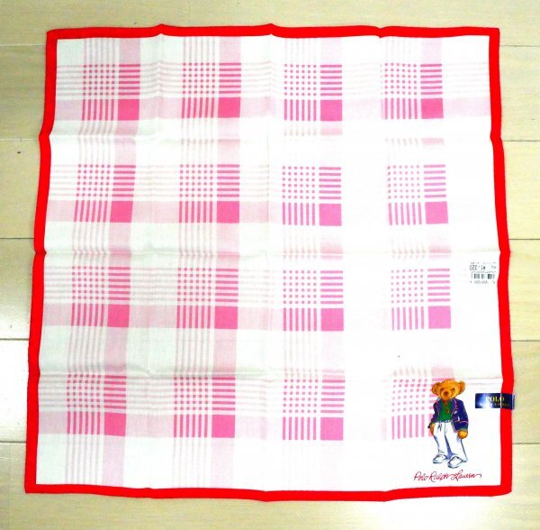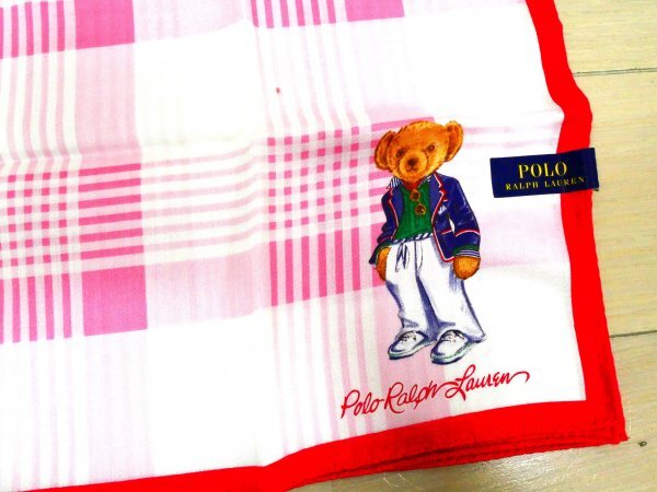未使用 POLO ポロ ラルフローレン ★ ラルフベア ・ ハンカチ ★ ホワイト・ピンク・チェック柄・ロゴ入り