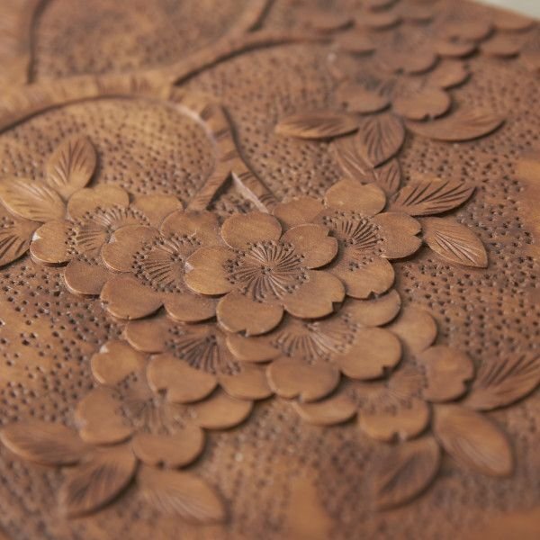 長野県北佐久郡軽井沢町の木工作品。明治19年、英国人宣教師アレキサンダー・クロフトショー氏を初めとして多くの外国人宣教師・外交官が軽井沢を避暑地として別荘を建てました。その頃、最も華麗な木彫細工の1つを作っていた日光の木彫り職人たちが軽井沢に呼ばれ、製作した家具が現在の軽井沢彫の原型になります。桜の繊細な絵柄が多く、模様の周りに細かな点を打って立体的に表現する「星打ち」も特徴的。その技法は軽井沢彫りとして長野県伝統工芸品の指定を受け代々引き継がれています。