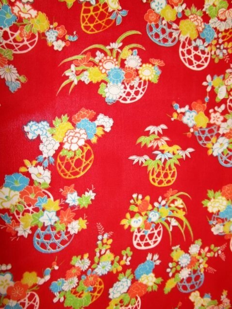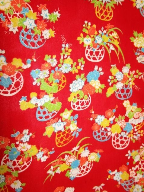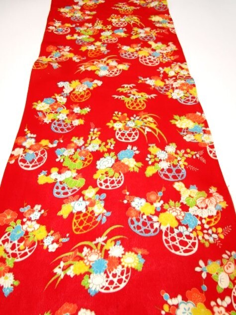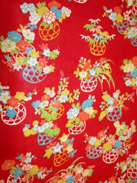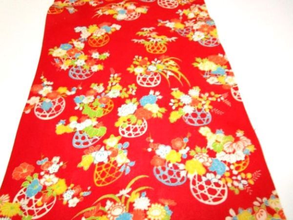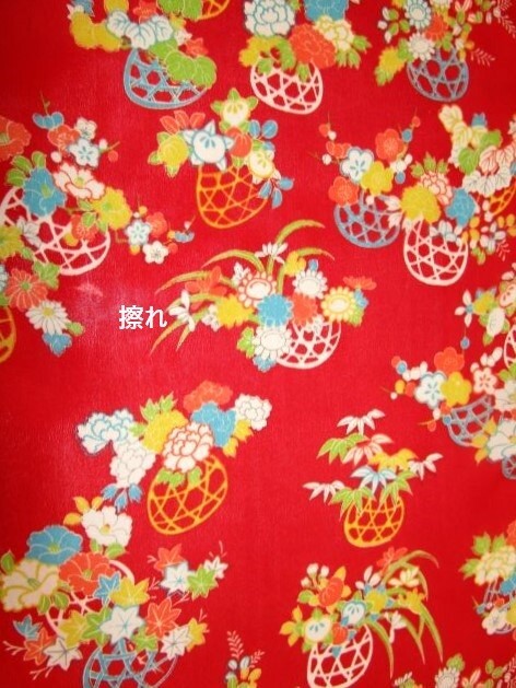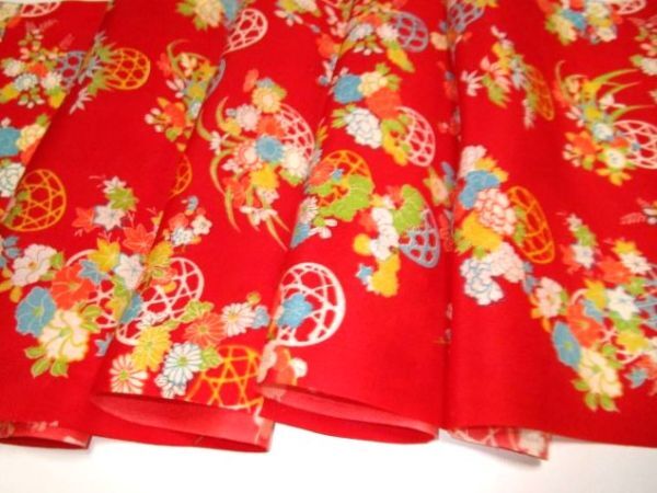 E-128★赤地*花籠*牡丹*菊*梅*桐*吉祥模様*正絹*古布はぎれ★文化人形/一閑張り/吊るし雛/市松人形
