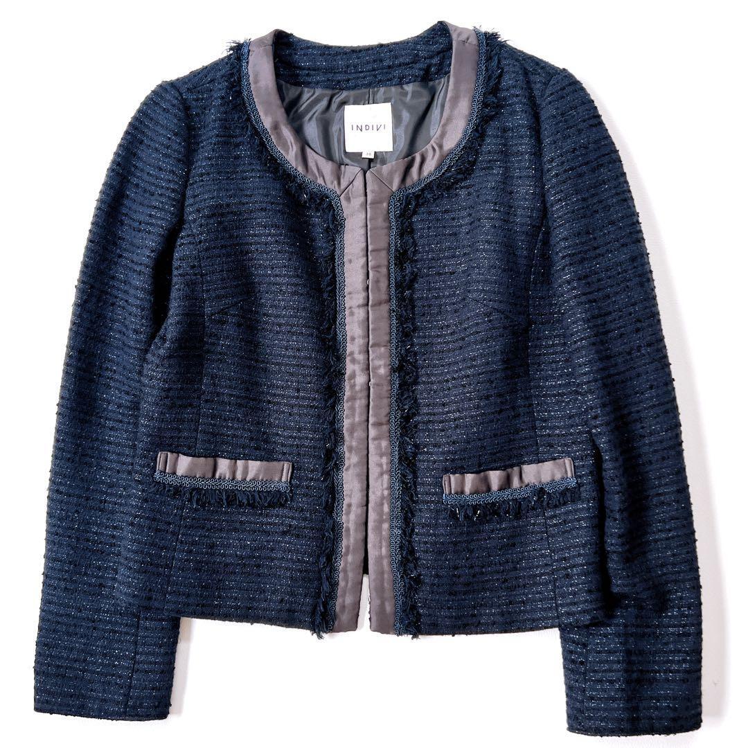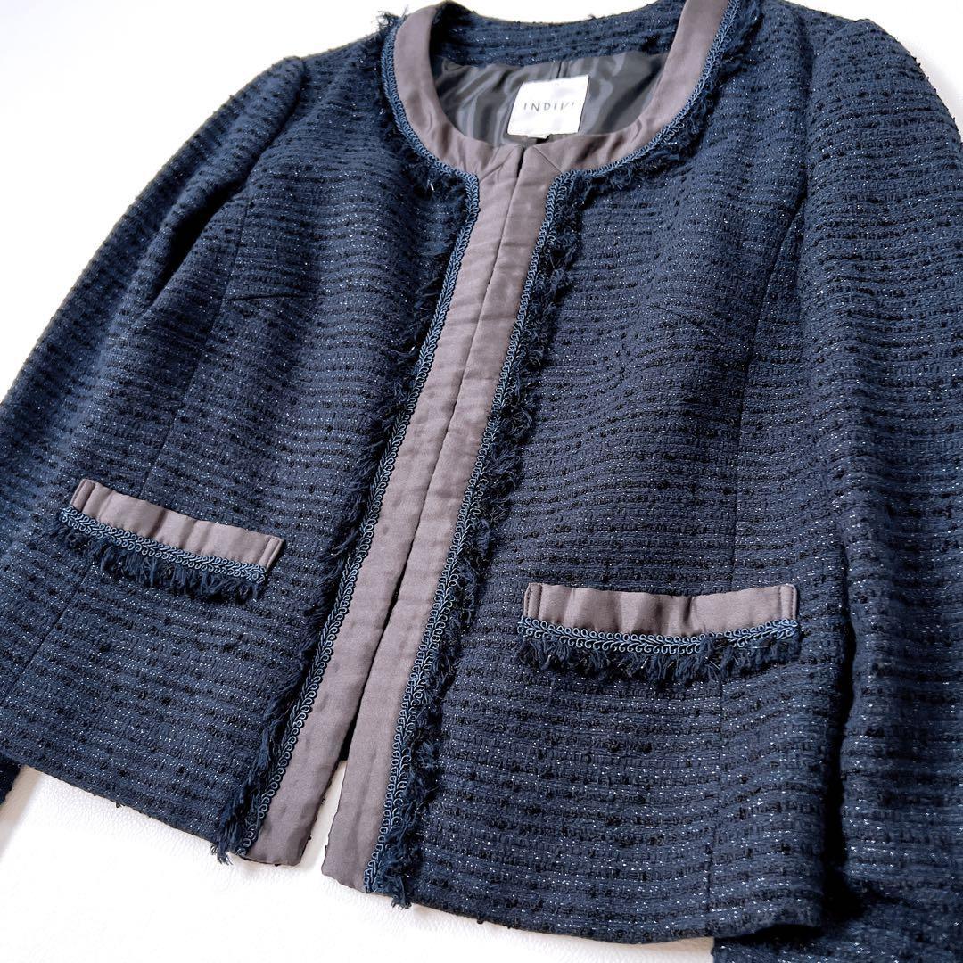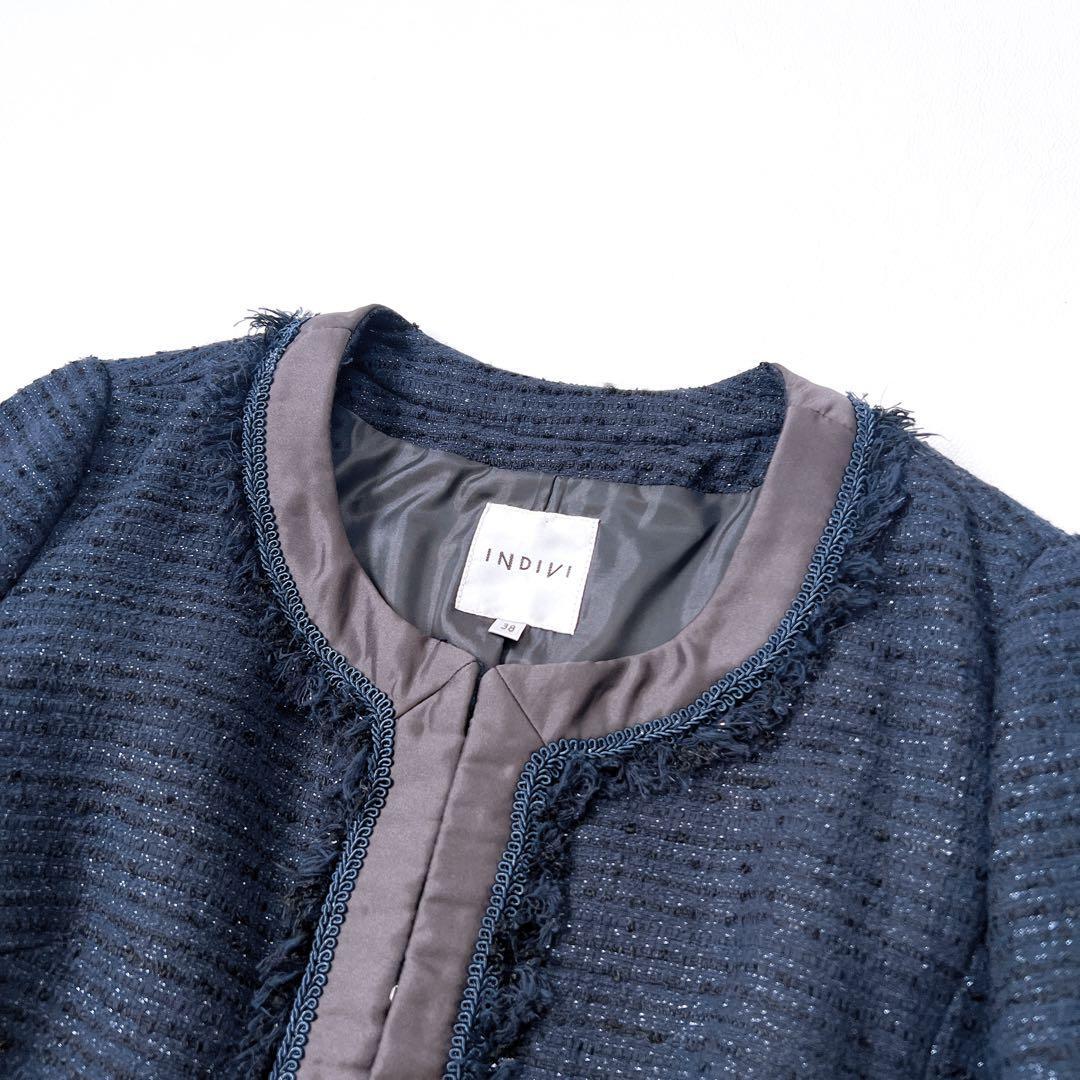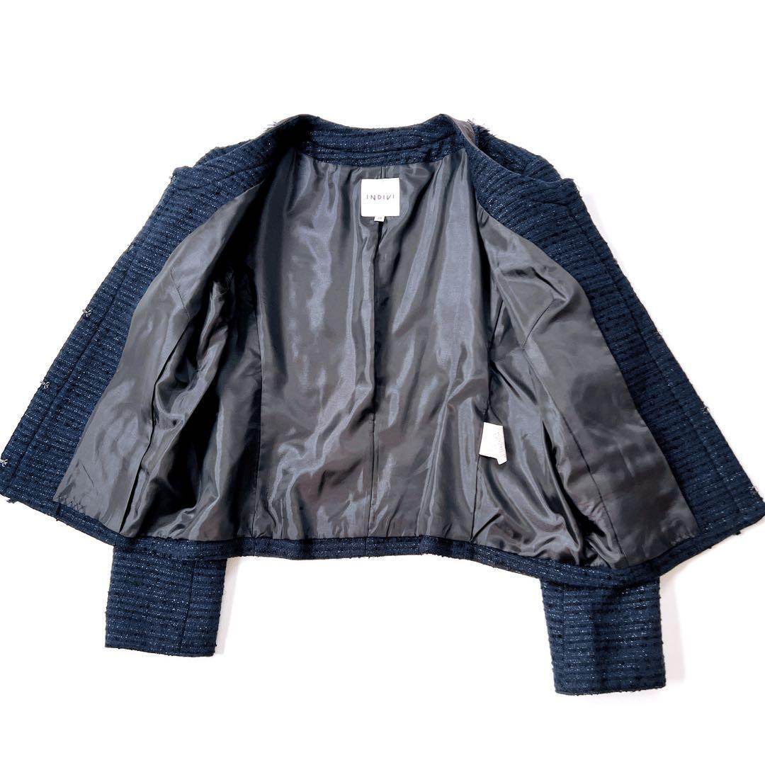 【美品】インディヴィ ラメツイード セレモニー ノーカラージャケット 紺 38