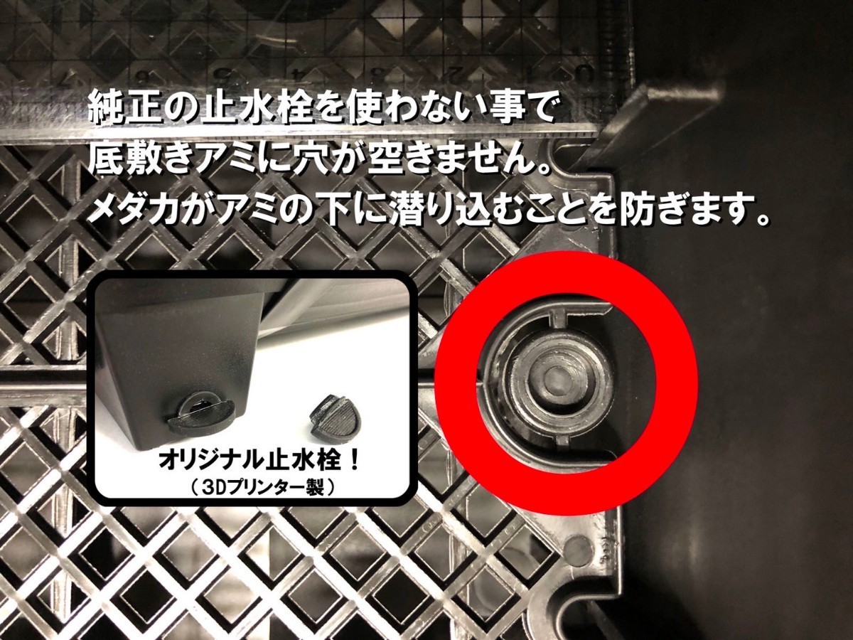 ●排水バルブは保水量18L~20Lを超えた辺りに取り付けています。親メダカも飛び出さないようにマージンは上部から2~3cmは取ってあります。