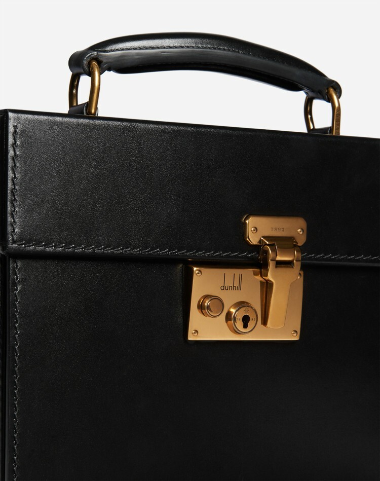 インクブルーのレザーを使用したダンヒルの新アイコン「ロックバッグ」。ダンヒルのアーカイブから、1960年代に発表したモートリティーズのアタッシュケースに着想を得ました。ADブラスのロックメガニズムを採用し、着脱可能なショルダーストラップ、マチ付きのメイン収納、2つのカードスロットを備えます。