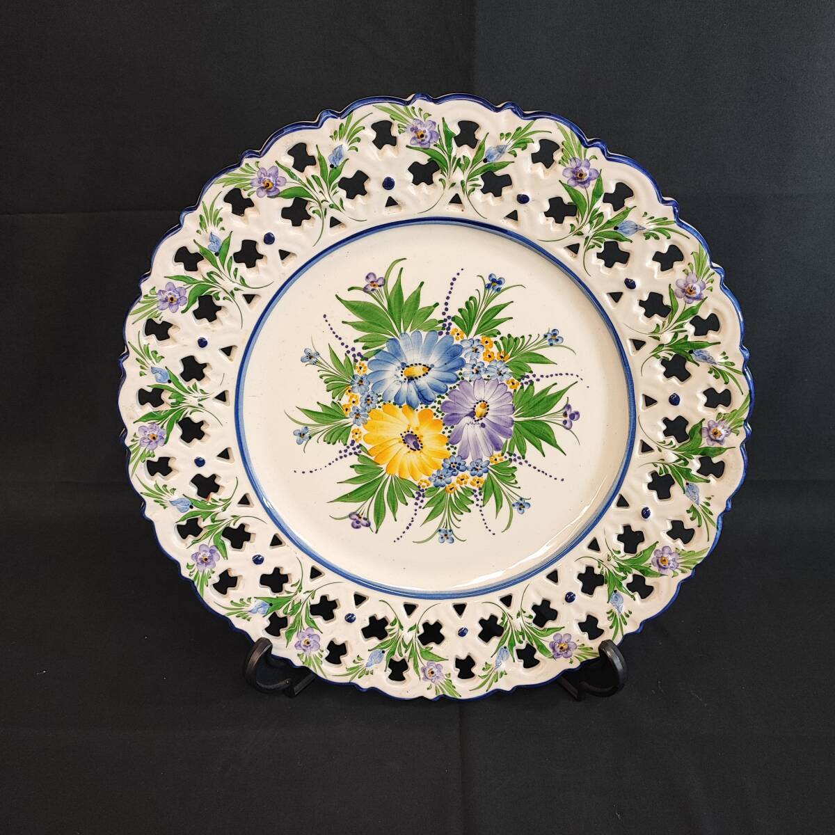 RCCL ポルトガル製のハンドペイントプレートです。透かし彫りが施された縁取りと、中央に描かれたカラフルな花模様が特徴的な逸品です。手作業による絵付けならではの温かみが感じられ、食卓はもちろん、壁掛けやインテリアとしても映えるデザインです。アンティーク・ビンテージ好きやコレクターの方にもおすすめです。ポルトガル陶器ならではの鮮やかな彩色と繊細な造形美をぜひお楽しみください。